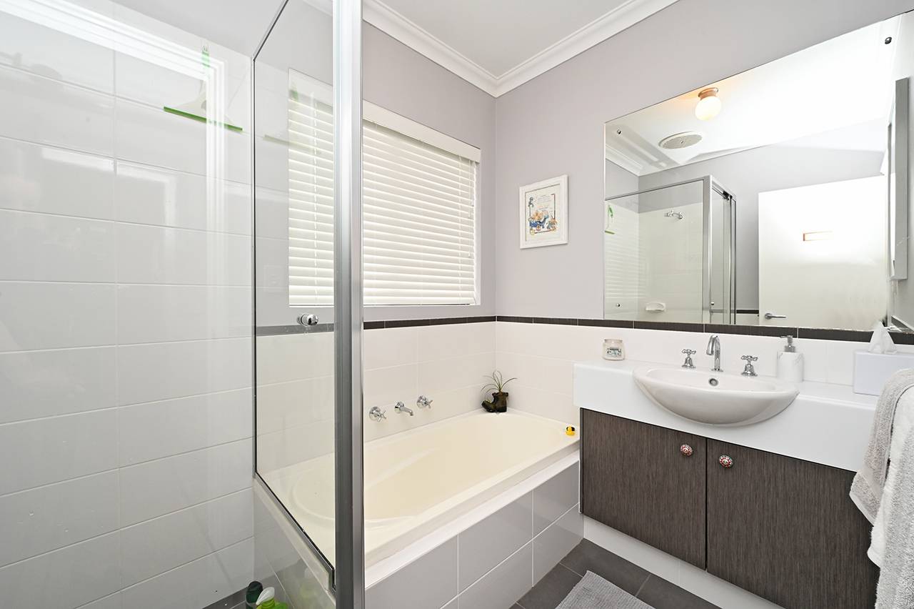 Modern 2nd bathroom with bath, vanity and mirror, shower with glass screen and stylish fixtures and fittings