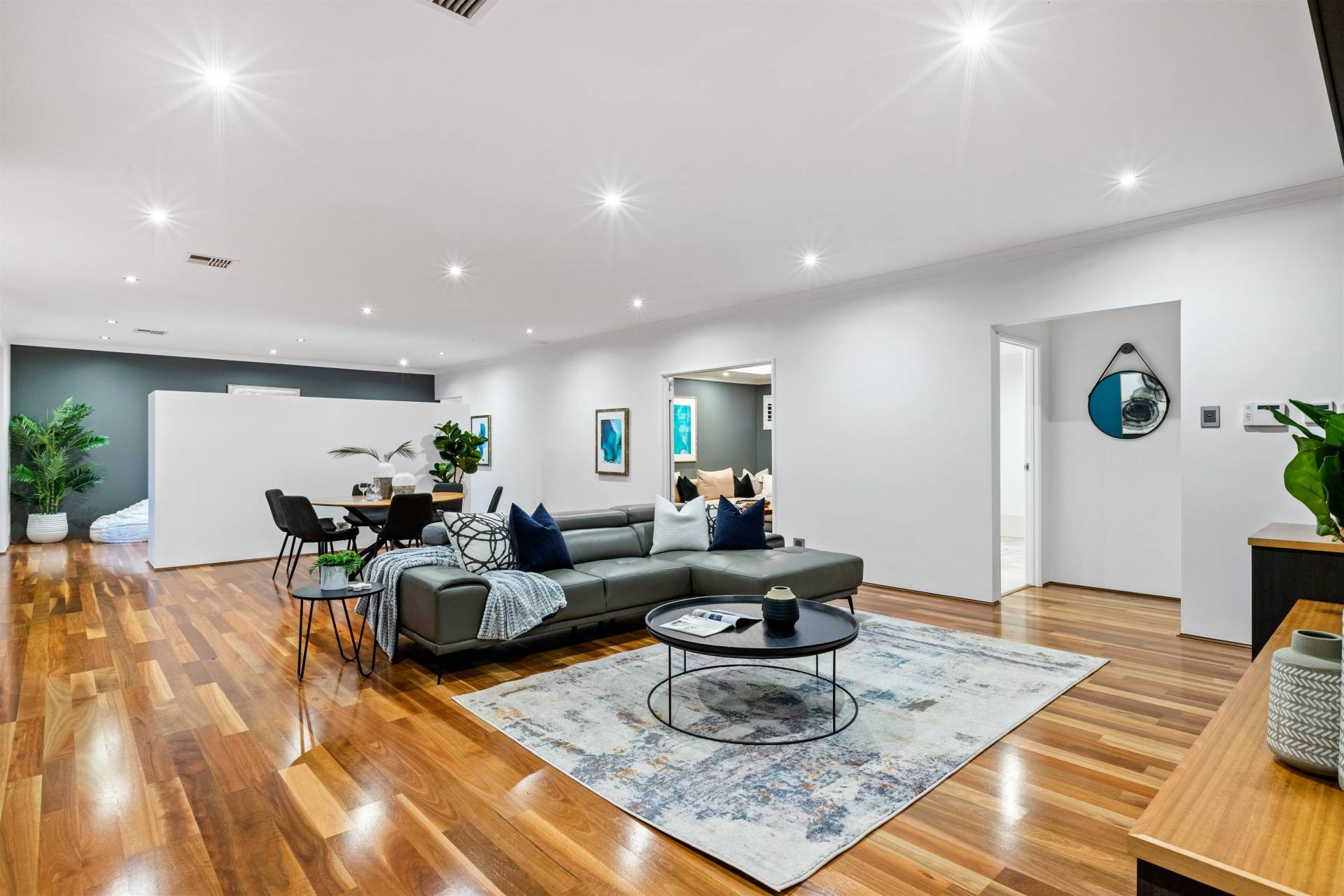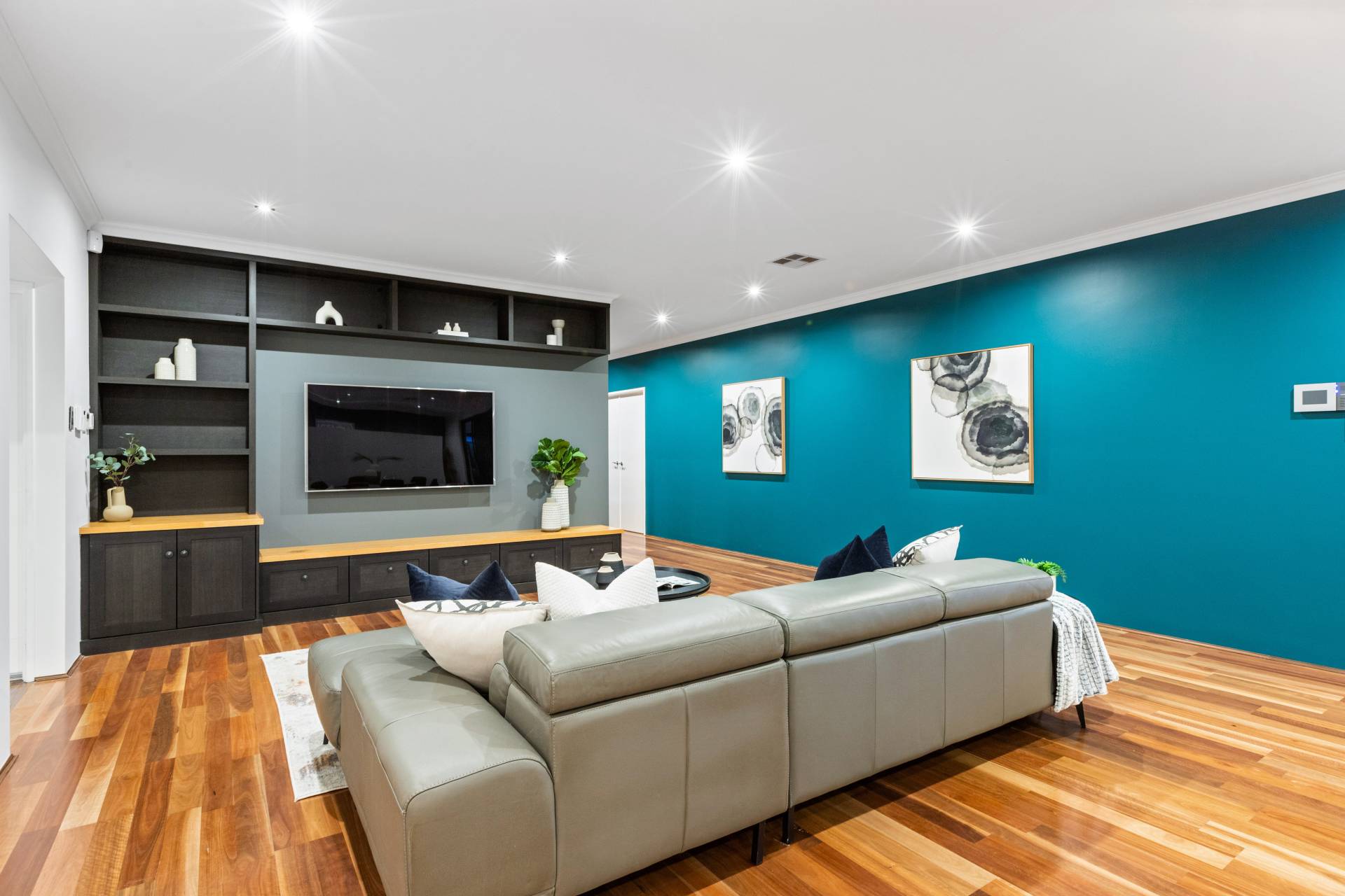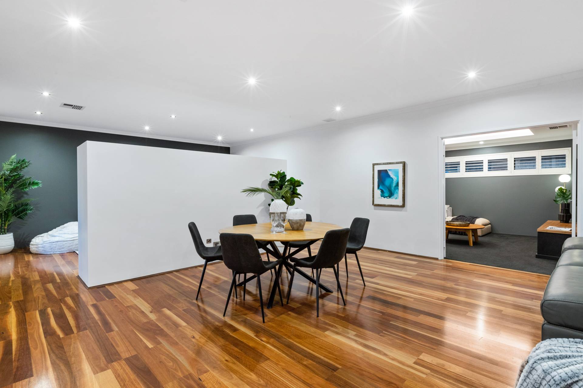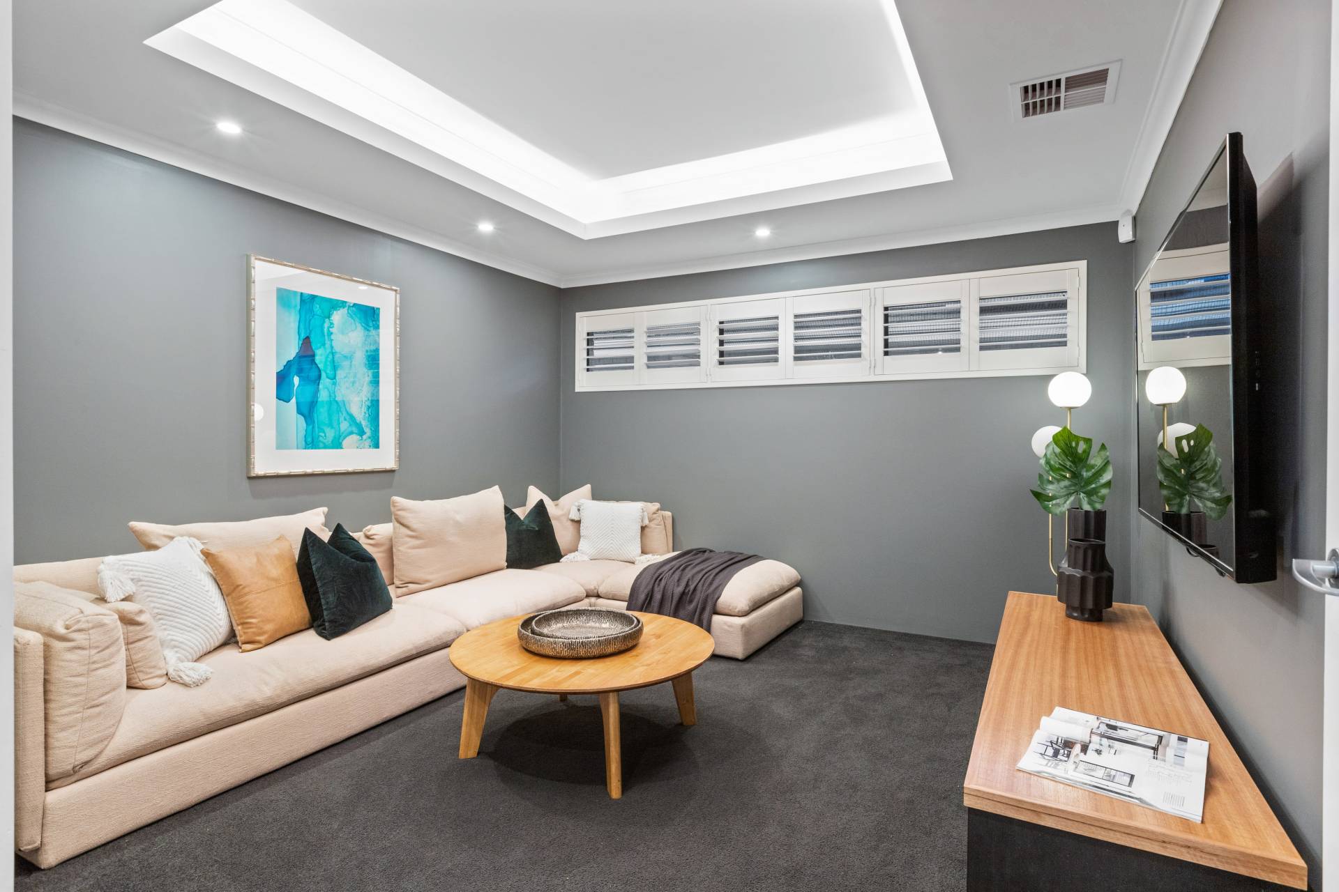 Continue to the heart of the home, where the spacious open-plan living area unfolds. A clever plinth wall creates a separate space for a games room, or kids activity space while maintaining the flow of the layout. Adjacent, a double-door theatre room, marked by a recessed ceiling and highlight windows, promises countless nights of entertainment. This home also has a spacious spare room (with plumbing) that has side-of-house gated access perfect for a small home business.