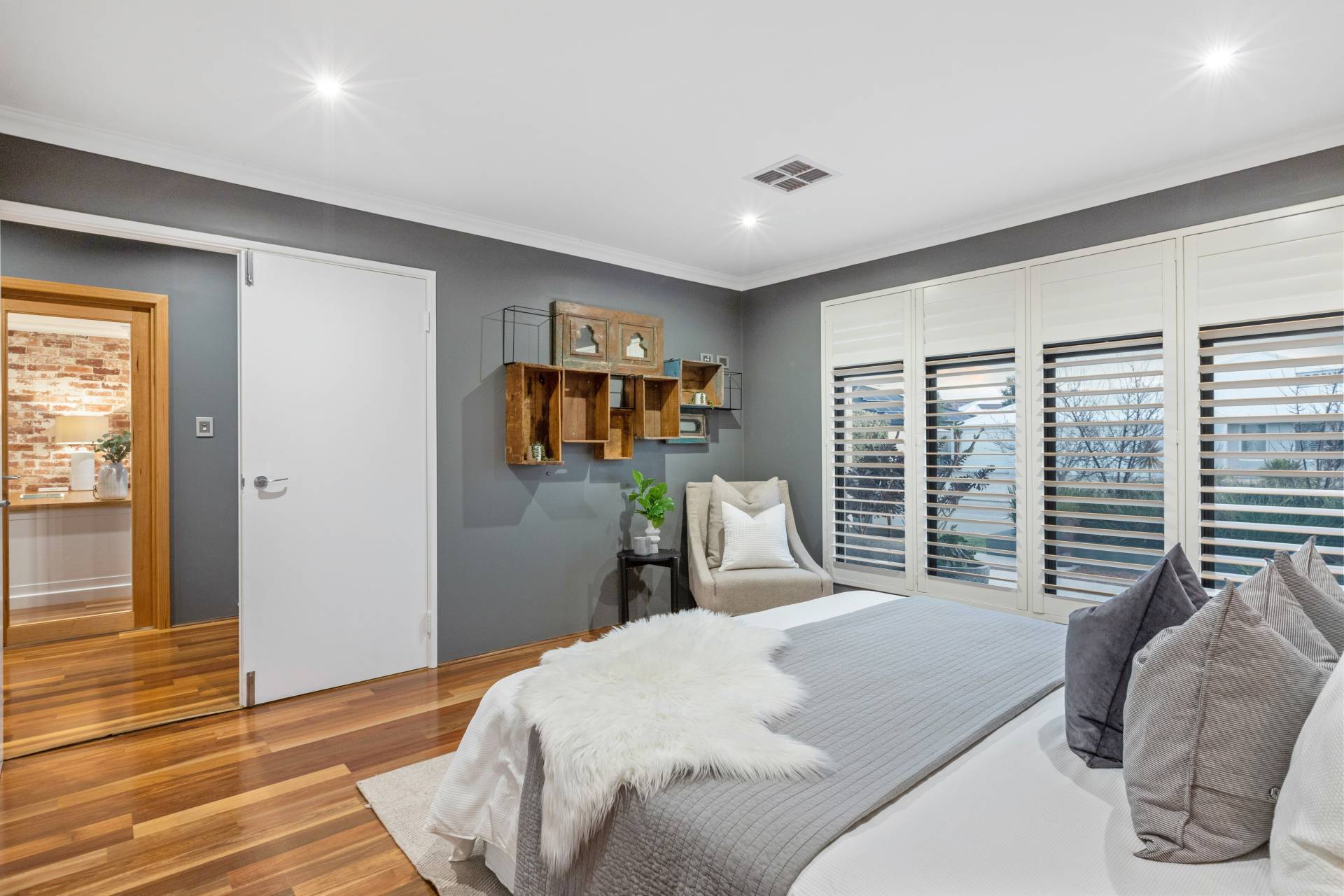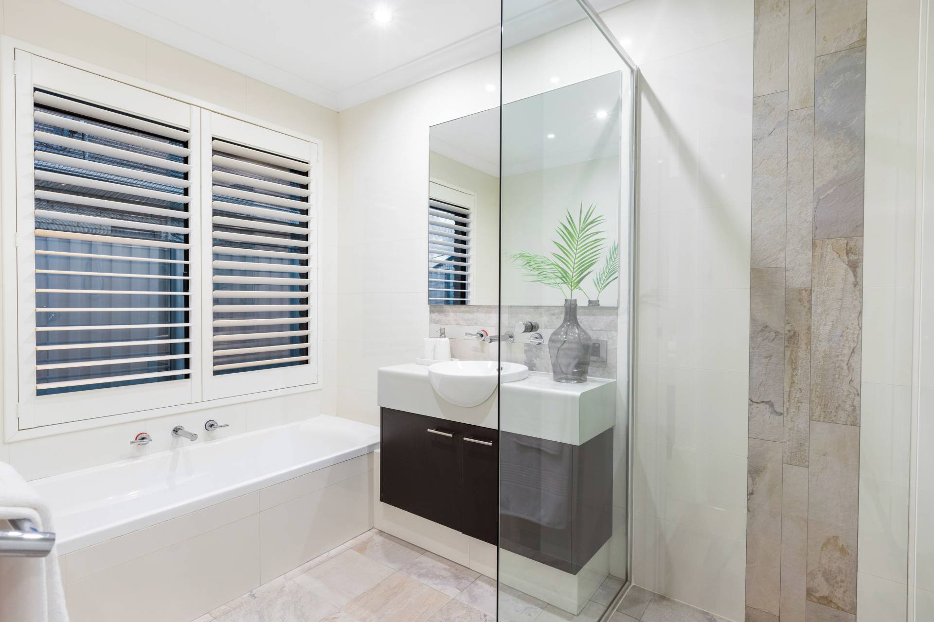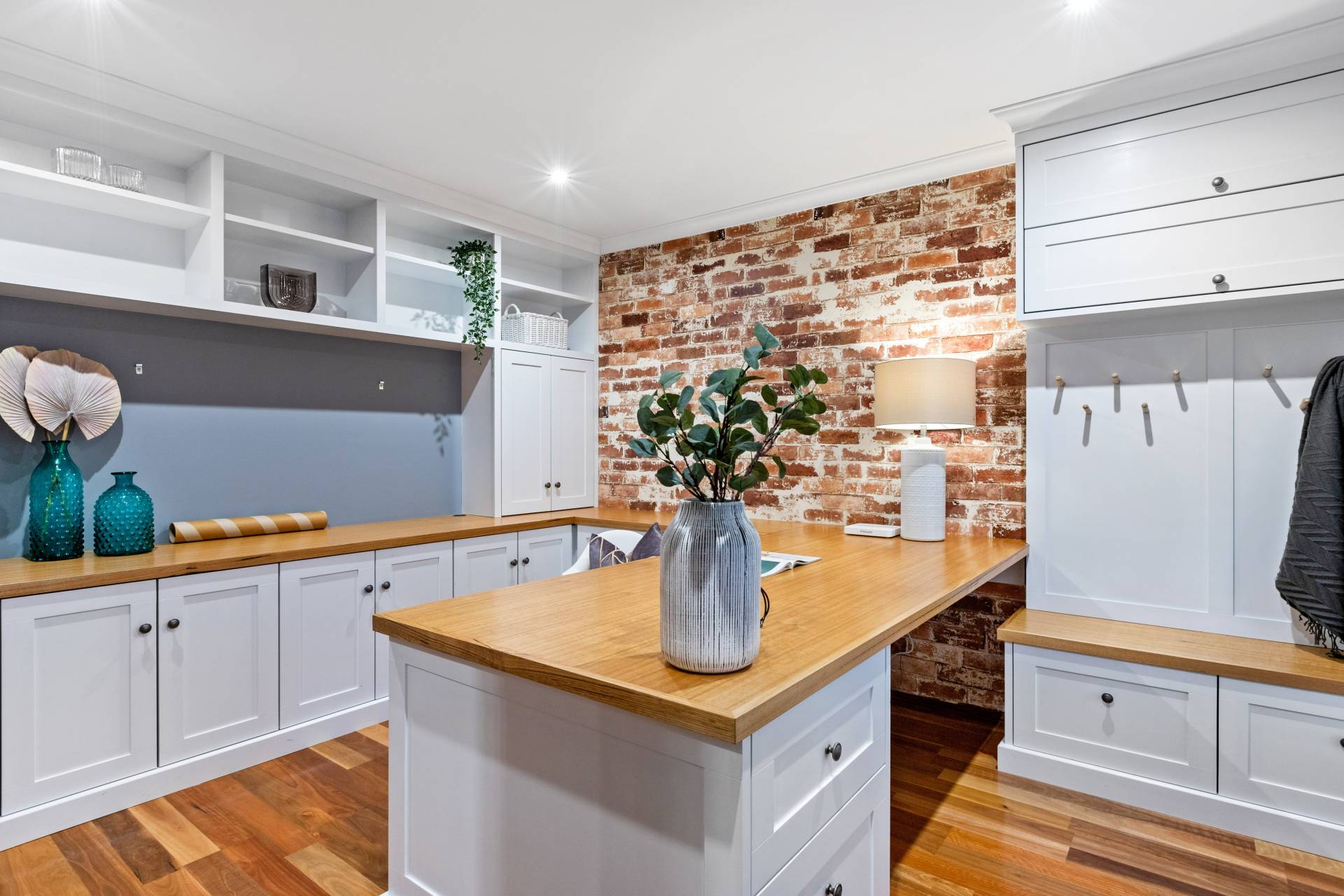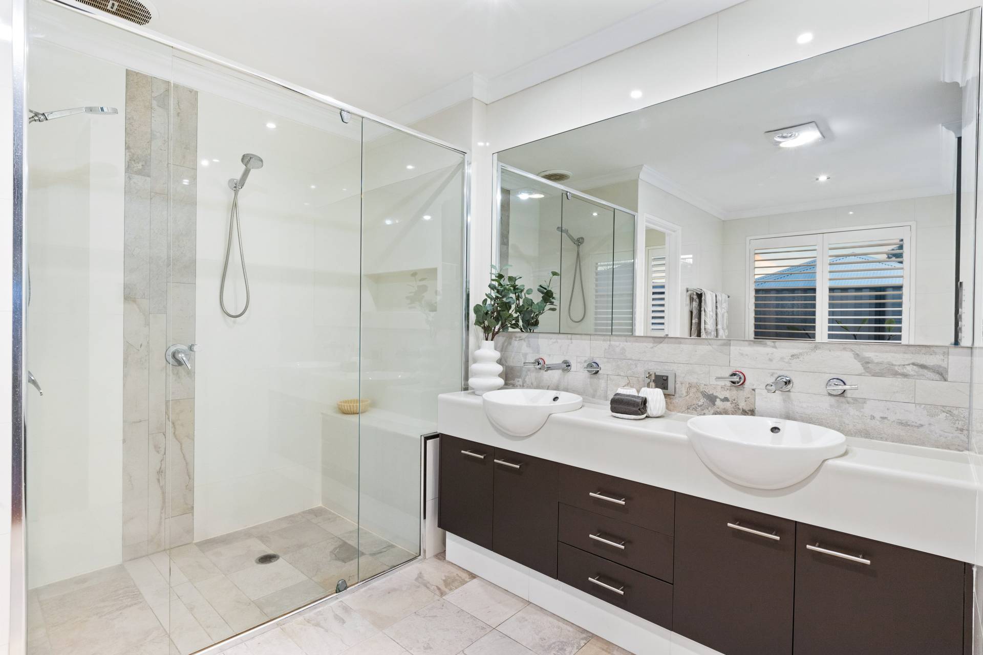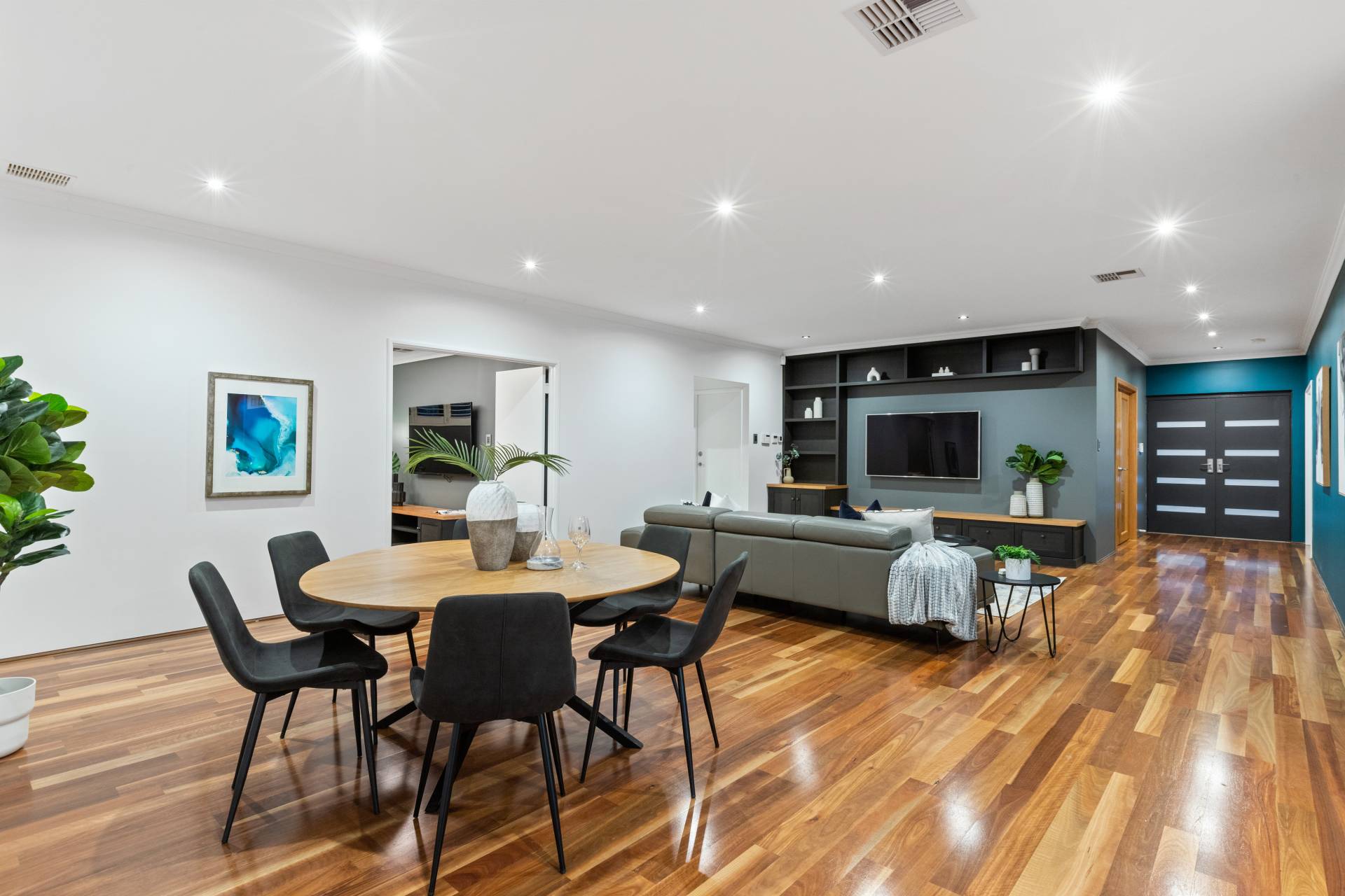 Upon entering, you're met with the warmth of solid Spotted Gum flooring and to your right, a roomy and stylish study boasting a built-in double-sided desk and cabinetry with plentiful storage space. The main bedroom, also located by the entrance, is an adults' retreat with a customised walk-through of his and her's robes, a fully-tiled ensuite with twin vanities, a double semi-frameless shower, a separate WC, and an indulgent spa bath. Three generous junior bedrooms with built-in robes and shutters ensure plenty of space for the entire family, sharing the well-appointed family bathroom with a separate WC and basin, providing added convenience and privacy.