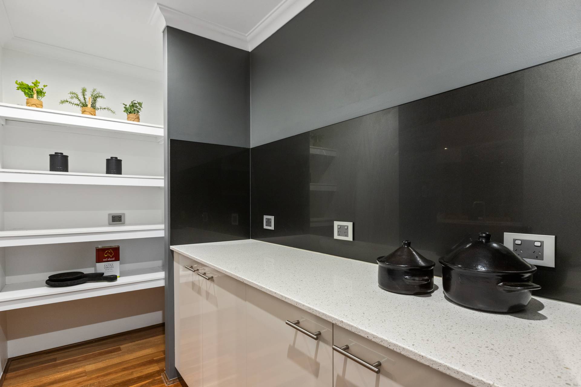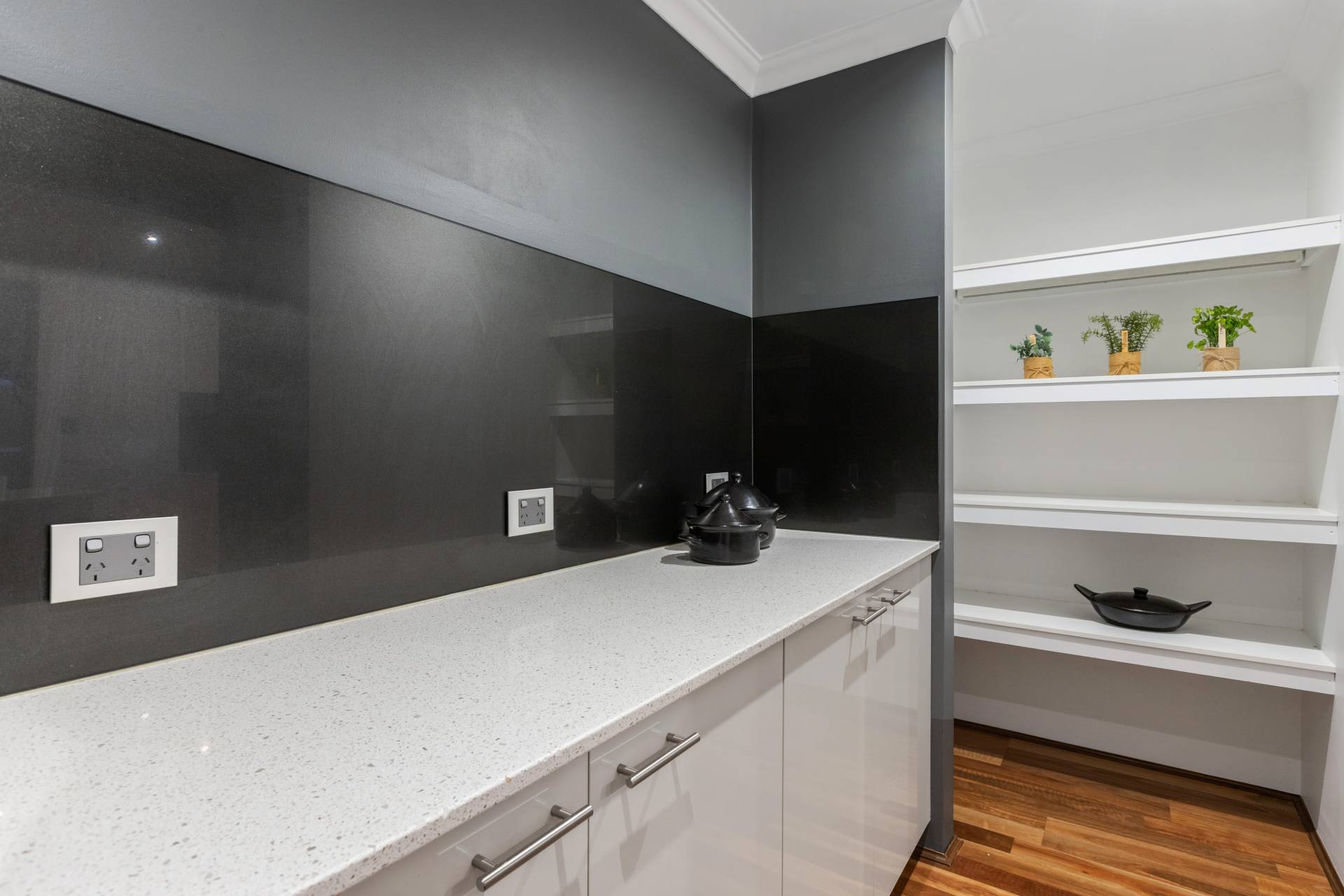 The deluxe gourmet kitchen showcases an island breakfast bar, stone benchtops, stainless steel appliances, and an ASKO dishwasher for easy clean-ups. A large walk-in scullery with additional stone benchtop space and under-bench cupboards with abundant shelving on both sides of the pantry provides ample storage, enhancing the functionality of the space. Seamlessly extend your living outdoors, stepping onto a generous alfresco under the main roof.