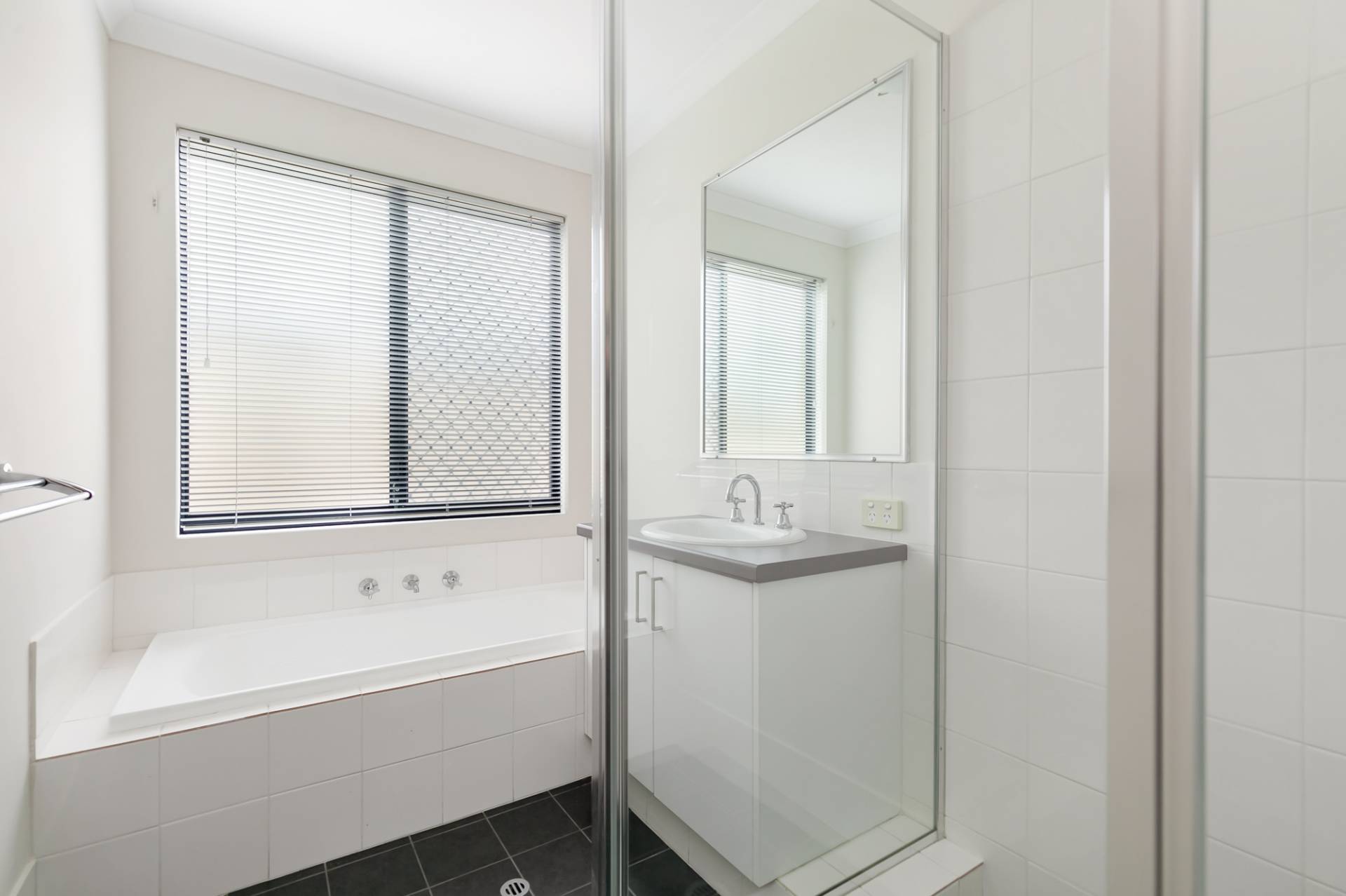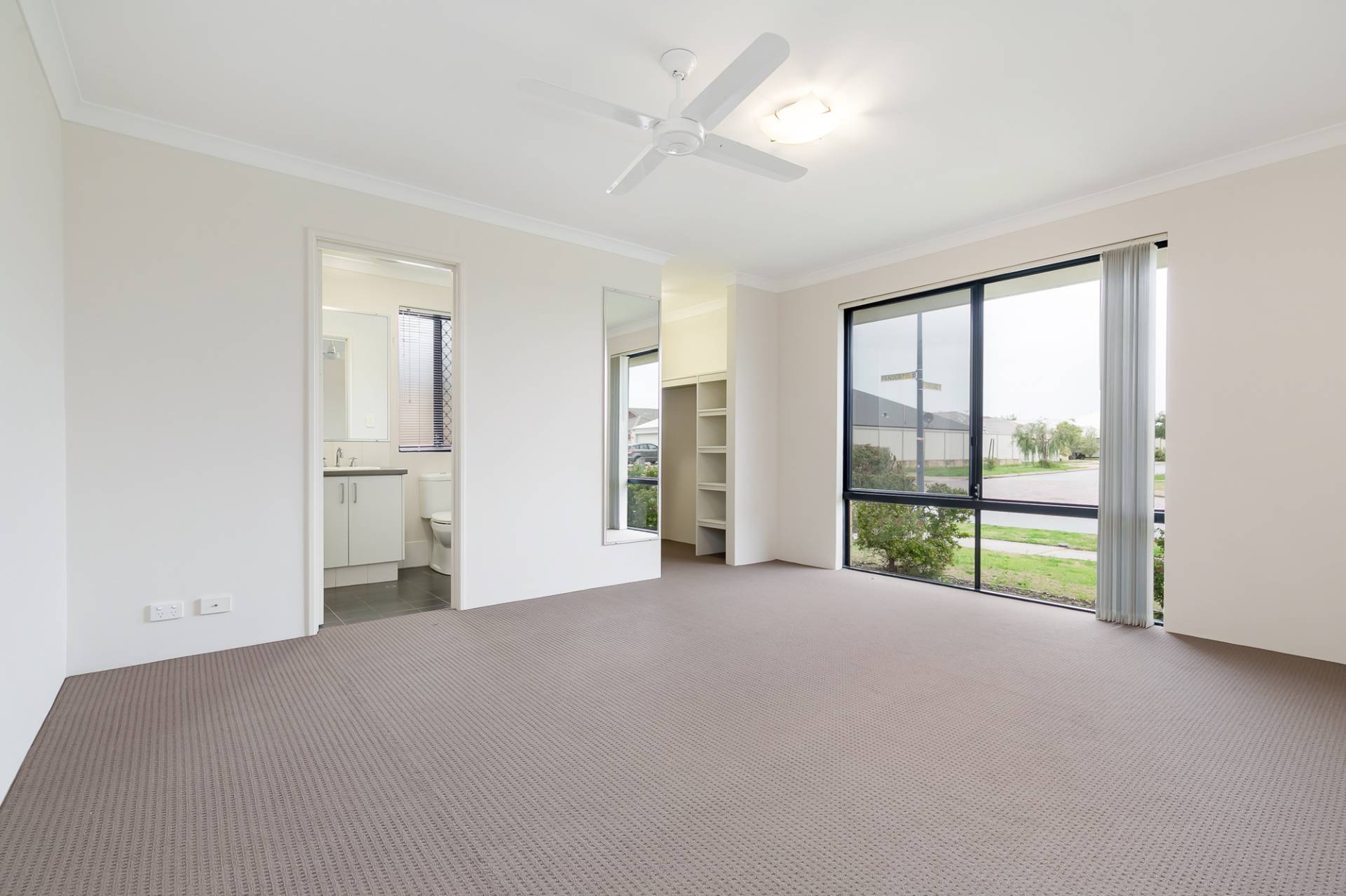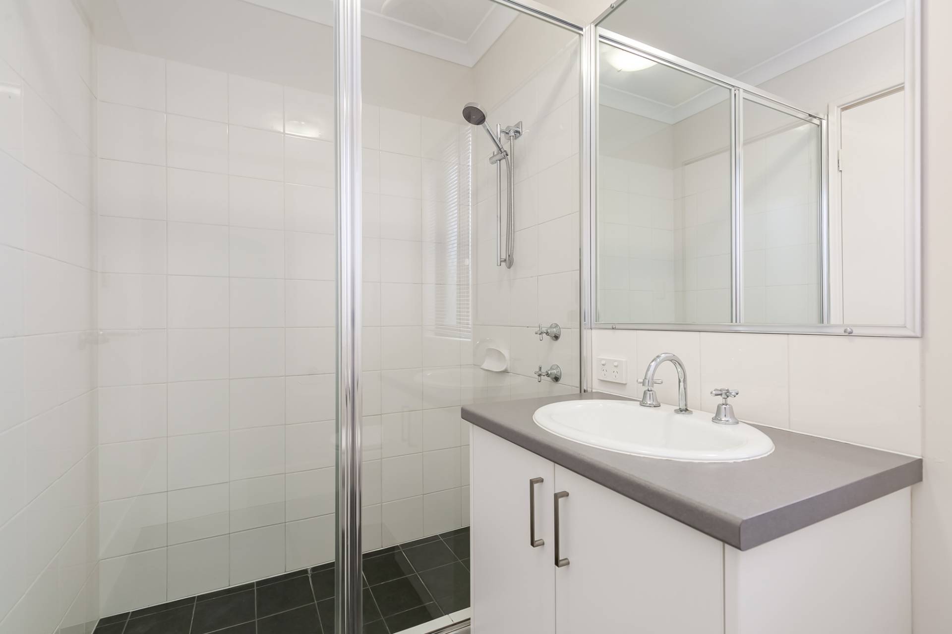 The master bedroom offers ample space, with a walk-in robe, ceiling fan, and an ensuite bathroom featuring shower, single basin with under bench storage, and a separate toilet.
