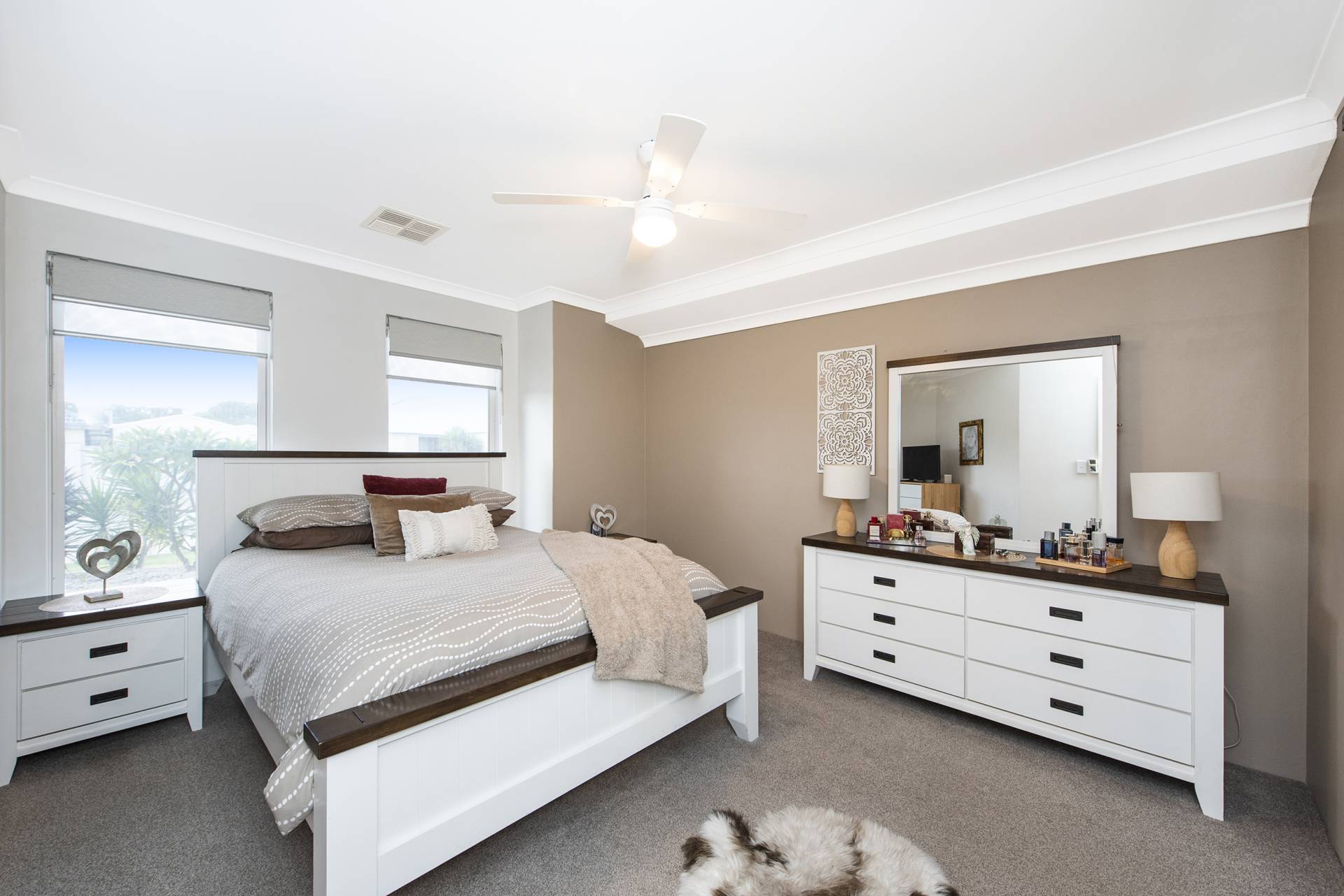 The contemporary master bedroom is spacious in size with walk in robe, ceiling fan and ensuite with bespoke barn door, shower, single basin with under bench storage and a separate toilet.