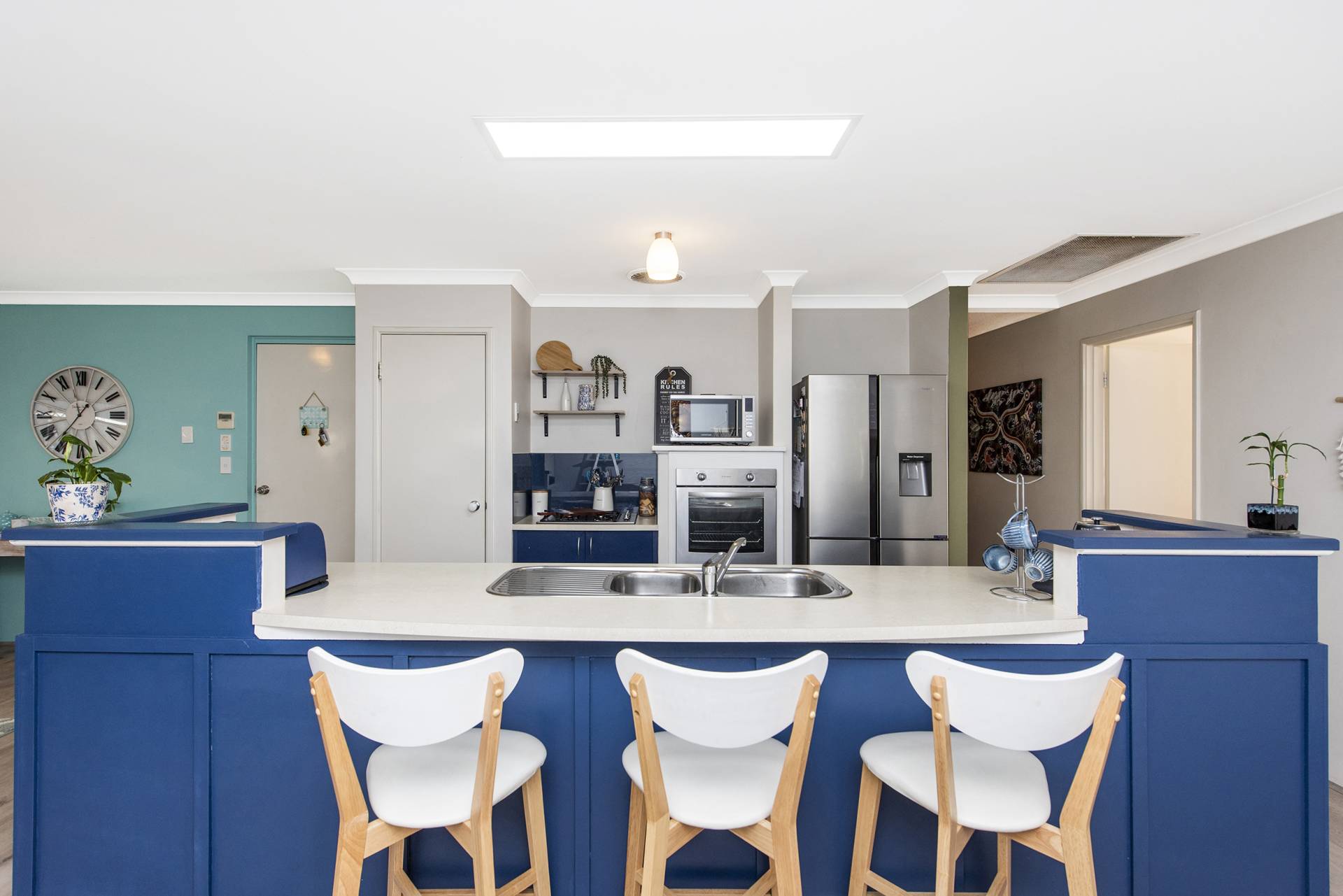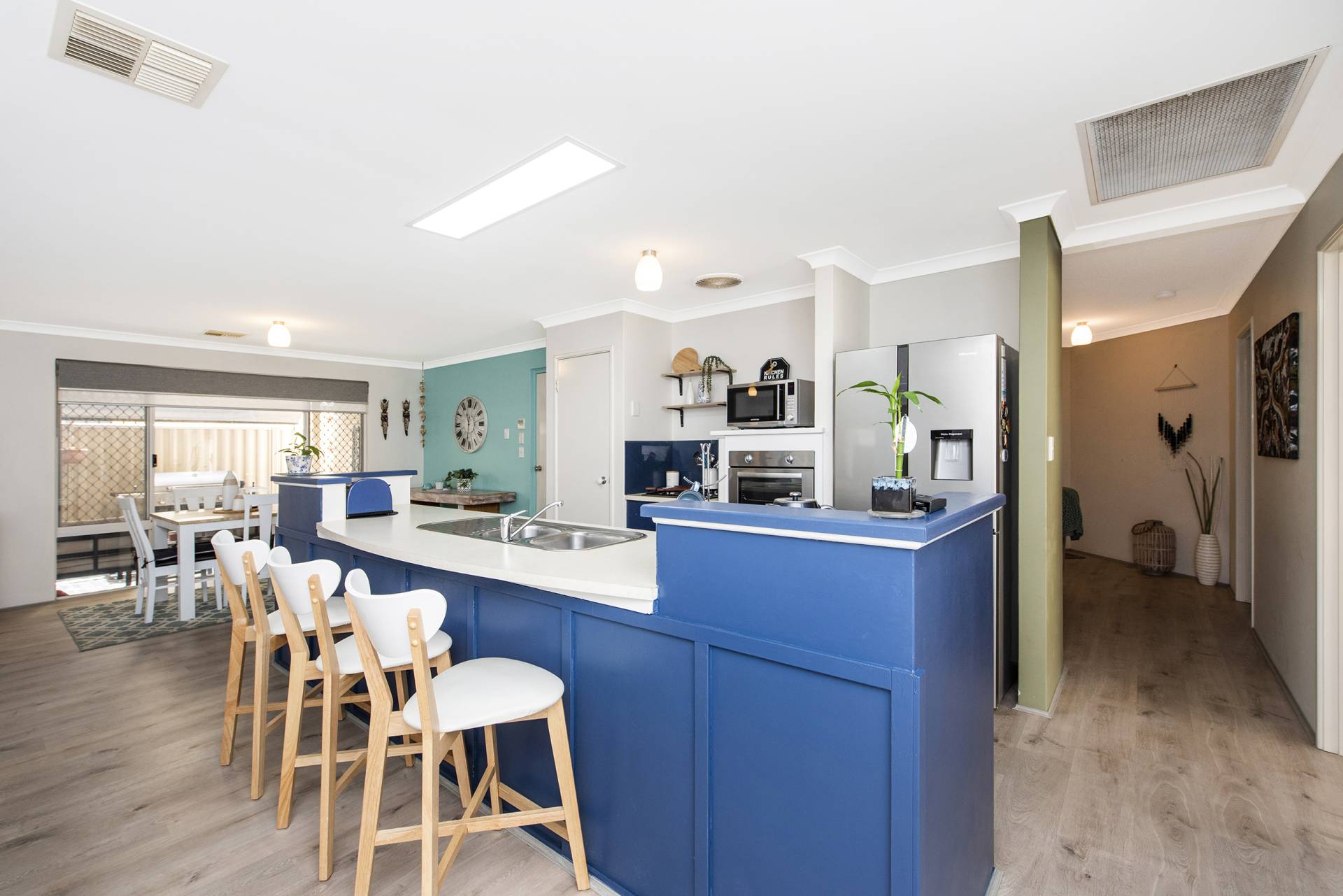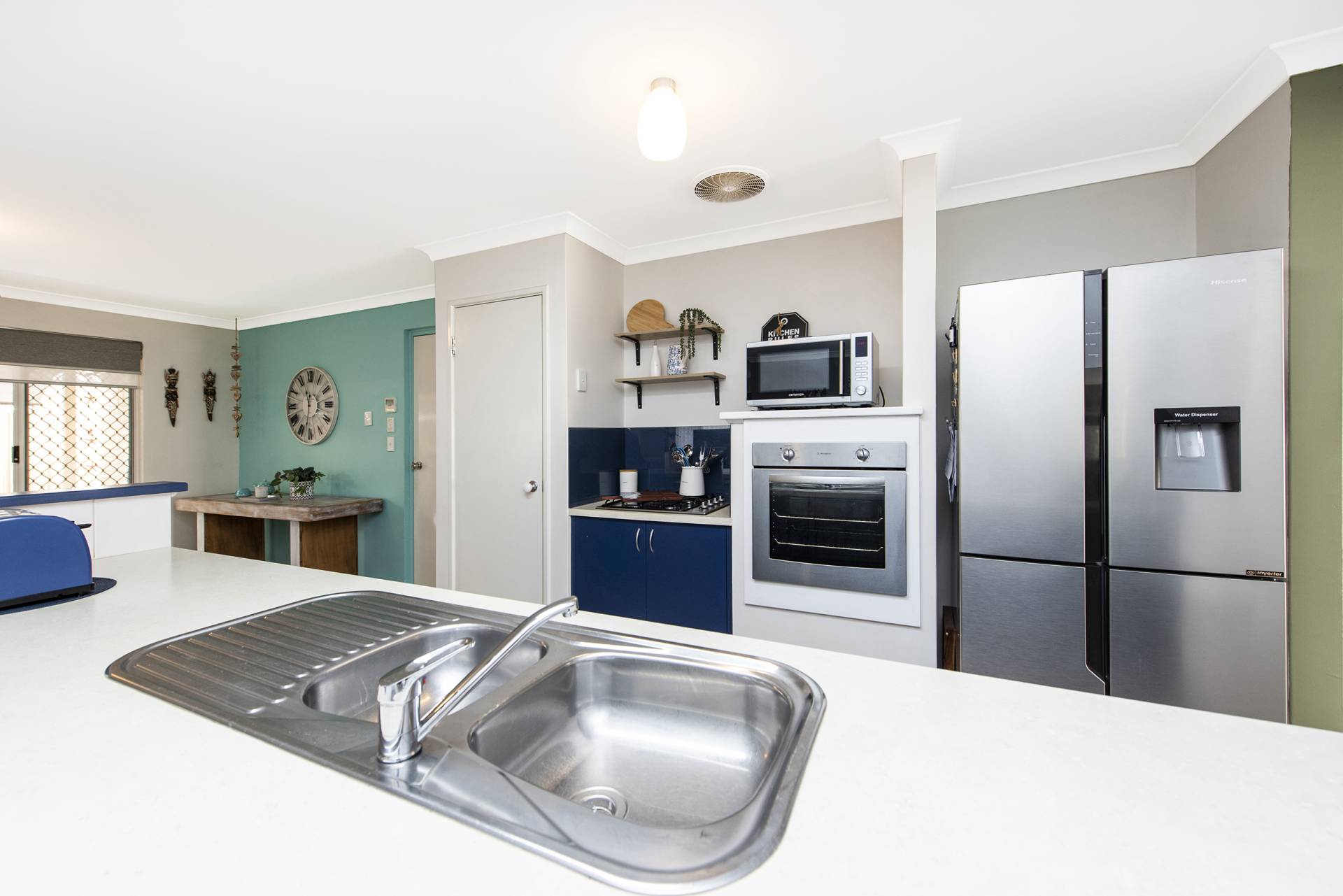 The galley style kitchen is located at the heart of the home and includes a gas burner stove top, electric oven, dishwasher recess, large fridge recess, microwave recess, shoppers' entry and overlooks the generous open plan living area with indoor – outdoor flow.