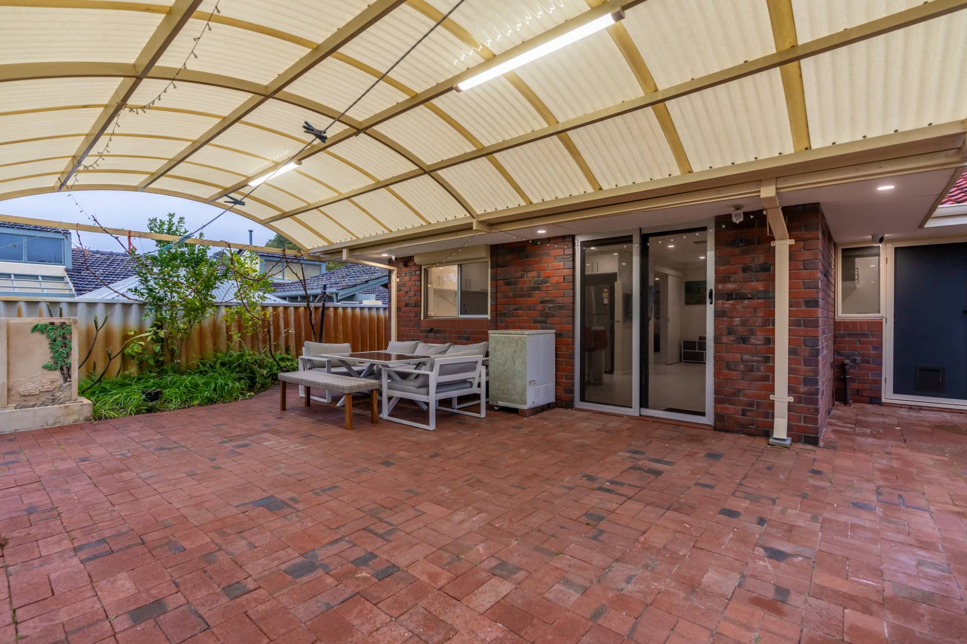 Undercover outdoor entertainment space with pitched pergola.