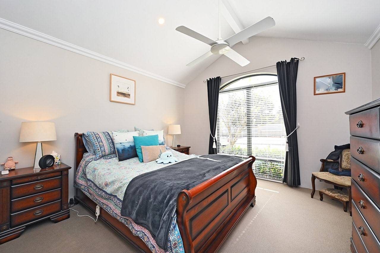Spacious master bedroom with feature raked ceiling, ceiling fan and his and her's mirrored sliding door robes