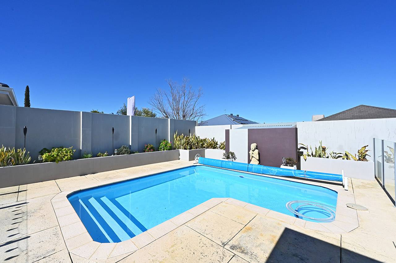 Fully fenced below ground pool surrounded by poured liquid limestone paving, feature planter boxes and manicured gardens