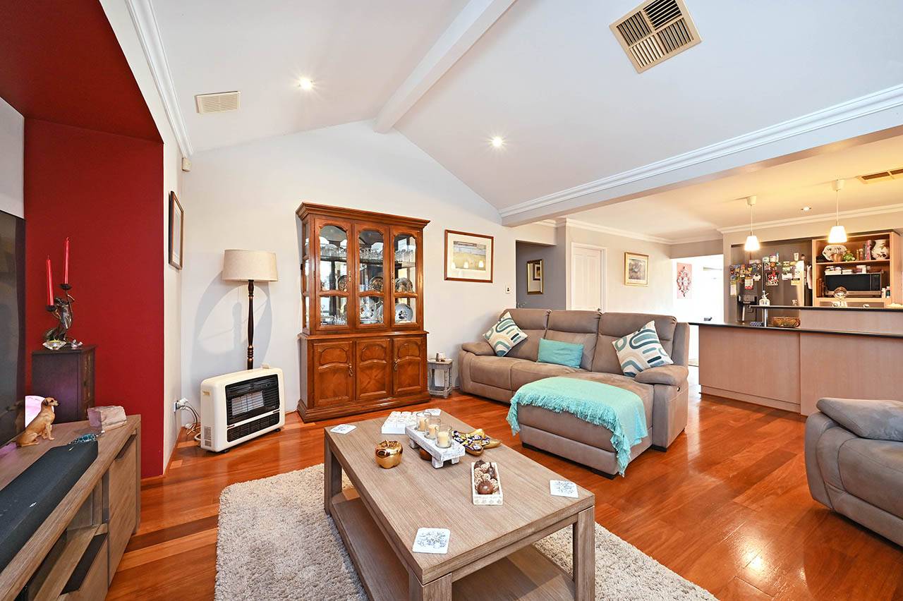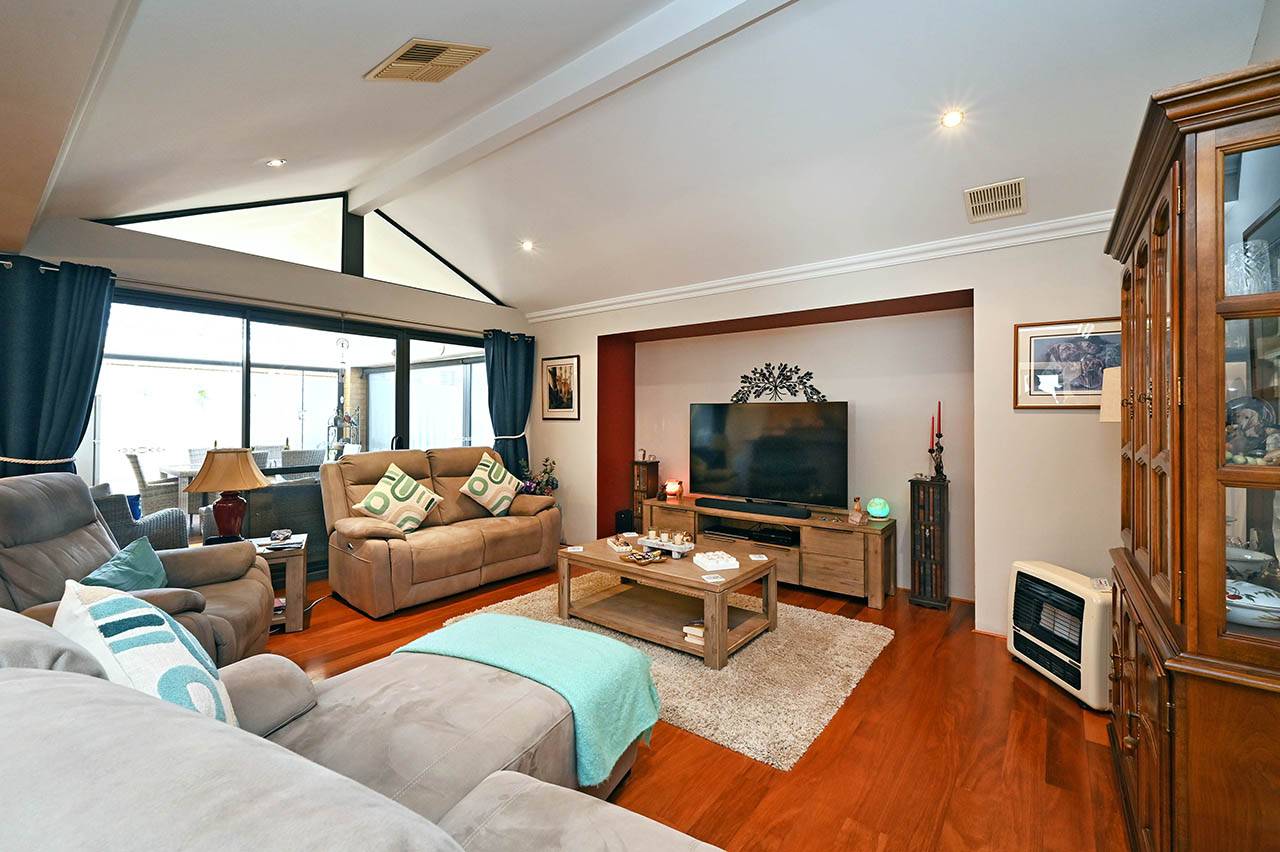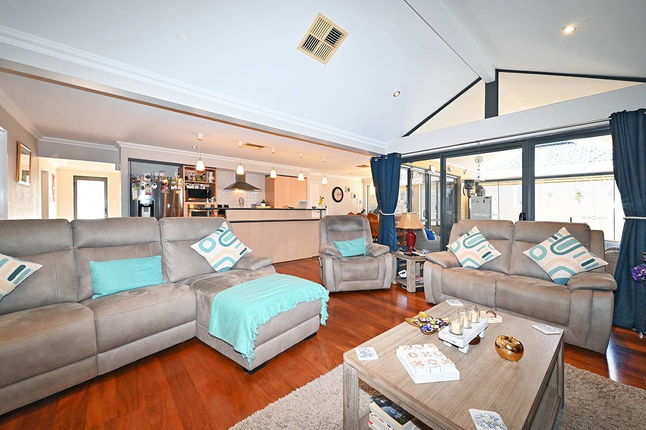 Spacious open plan meals and living areas with feature raked ceiling and sliding door access from both meals and family room