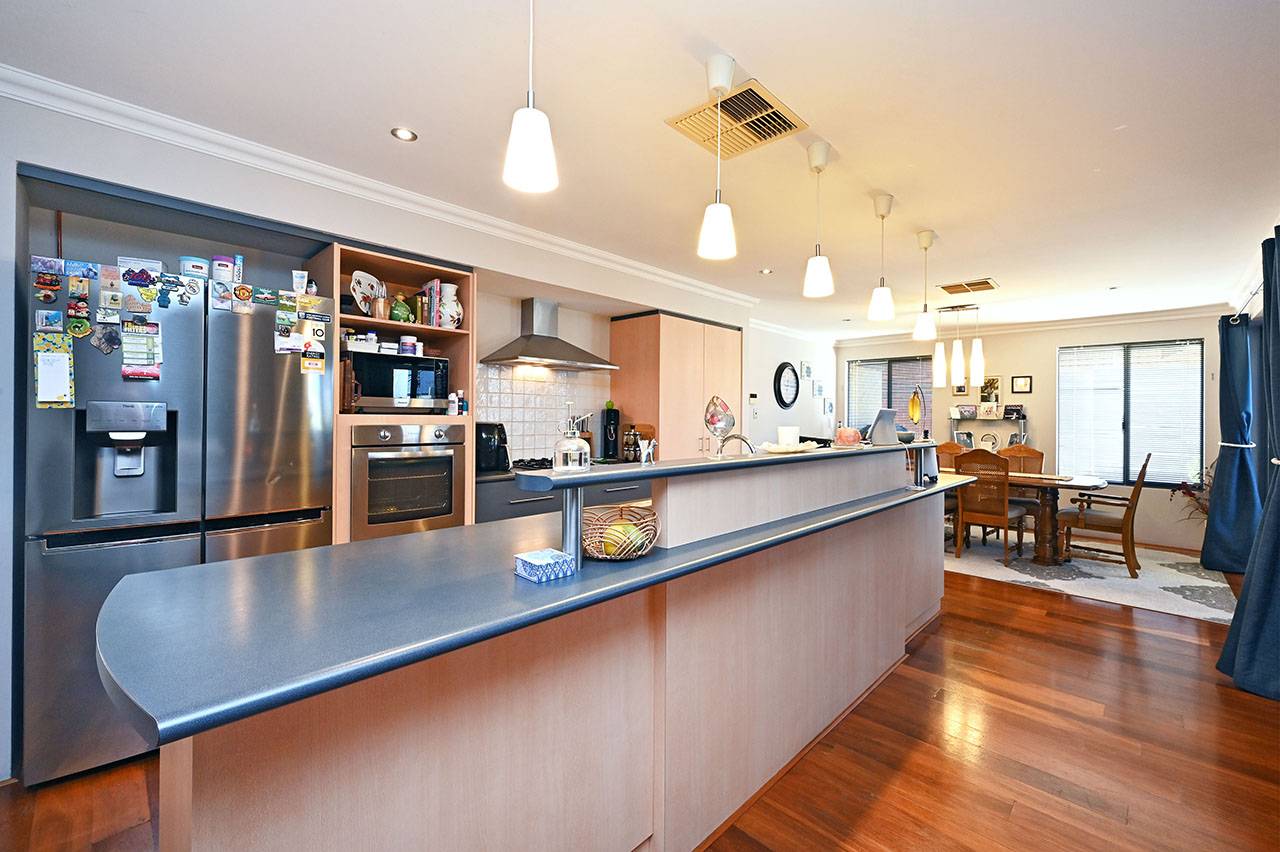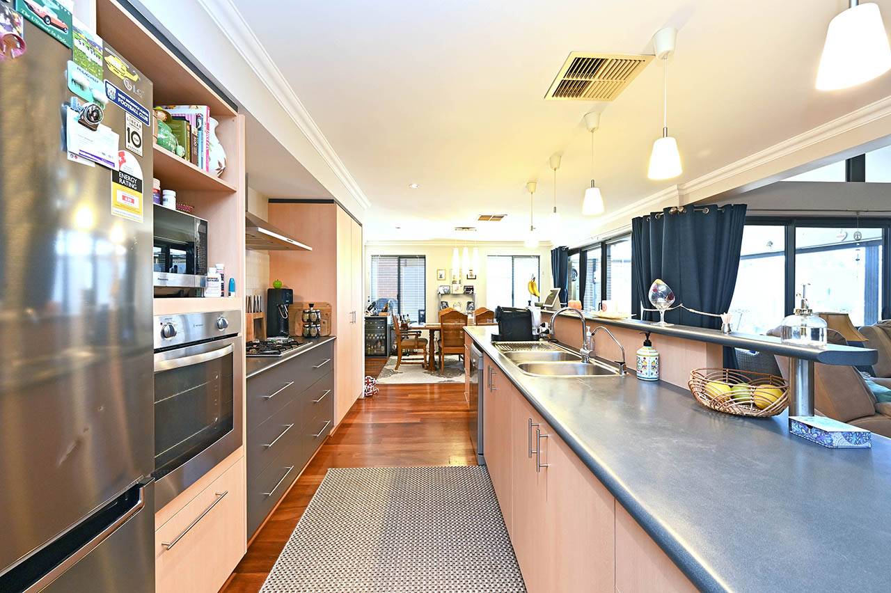 Central kitchen with stainless steel appliances, gas hotplates, rangehood, dishwasher, separate filtered water tap, fridge/freezer recess (with plumbing) and ample bench / cupboard space