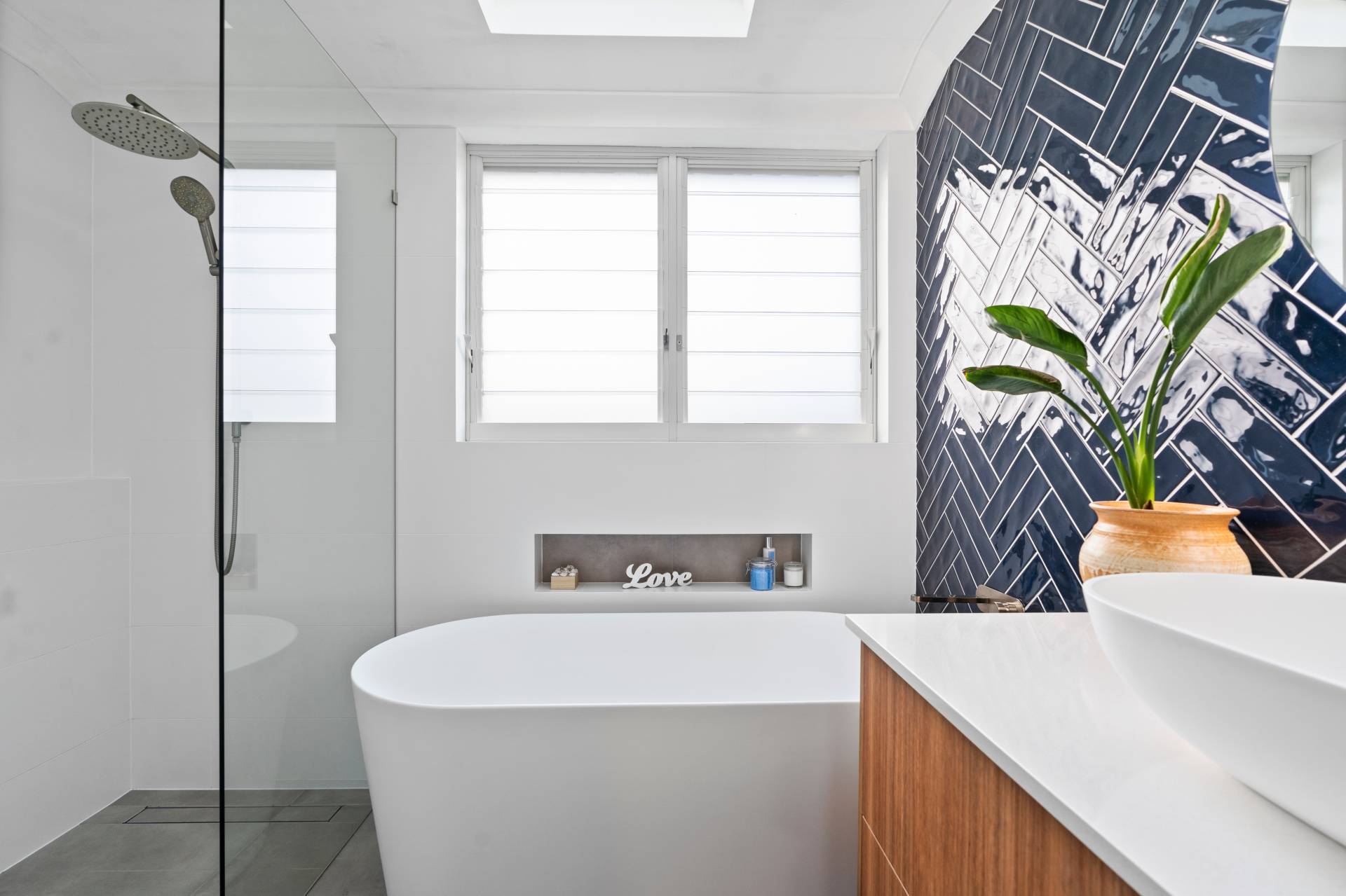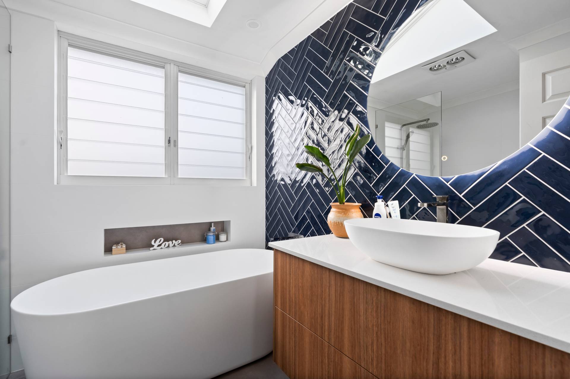 Breathe new life into your daily routine with a completely renovated bathroom. Adorned with stone countertops, a designer sink, a feature tiled wall, and a luxurious floating bathtub, this space is perfect for indulgence and relaxation.