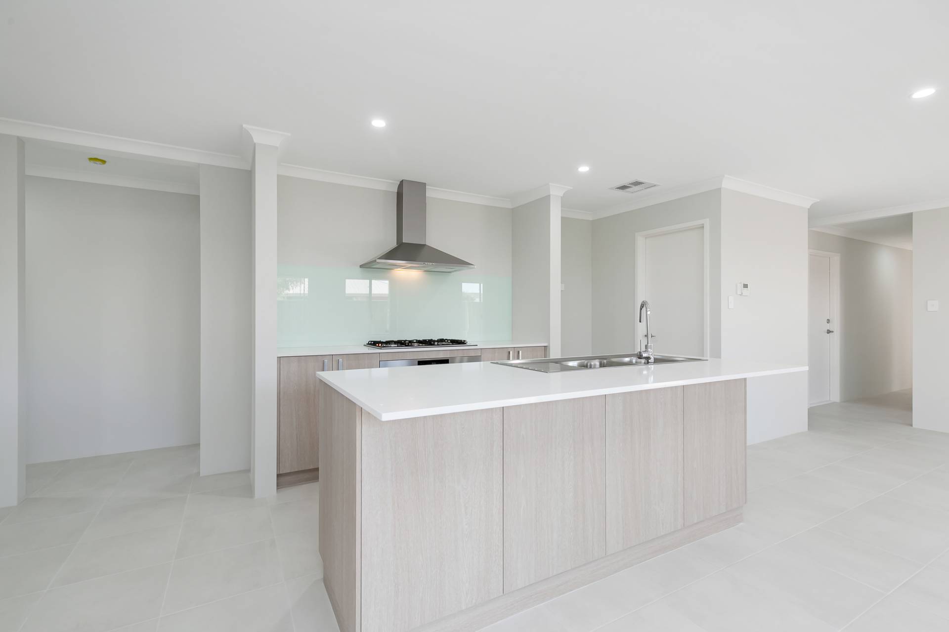 Stylish kitchen with a large gas cooktop and oven, double sink and stone benchtops