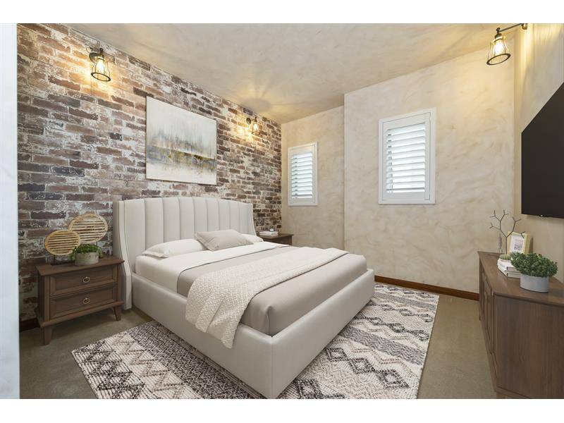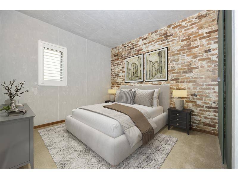 Two main bedroom suites showcase feature-brick wallpaper and plaster-effect paint finish, contrasting beautifully with the crisp white shutters, and luxe ensuite bathrooms with stone surfaces and frameless shower screens. Take comfort in knowing your urban abode boasts the convenience of fully air-conditioned spaces and the security of exclusive access, plus the bonus of an undercover car bay.