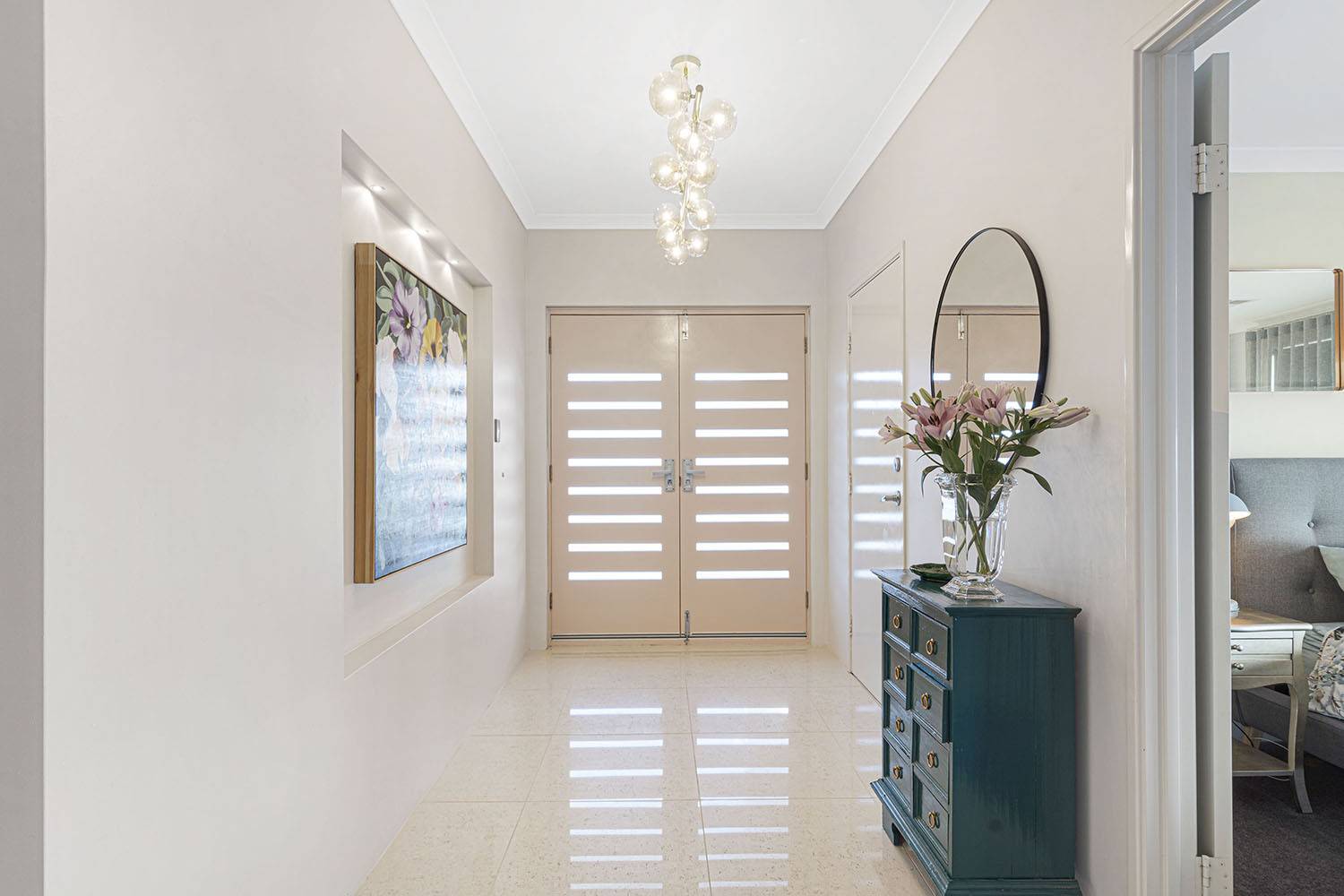 • Inviting timber decked boardwalk entrance leading to a wide, sunny hallway with a feature wall recess.
