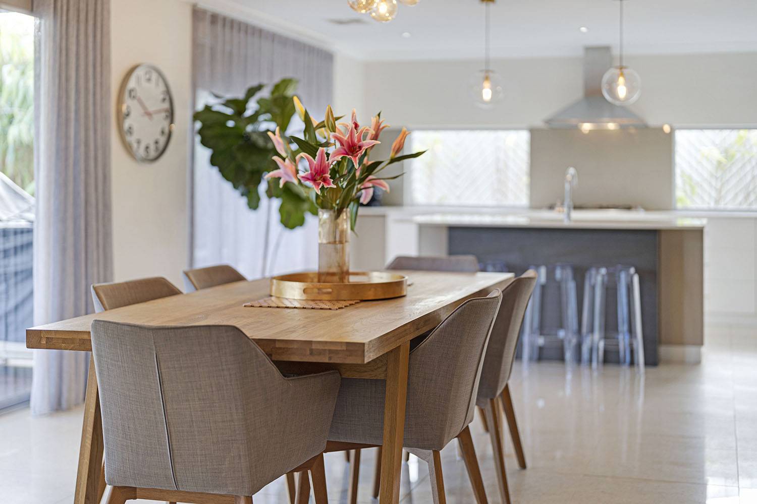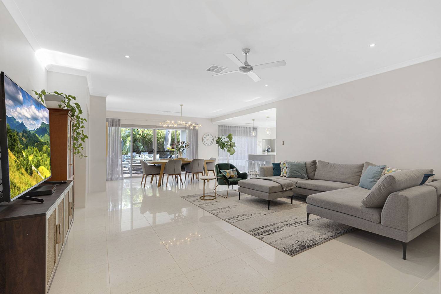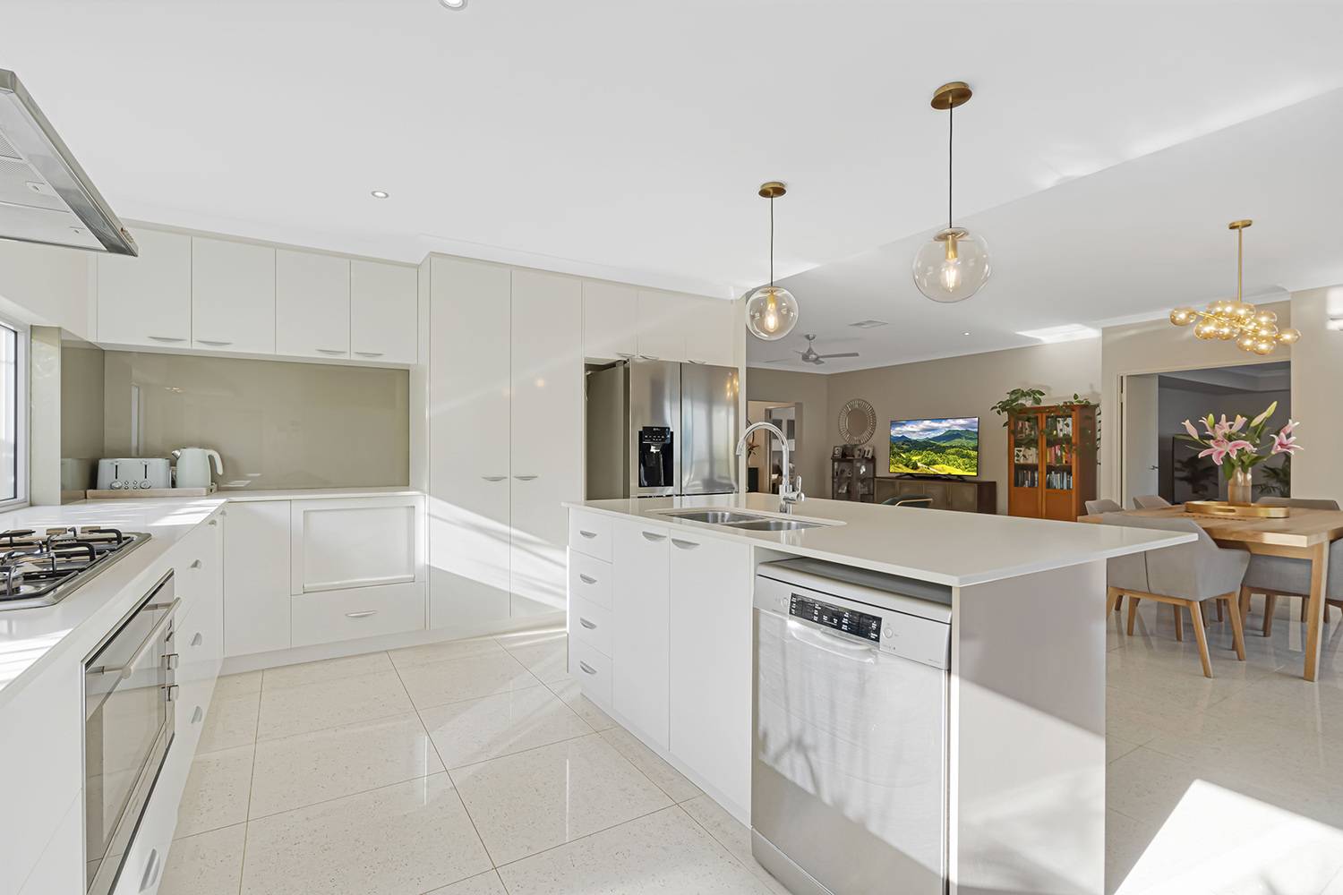 • Spacious open-plan family, kitchen, and meals area with high ceilings.