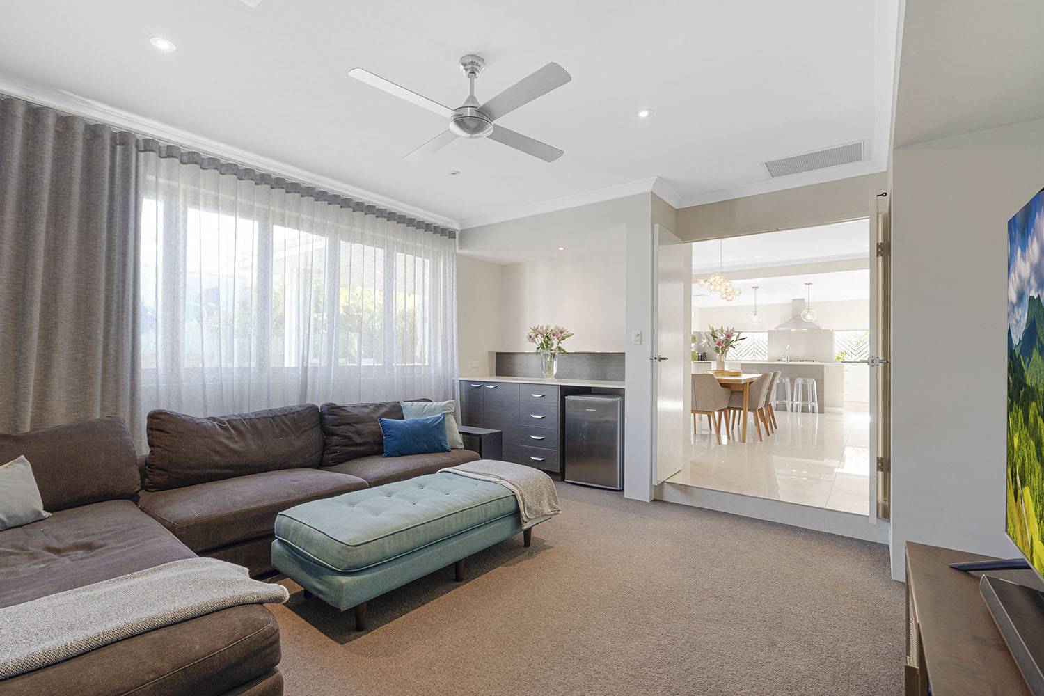 • Sunken theater room at the rear with a built-in bar, Essastone benchtop, and bifold servery windows opening to the pool.