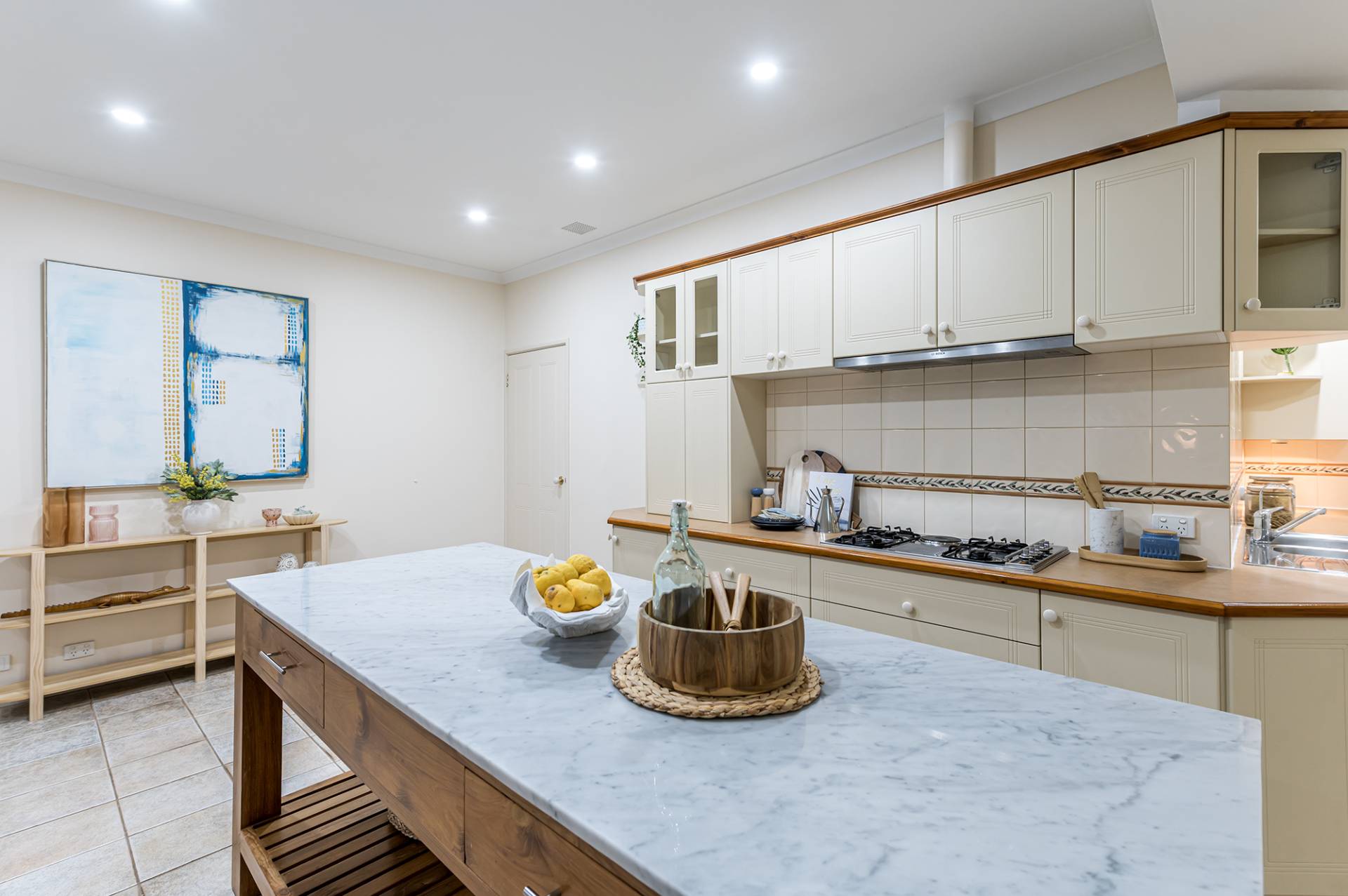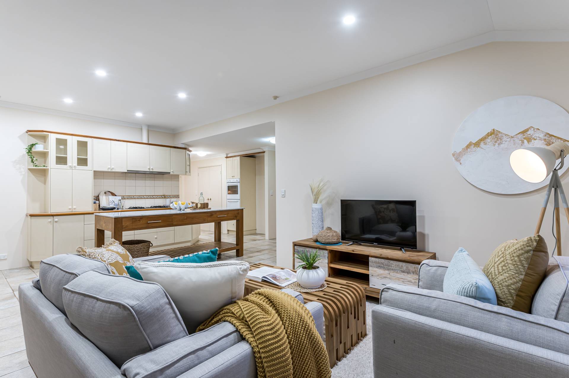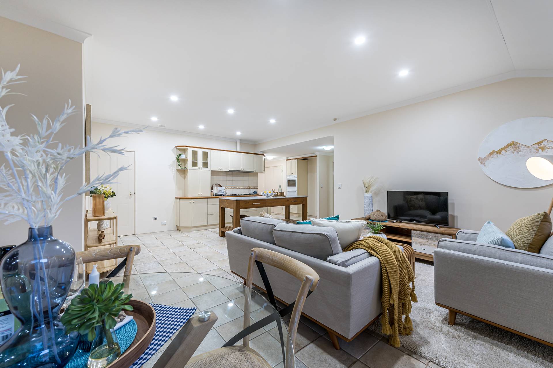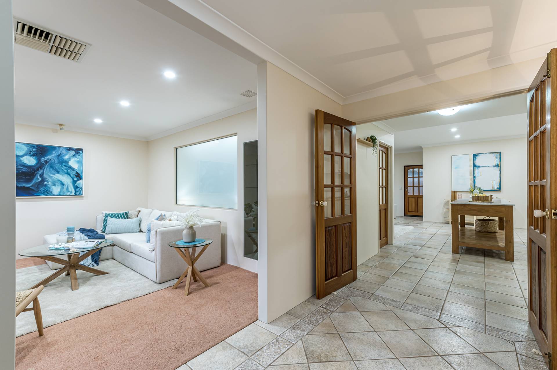 The formal living area is your cozy retreat, ideal for unwinding with friends, engaging in lively conversations, and savoring delicious meals and wine. Alternatively, it can serve as a haven for your family to gather for a movie night, with double French doors isolating it from the kitchen and bedrooms, ensuring peace and quiet.