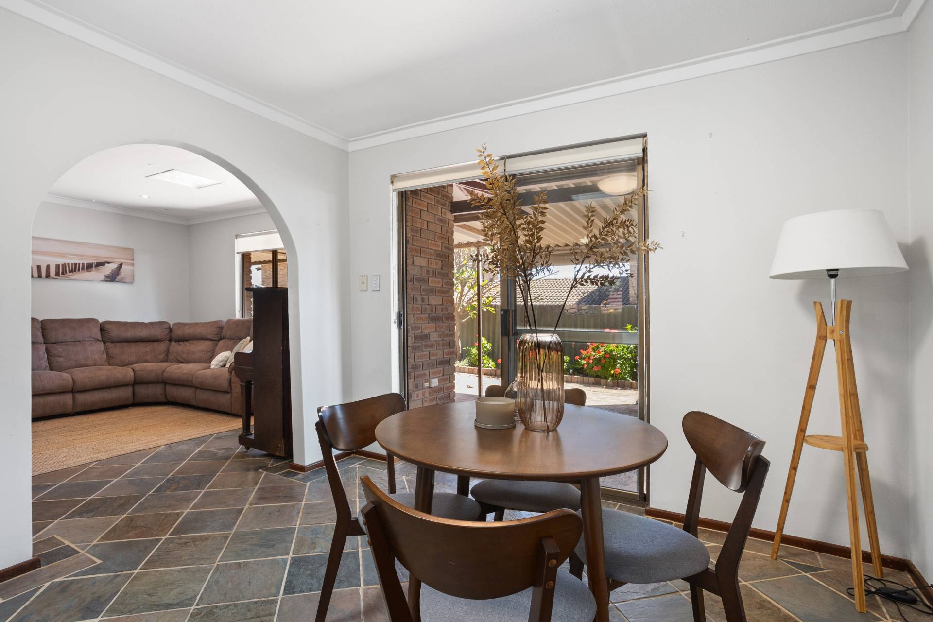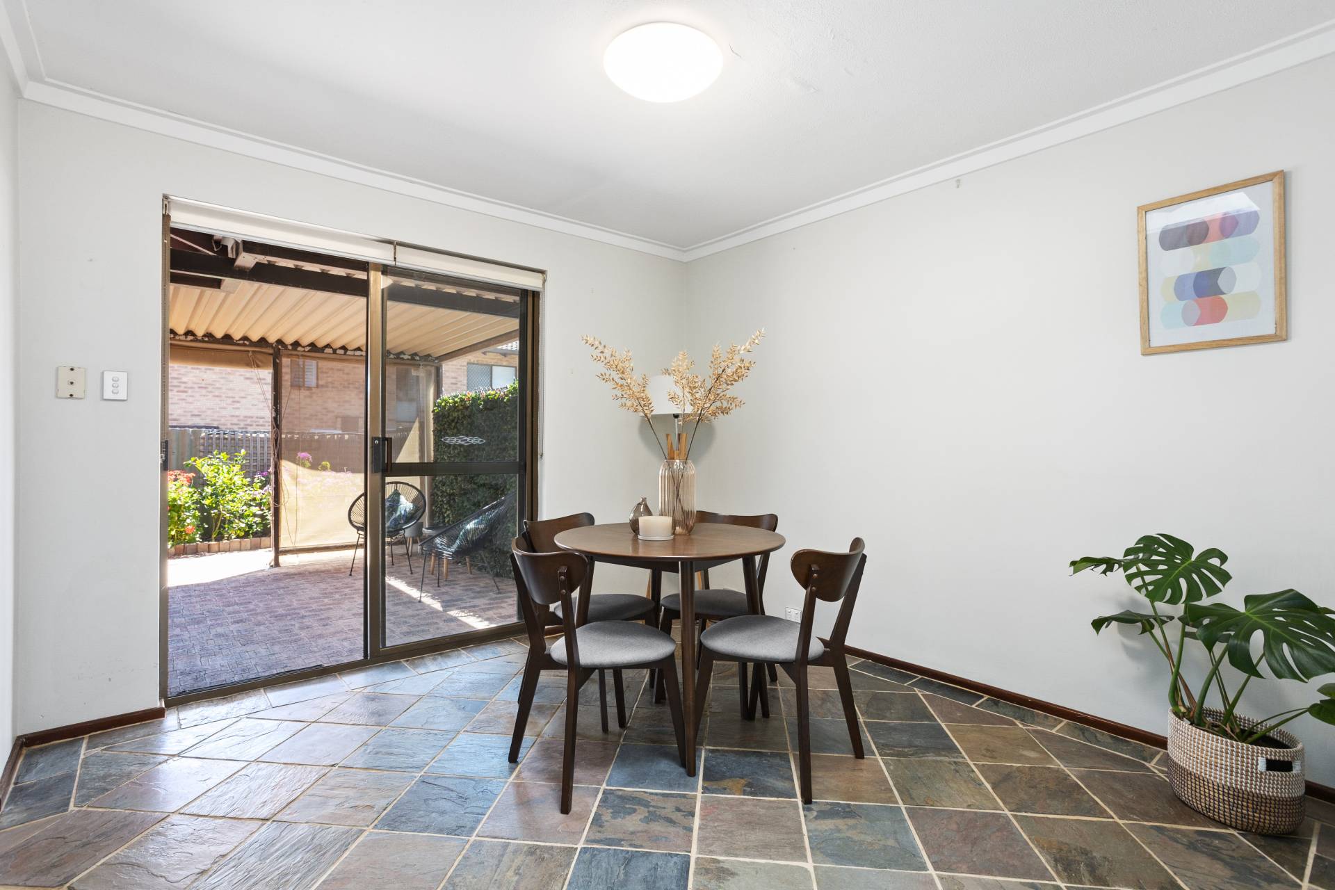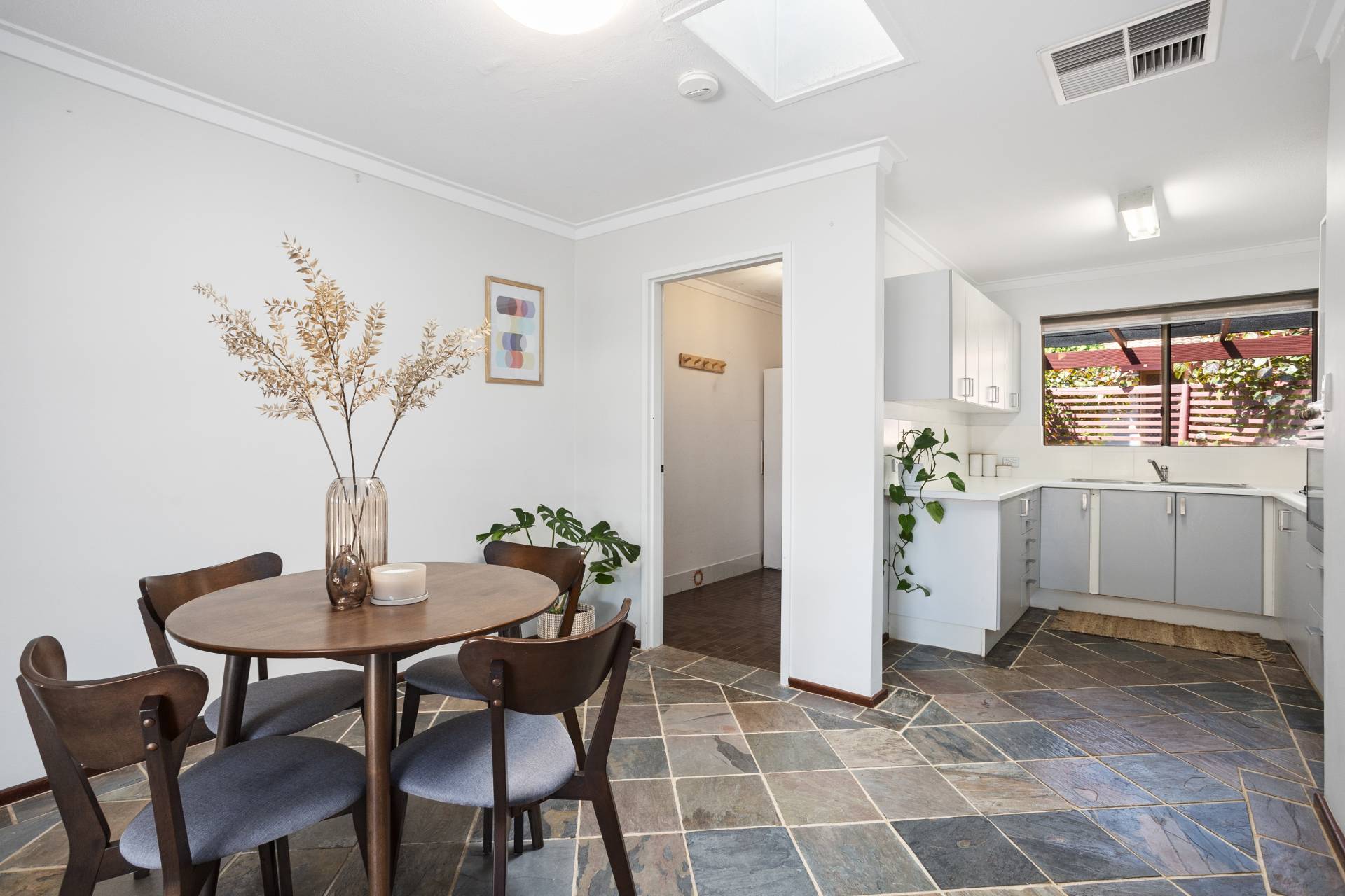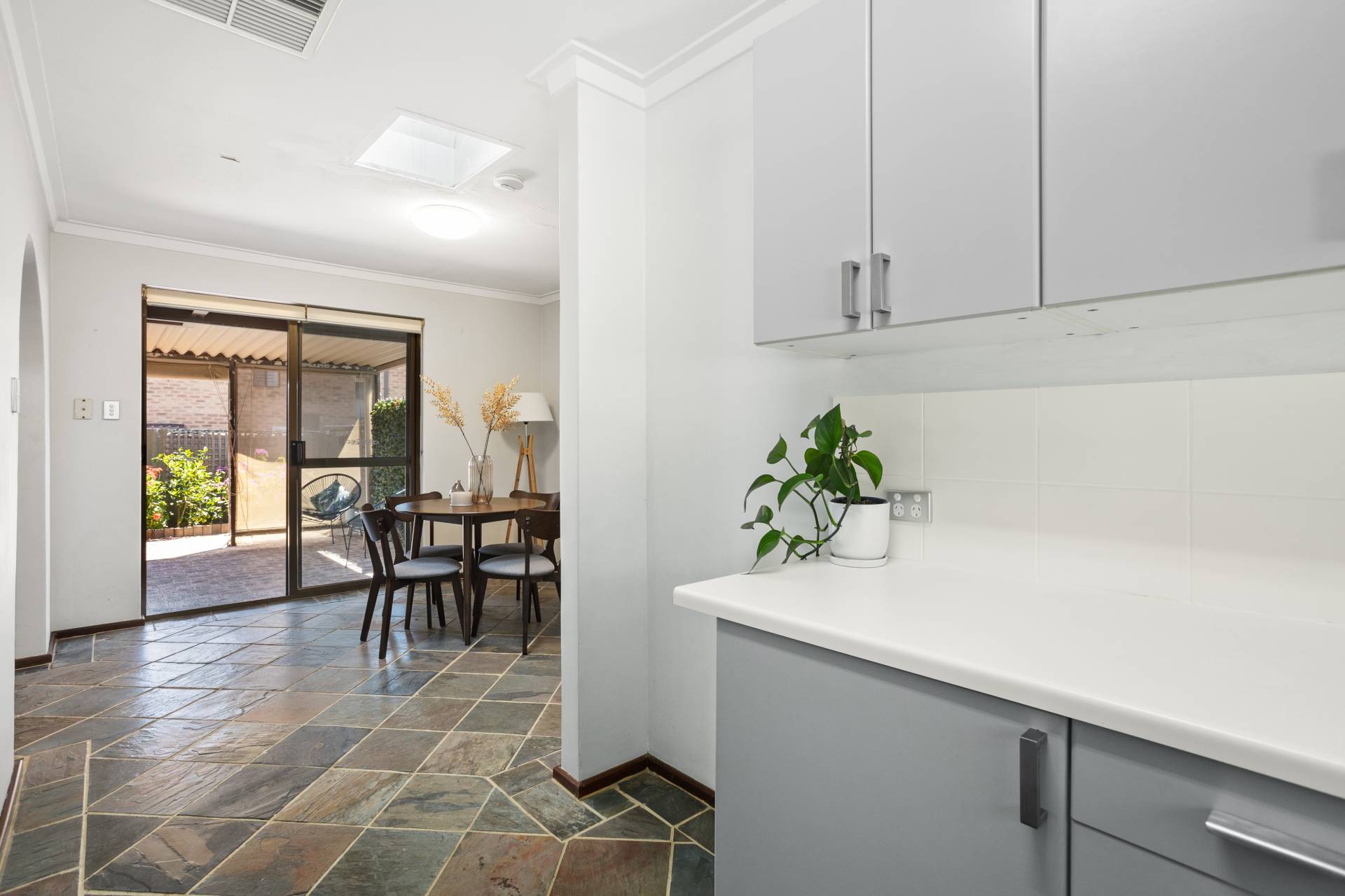 Cool slate tiles guide you through the combined living and dining area, illuminated by natural light pouring in from the skylight above the meals section and well-placed windows and sliding doors. The adjacent kitchen serves as a practical workspace, featuring stainless-steel cooking appliances and abundant storage, while the serene courtyard view adds a layer of greenery. For added convenience, the villa houses a laundry space that leads to a secure single lock-up garage, ensuring both functional and security needs are met.