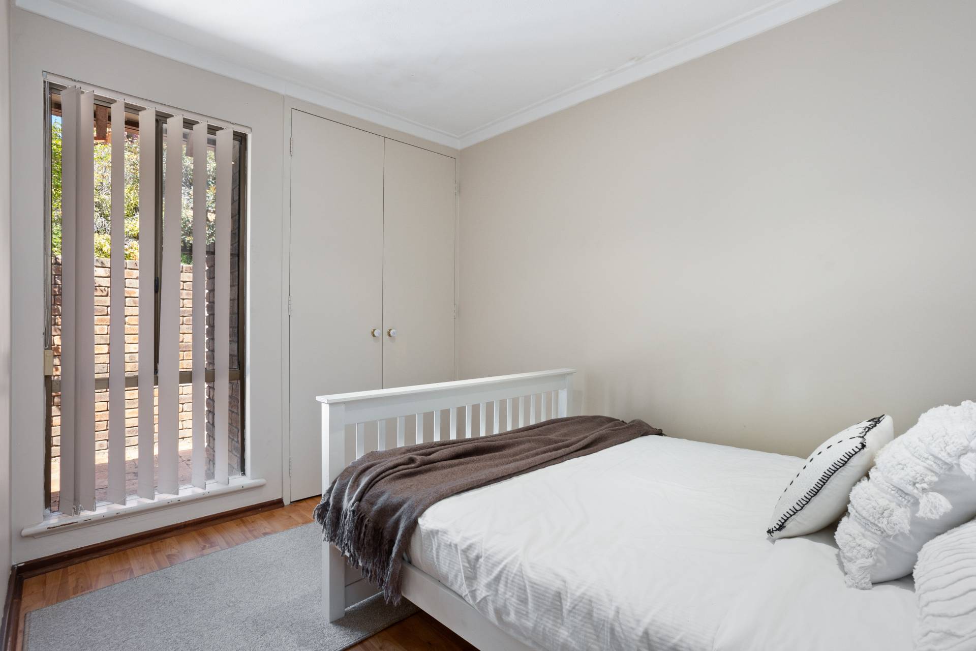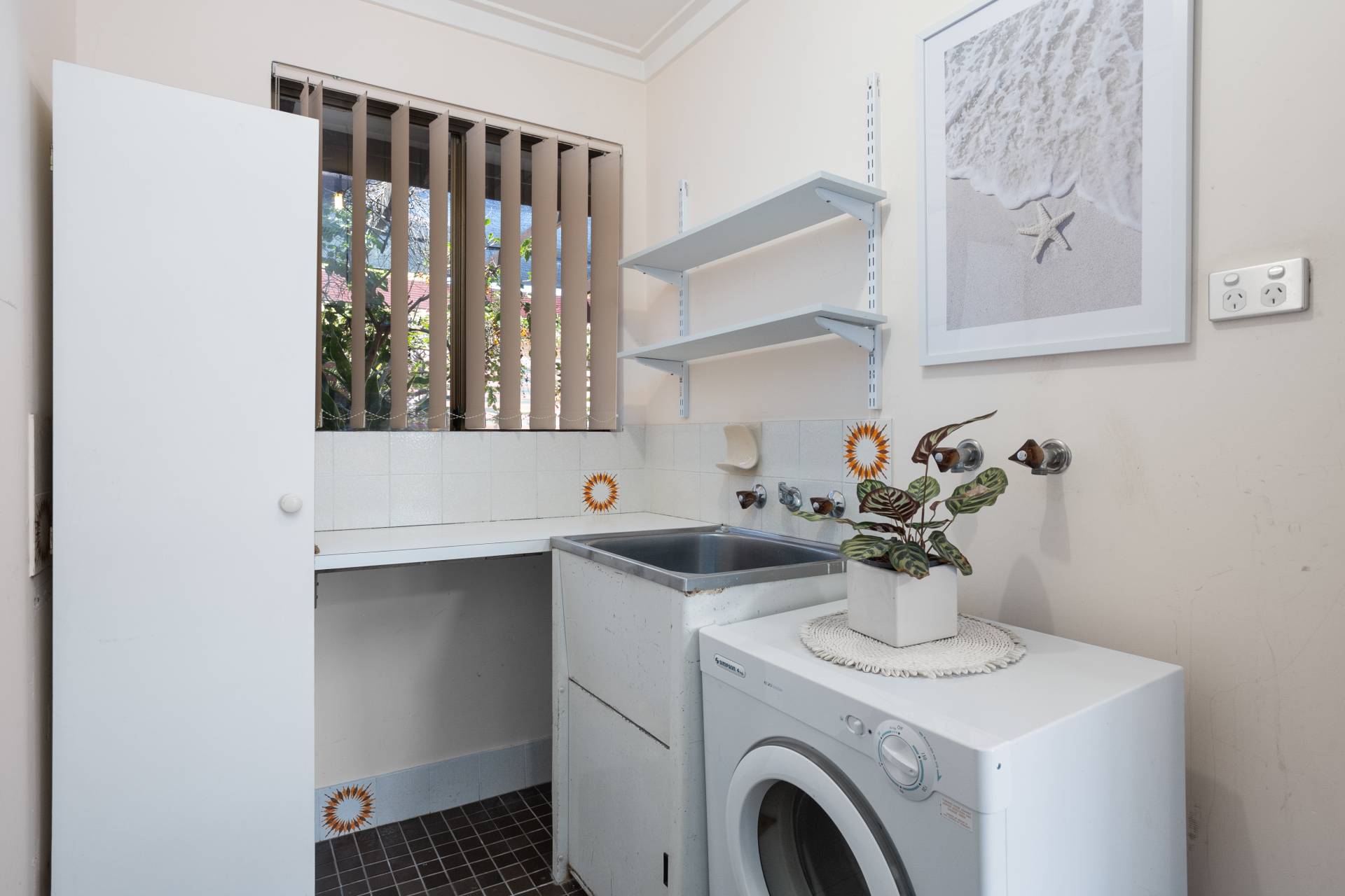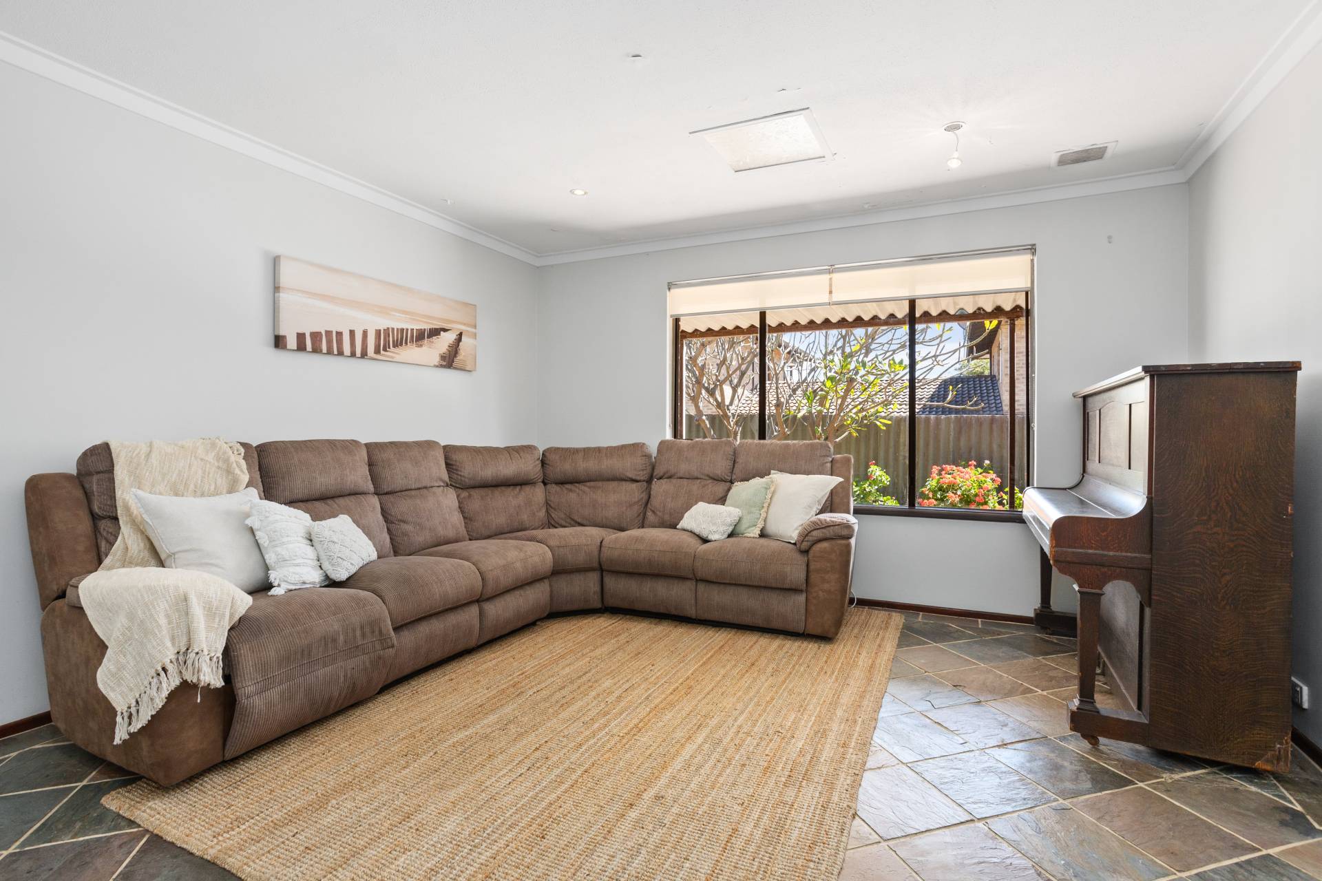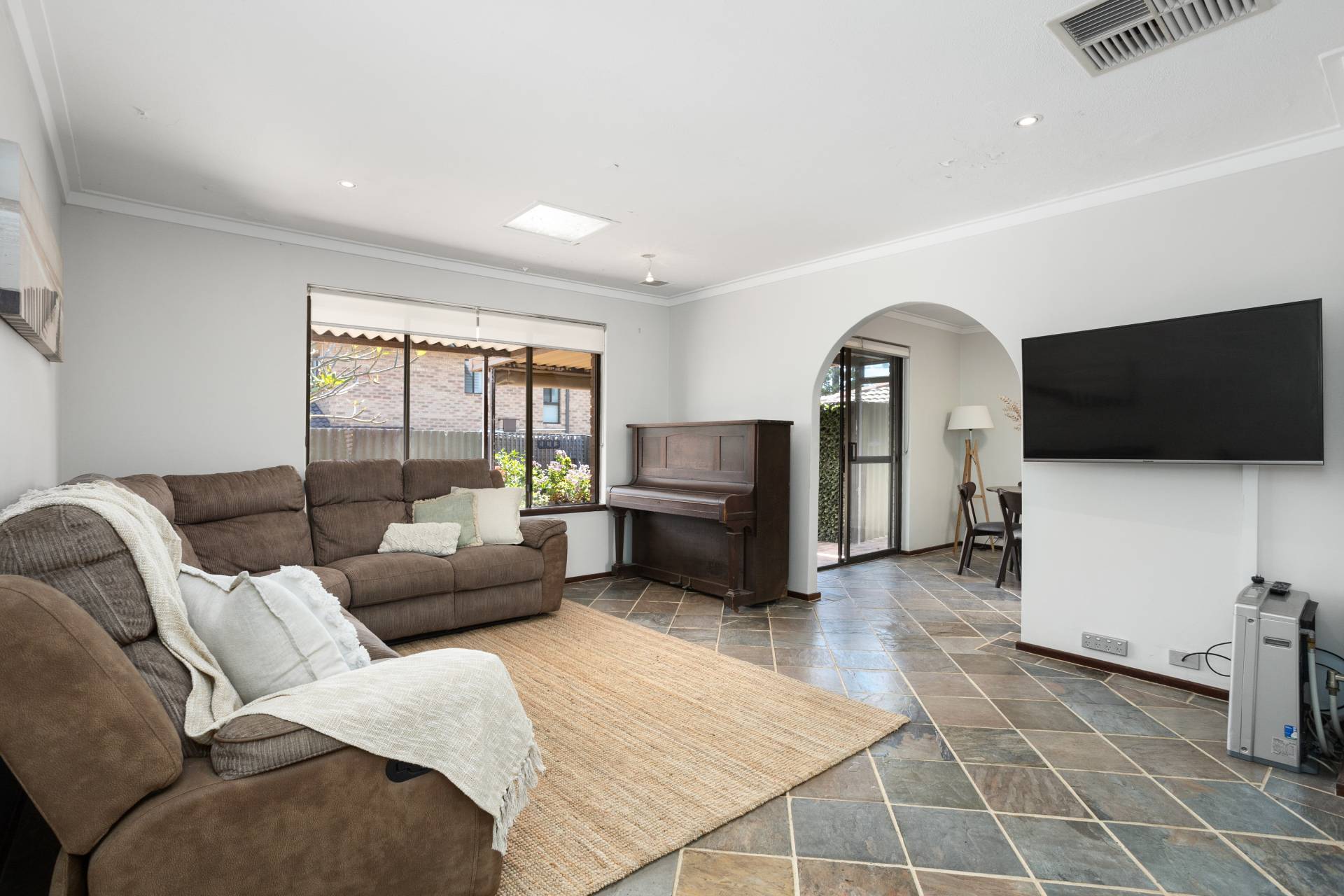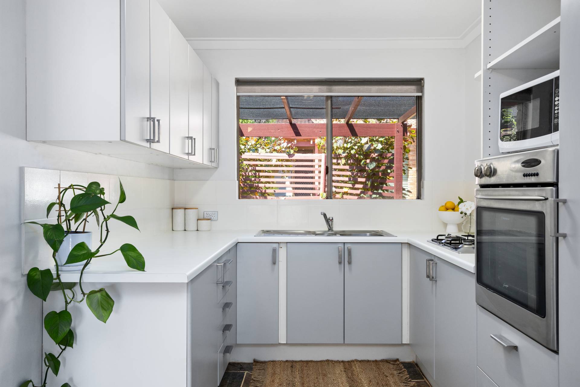 Cool slate tiles guide you through the combined living and dining area, illuminated by natural light pouring in from the skylight above the meals section and well-placed windows and sliding doors. The adjacent kitchen serves as a practical workspace, featuring stainless-steel cooking appliances and abundant storage, while the serene courtyard view adds a layer of greenery. For added convenience, the villa houses a laundry space that leads to a secure single lock-up garage, ensuring both functional and security needs are met.