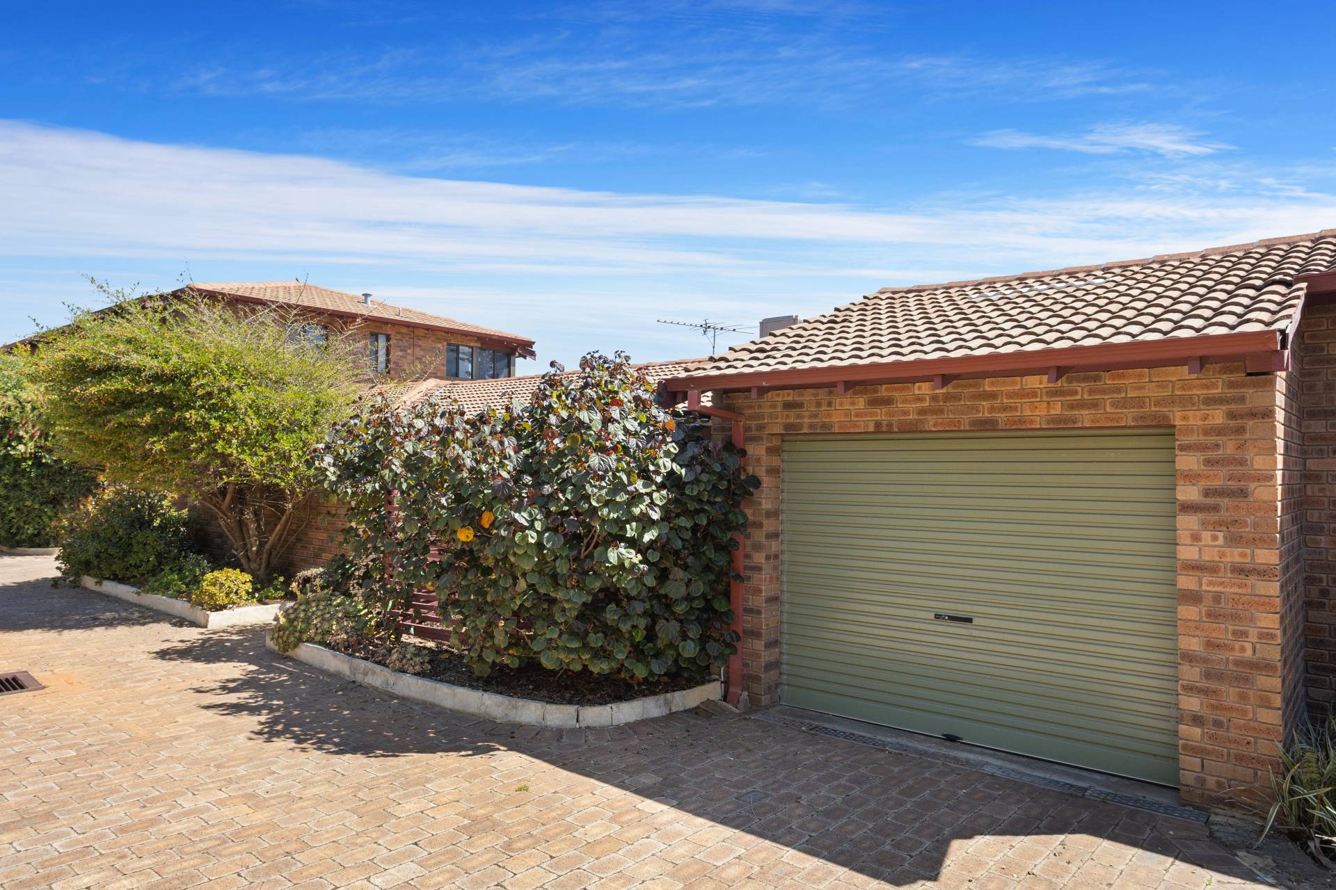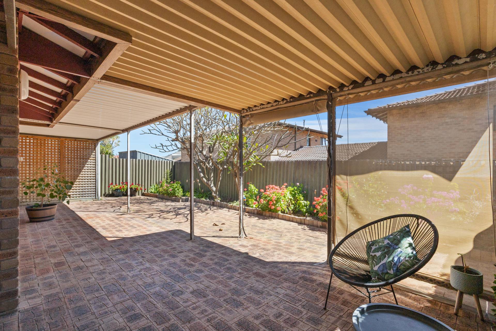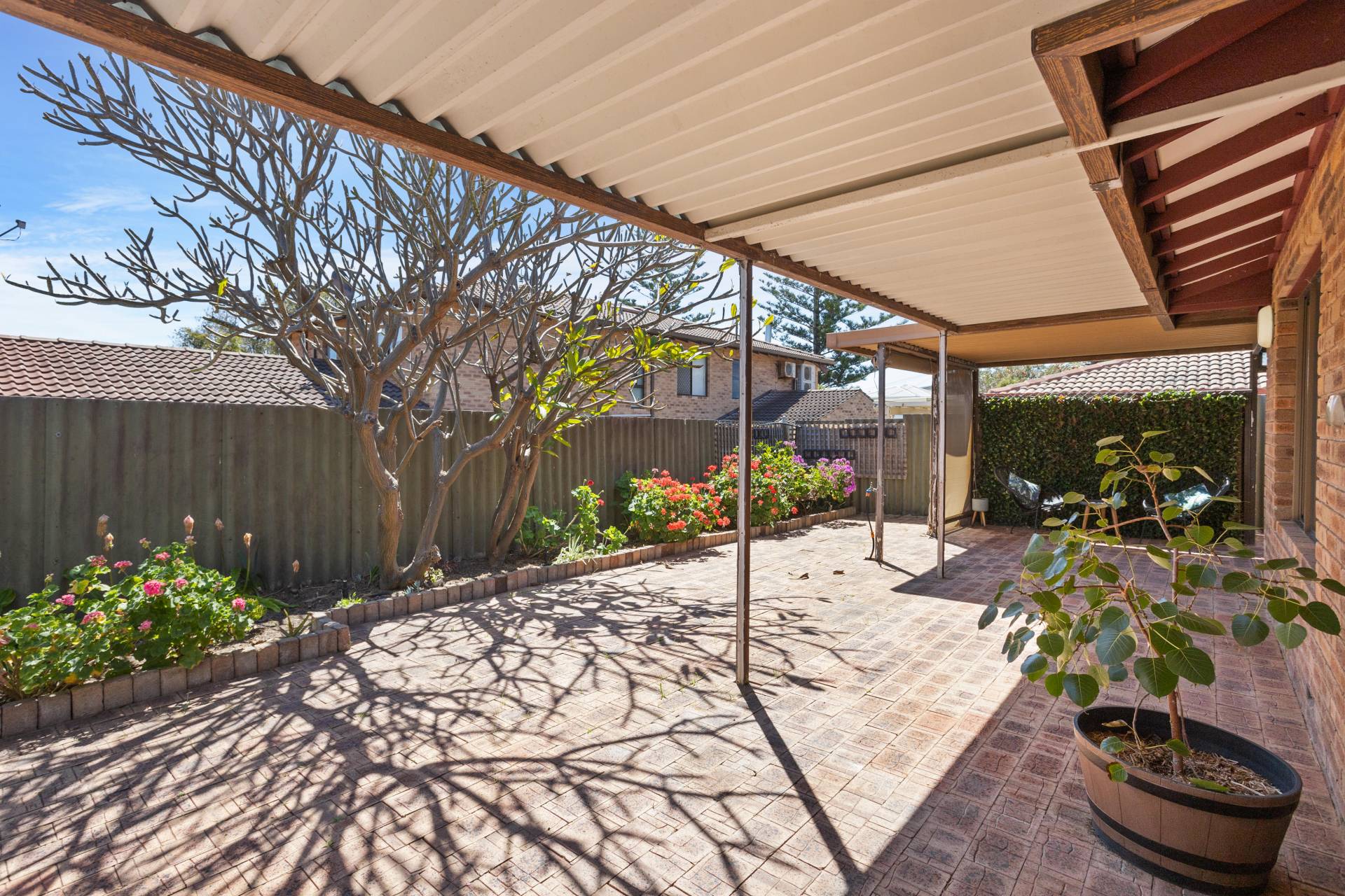 When it comes to relaxation and entertaining, the spacious backyard emerges as the villa's tranquil haven. Bordered by easy-care garden beds, the eye is immediately drawn to the stunning frangipani trees. Underneath the generous steel pergola, imagine sun-drenched mornings or balmy evenings spent with family or a book in hand.