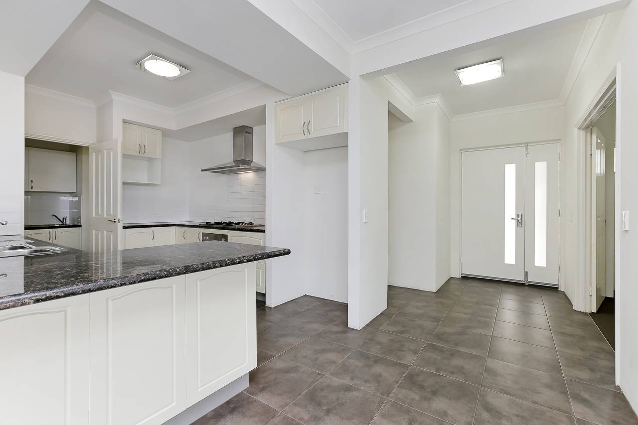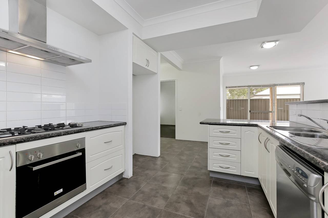 Neutral floor tiles, crisp white walls and slimline Venetians throughout provide a palette you can decorate with ease. The central, open-plan living and dining area enjoys plenty of natural light, and the adjacent kitchen is complete with stainless steel appliances, including a dishwasher, a walk-in pantry and recesses for your fridge and microwave.