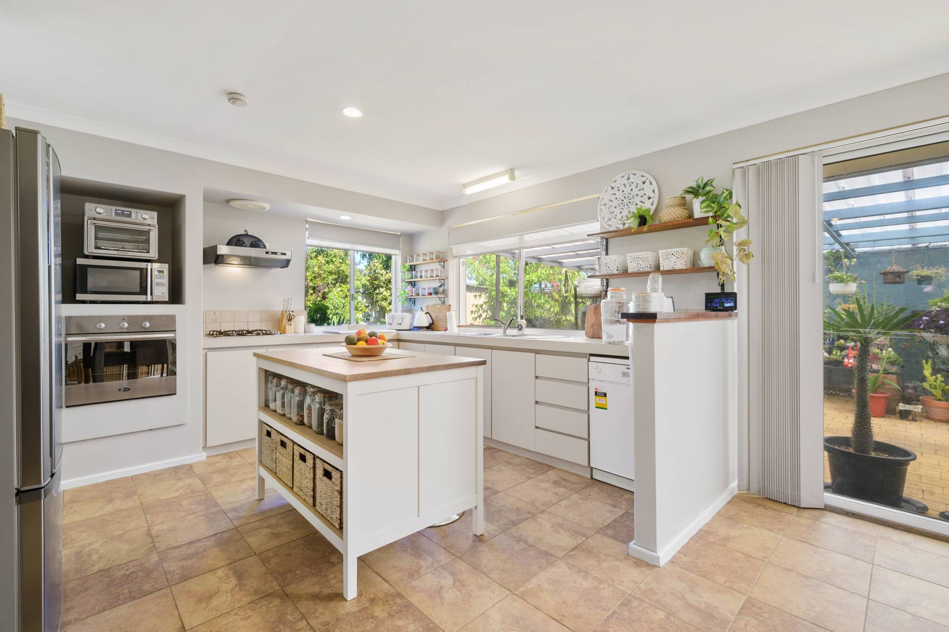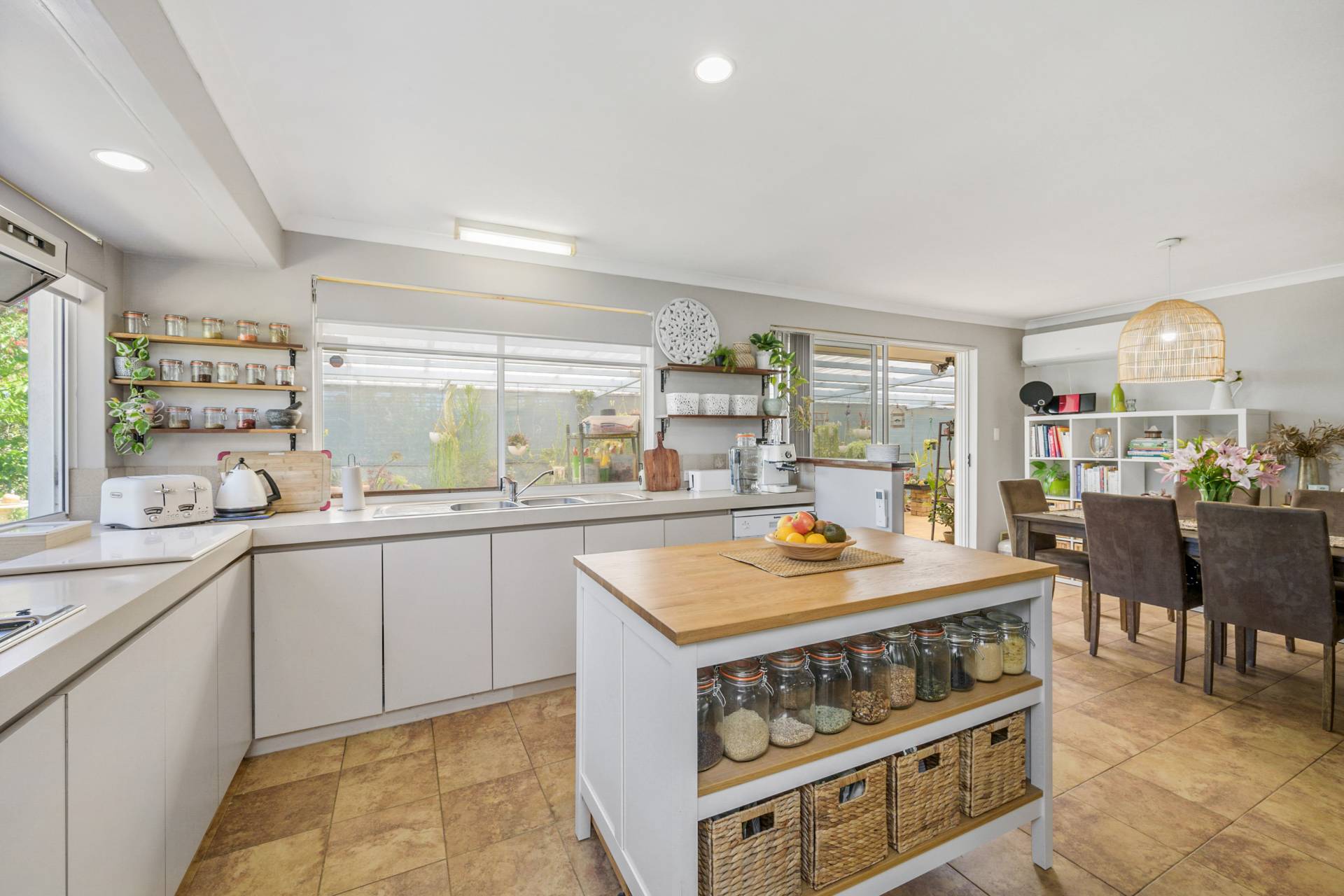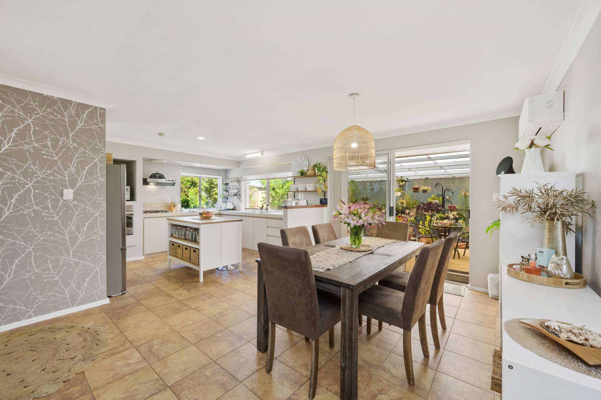 A huge back patio provides plenty of cover and protection from the elements all year round, amidst a tranquil natural setting that is accompanied by a selection of exotic fruit trees. It can all be so seamlessly accessed from an airy open-plan family, dining and kitchen area where stylish modern light fittings and split-system air-conditioning meet double sinks, stainless-steel range-hood, gas-cooktop and oven appliances, a sleek white Blanco dishwasher, a single storage pantry and plenty of space for a breakfast bar.