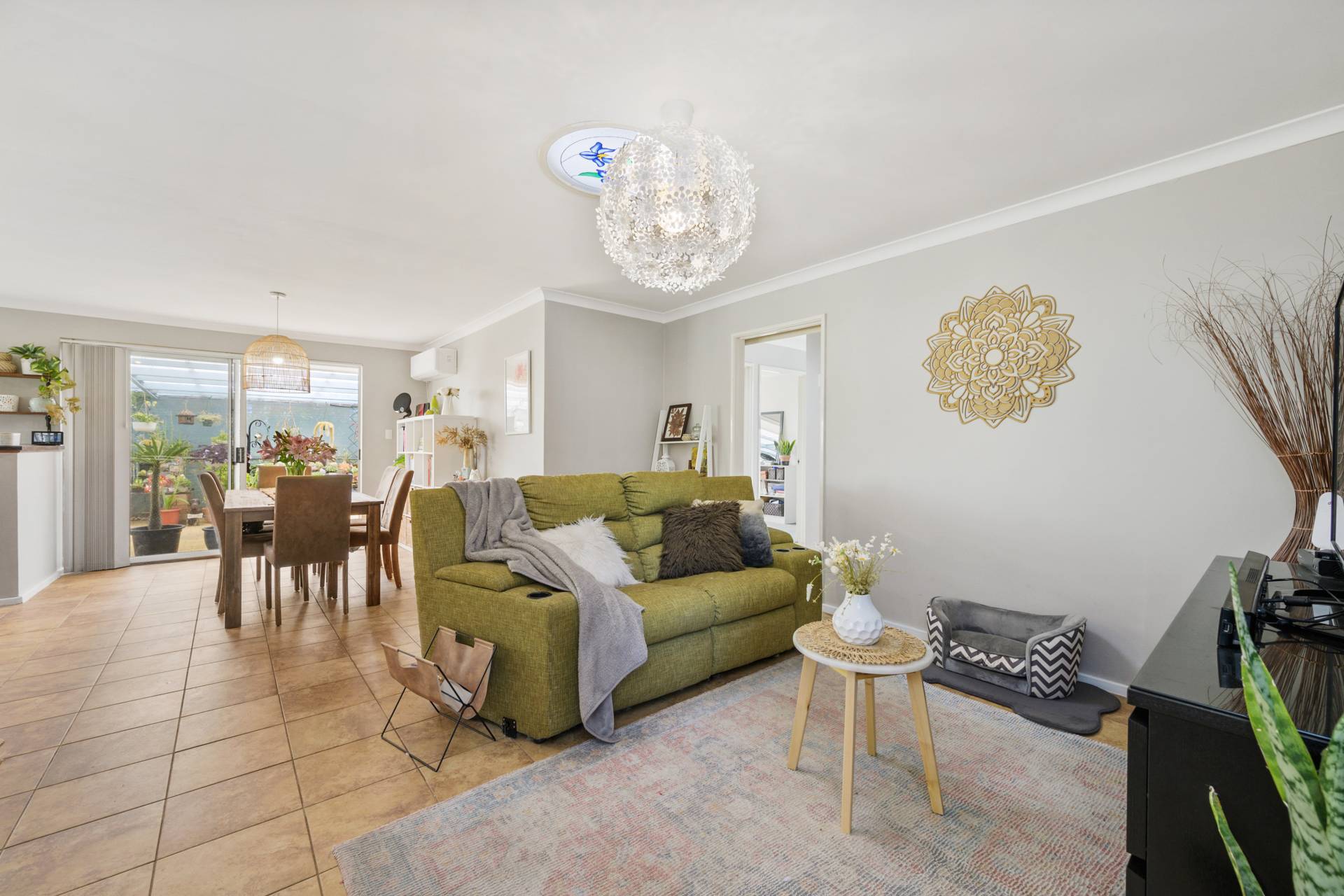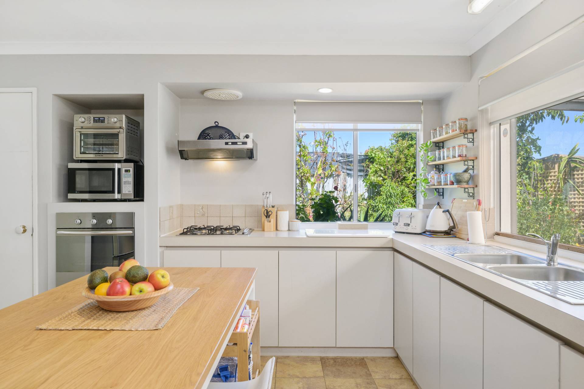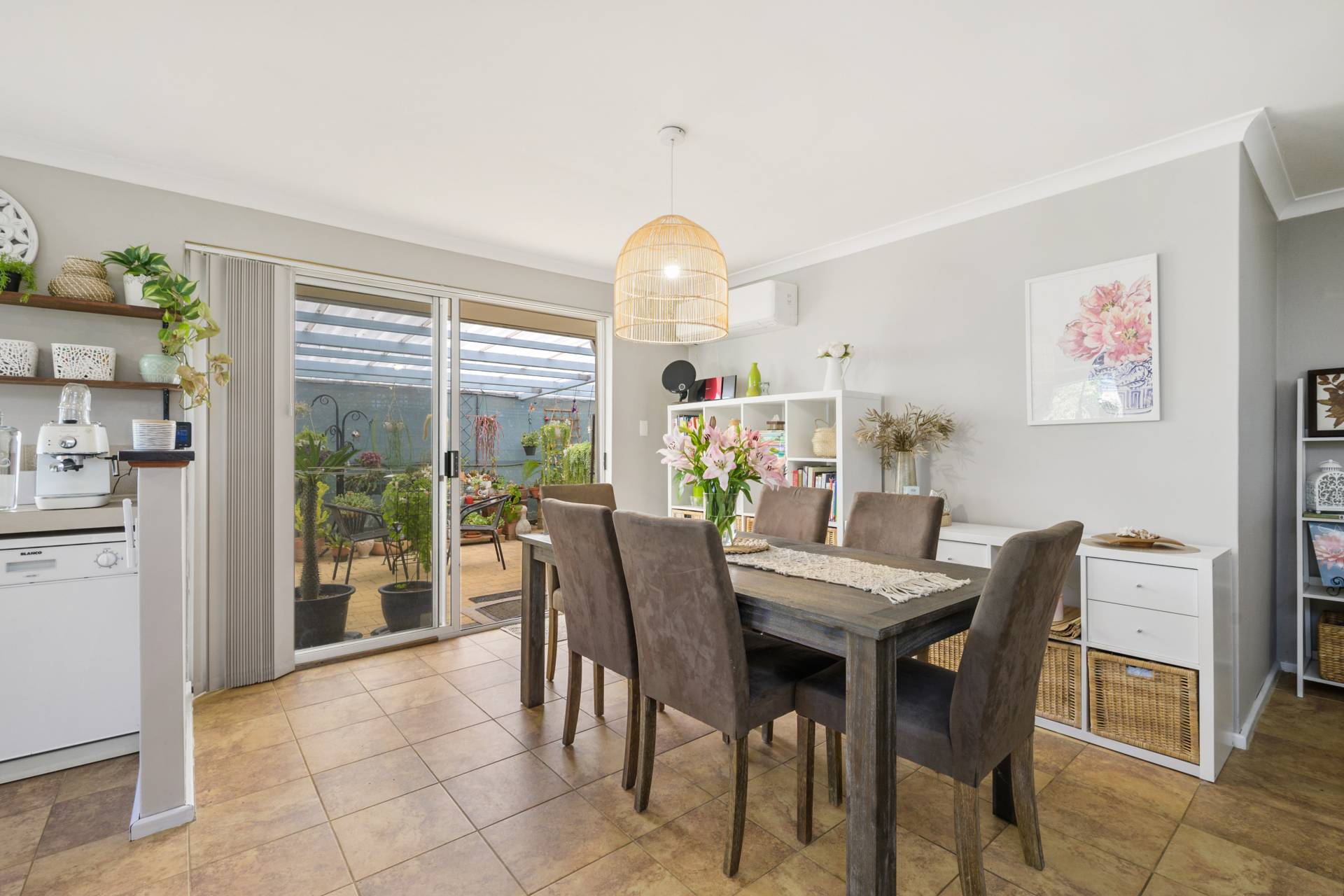 A huge back patio provides plenty of cover and protection from the elements all year round, amidst a tranquil natural setting that is accompanied by a selection of exotic fruit trees. It can all be so seamlessly accessed from an airy open-plan family, dining and kitchen area where stylish modern light fittings and split-system air-conditioning meet double sinks, stainless-steel range-hood, gas-cooktop and oven appliances, a sleek white Blanco dishwasher, a single storage pantry and plenty of space for a breakfast bar.