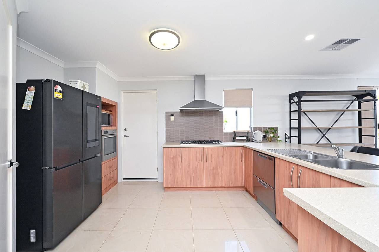 Corner kitchen with wide benchtops, stainless steel appliances (inc wall oven, 5 burner gas cooktop and rangehood), microwave recess, fridge / freezer recess with inbuilt plumbing, stylish tiled splashbacks, acres of bench / cupboard space and door access to garage
