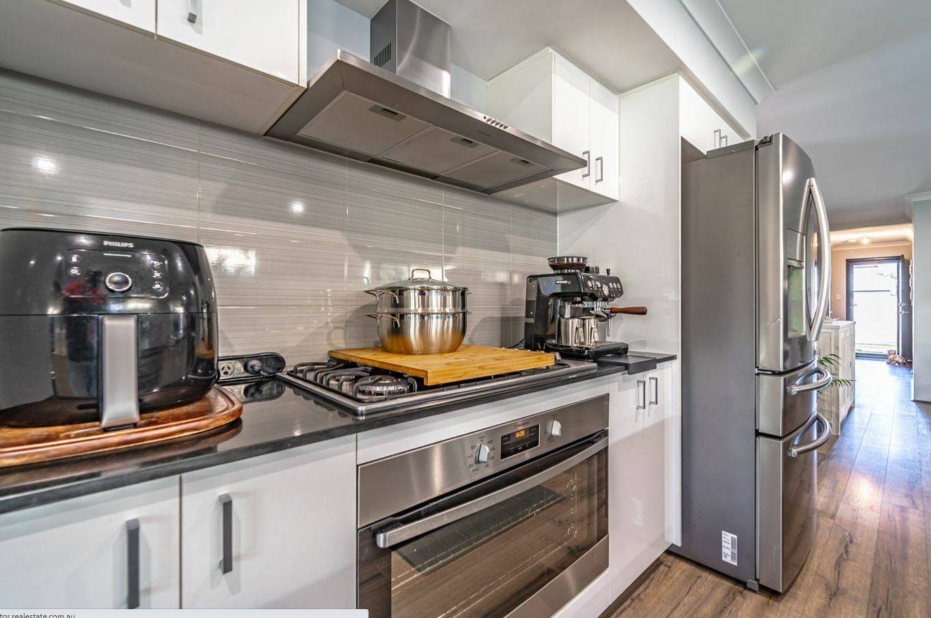 Galley style kitchen with 900mm stainless-steel appliances, stone benchtops and dishwasher