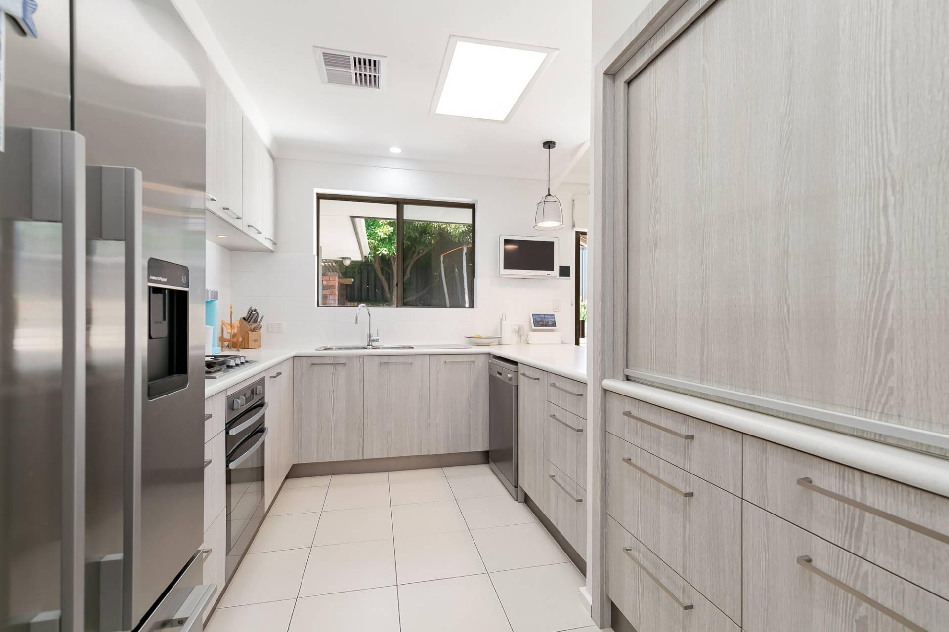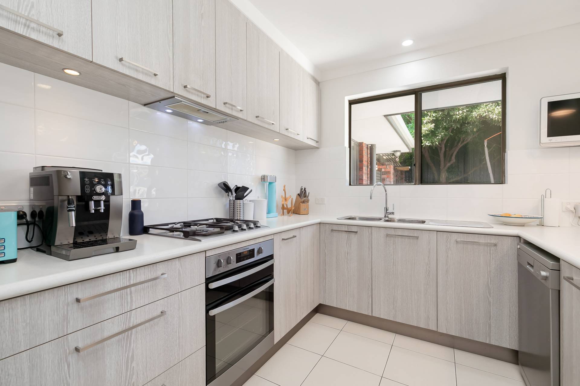 Kitchen with stainless steel appliances, double sink, ample cupboard storage and breakfast bar