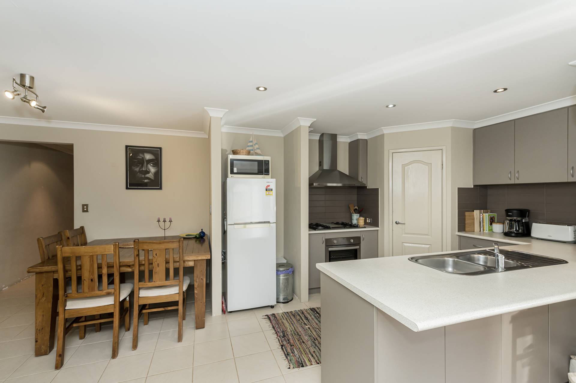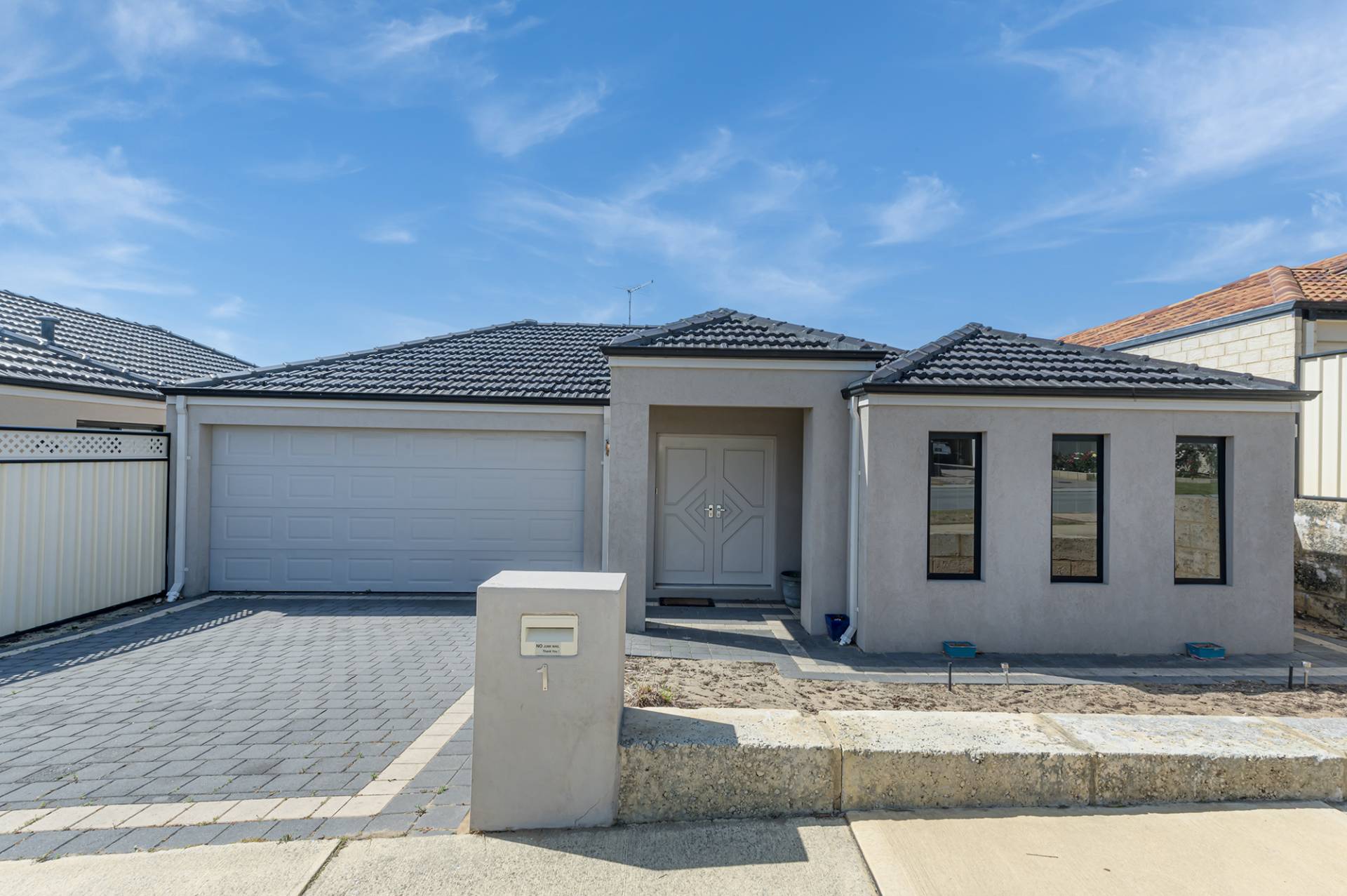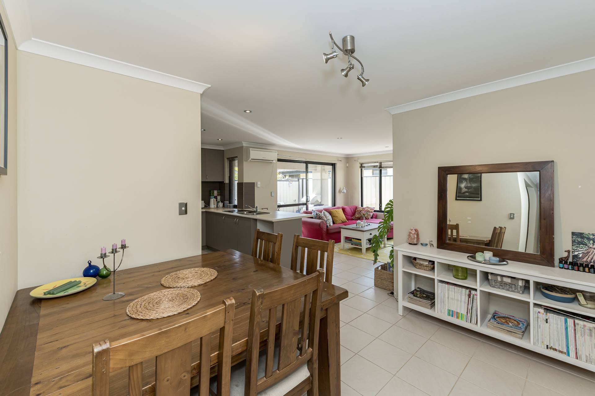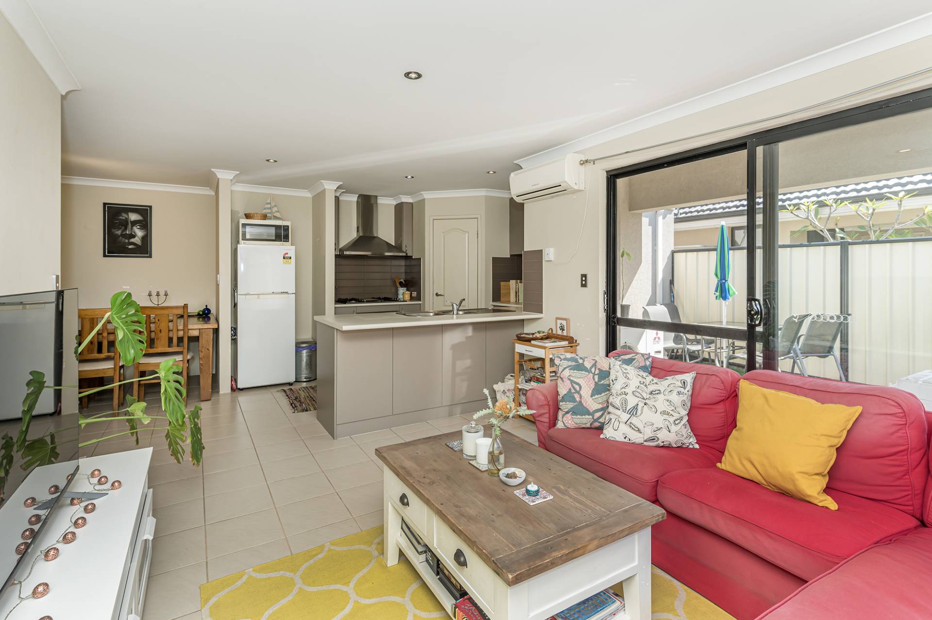 The open-plan kitchen, equipped with stainless steel appliances, a walk-in pantry, and a dishwasher, brings efficiency to daily life. Easy-to-decorate neutral tones and low-maintenance ceramic floor tiling tie the living spaces together and emphasize the simplicity that defines this home. Two additional bedrooms, located in a private wing, offer the ideal retreat with built-in robes and carpets, while nearby, the well-appointed laundry and family bathroom with a separate WC contribute to the overall practicality of the home.