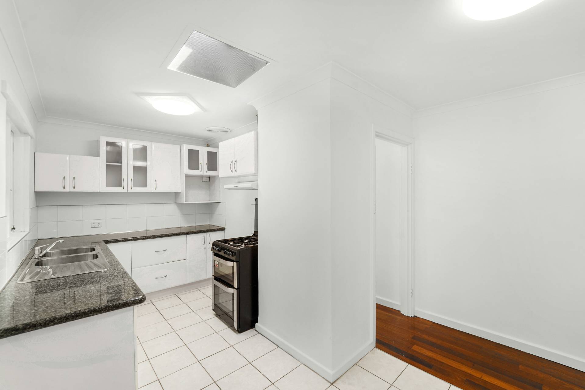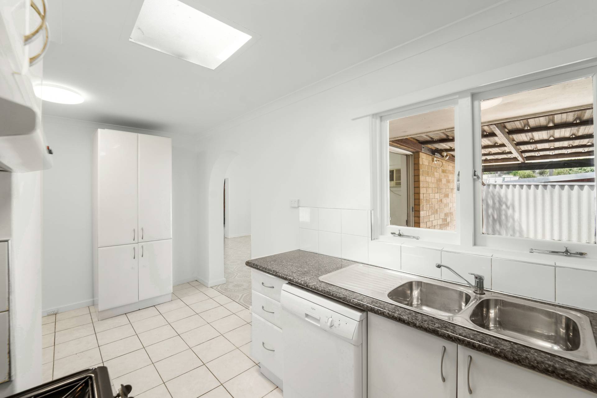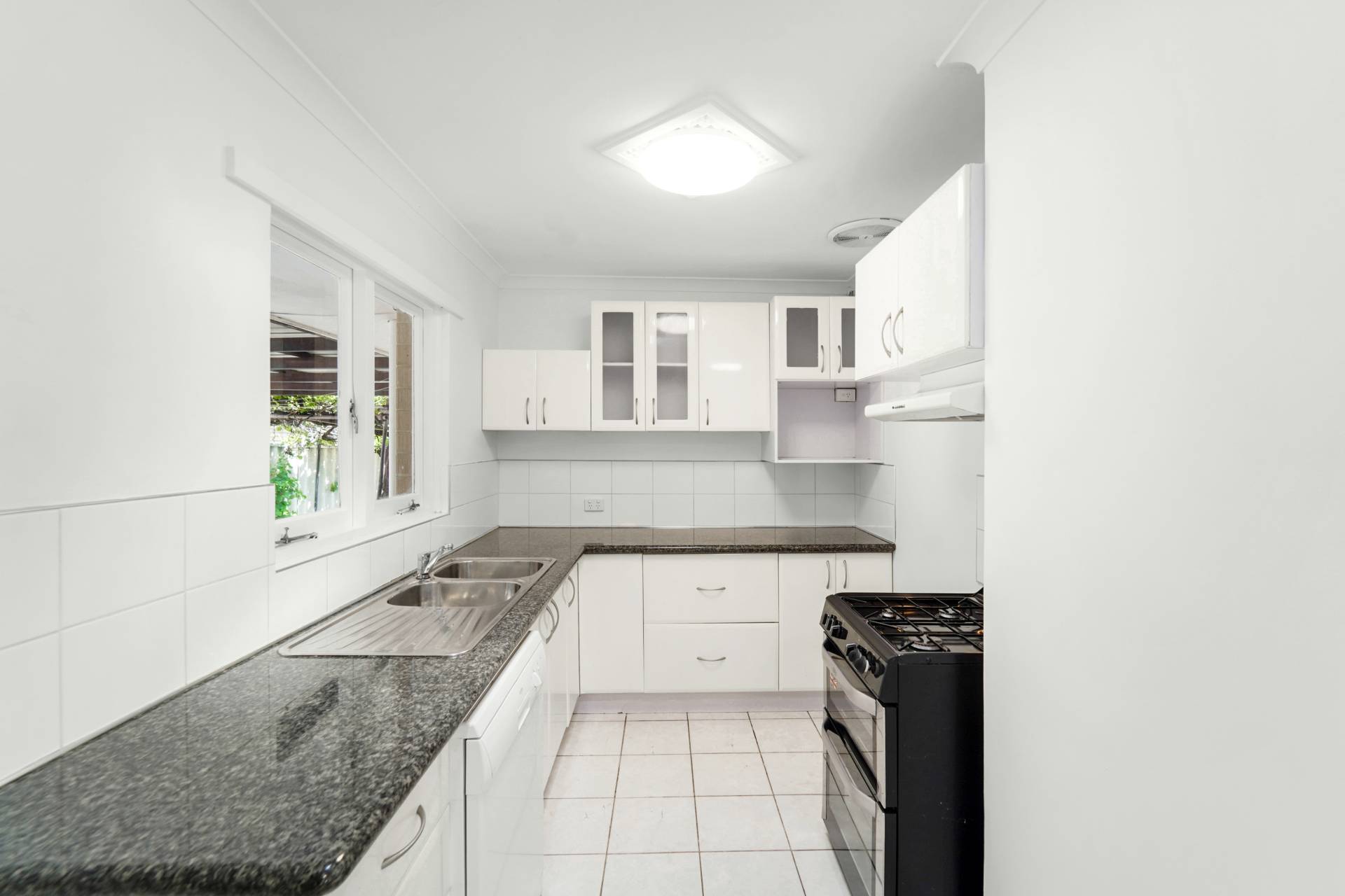 Practical kitchen that overlooks the back yard comes with plenty of storage and bench space, free-standing gas cook top and over, microwave recess, dishwasher and topped off with stone benchtops
