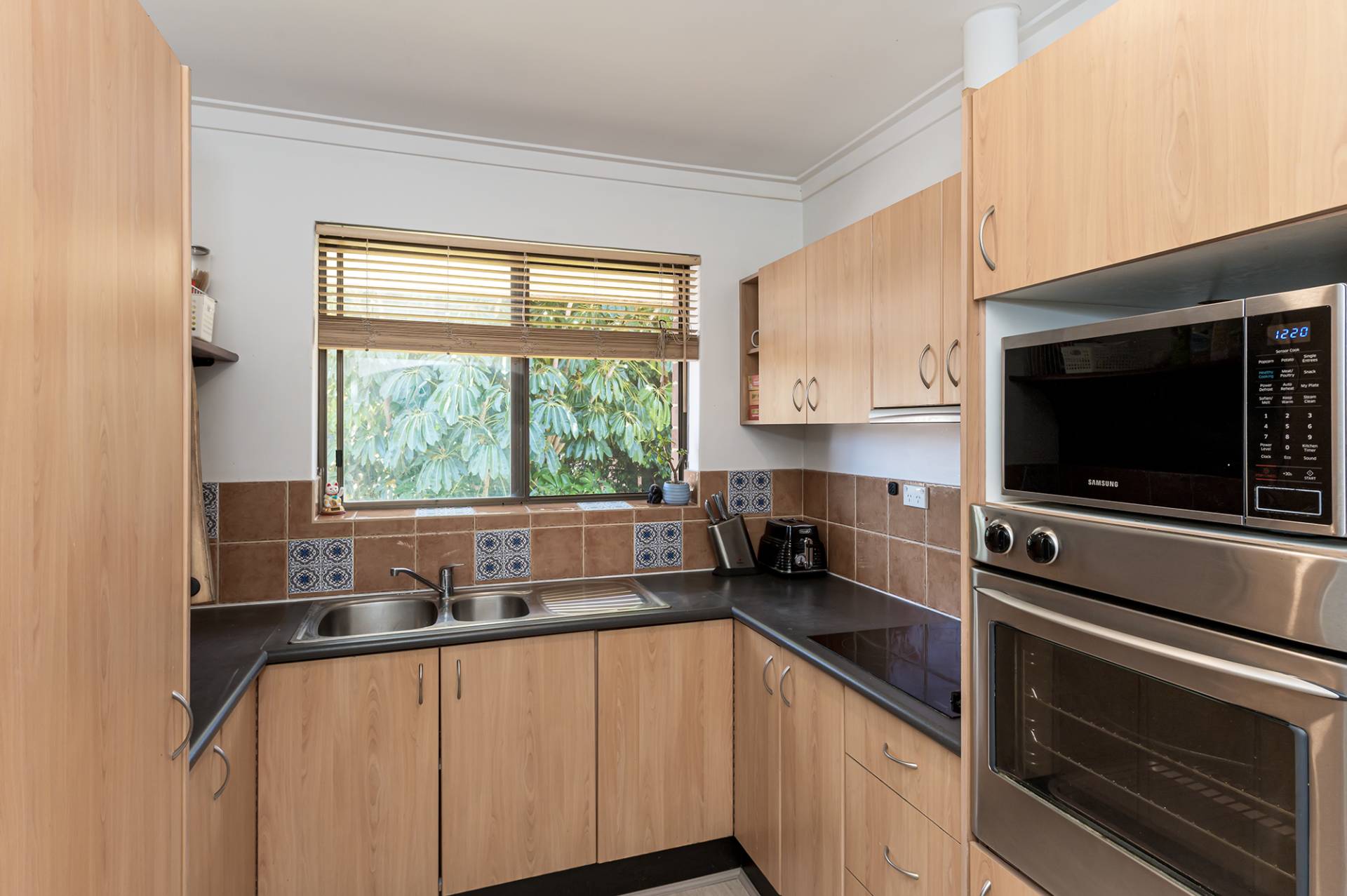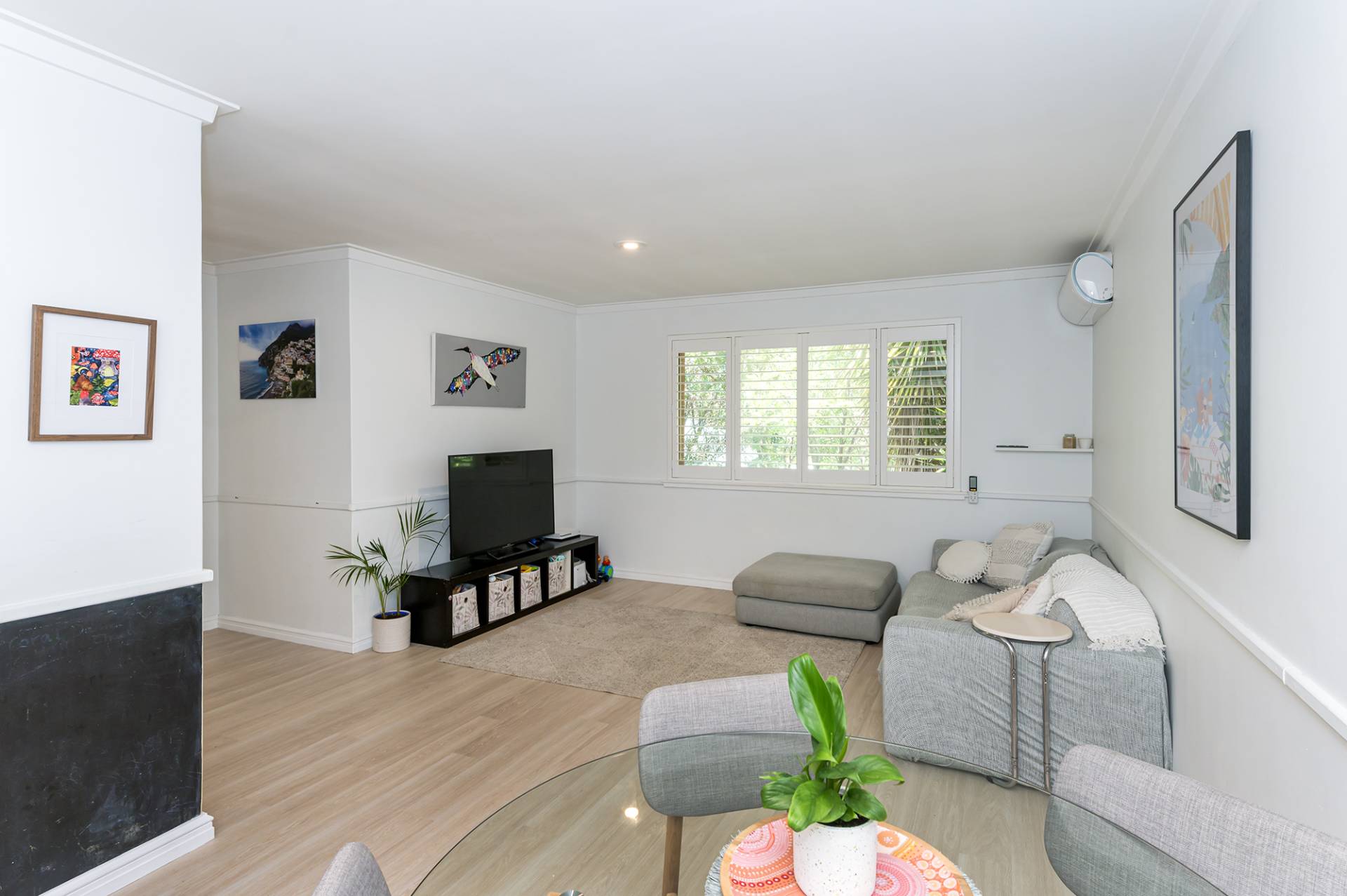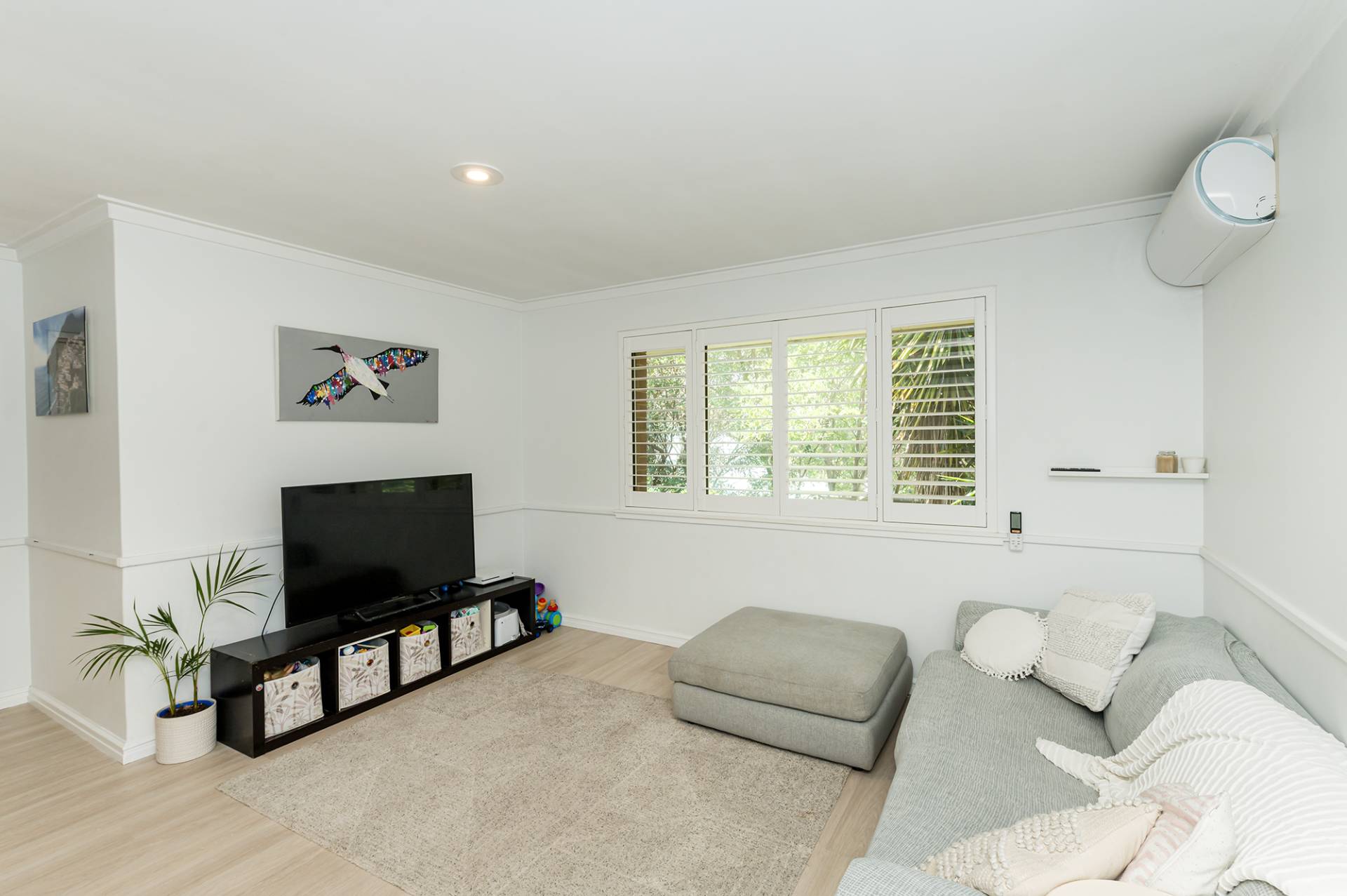 Beyond is the kitchen, with plenty of cupboard space and treetop views while both bedrooms feature the comfort of carpet and wonderful views from the generous-sized windows. The main bedroom boasts a ceiling fan, sliding mirrored robes, and split-system air-conditioning while the renovated bathroom and laundry are sleek and contemporary.
