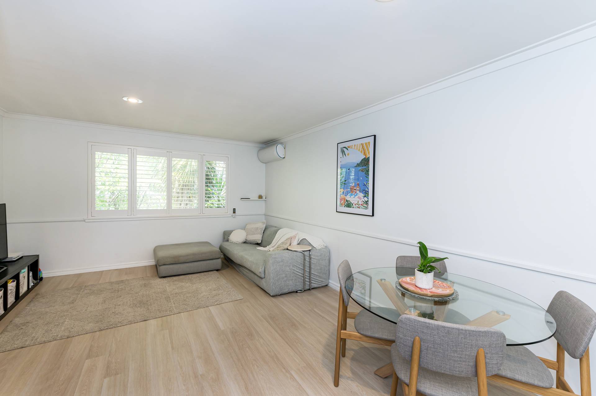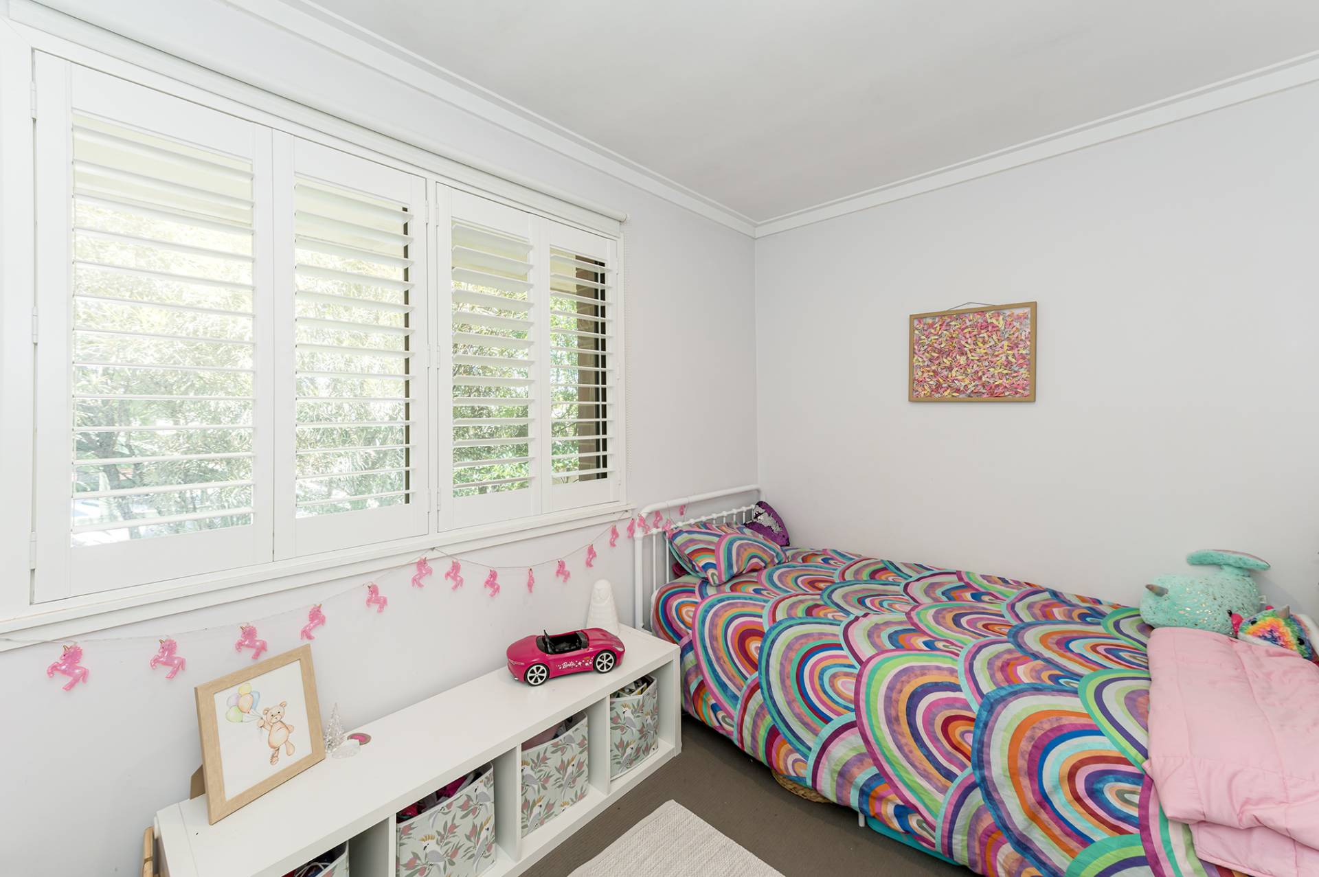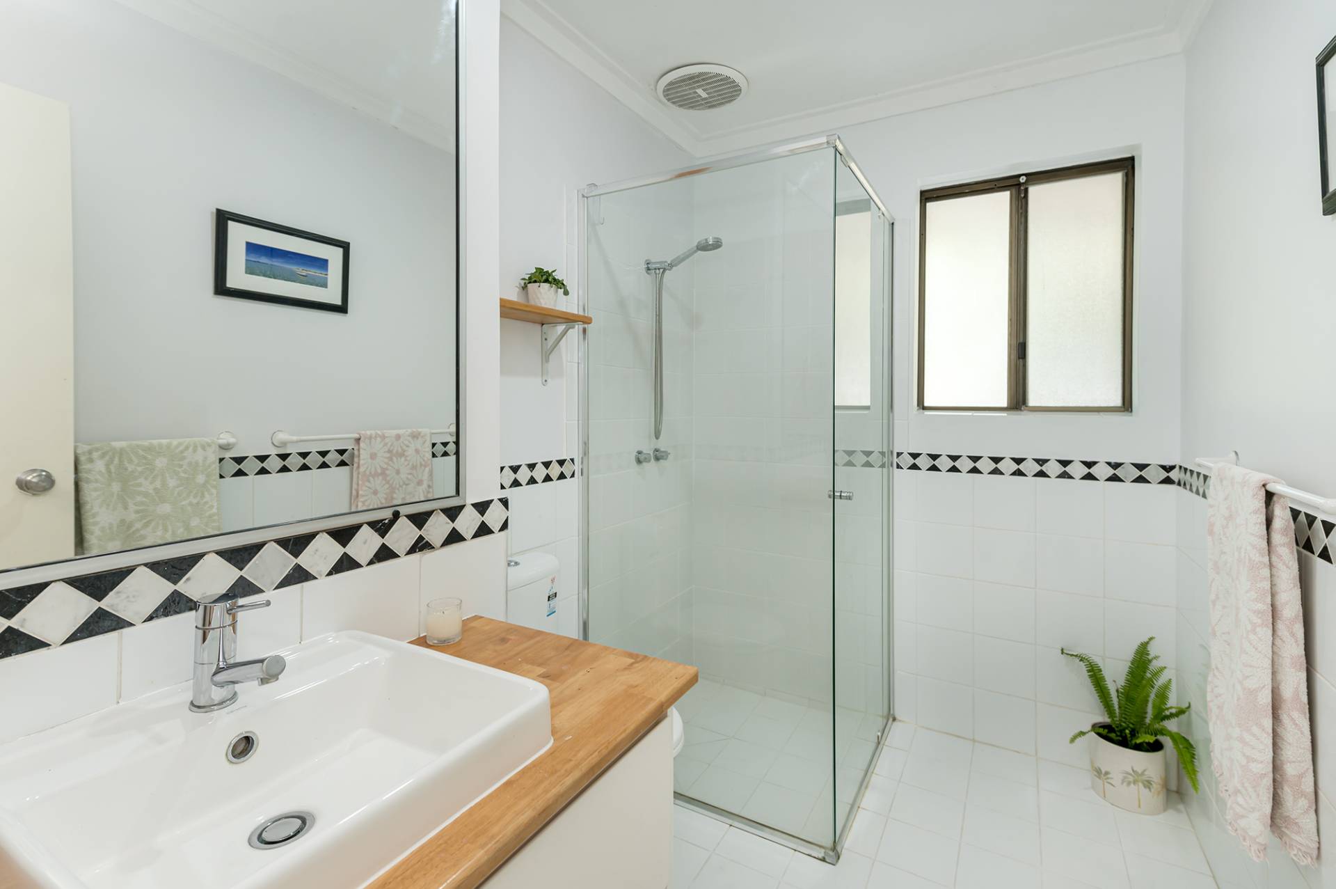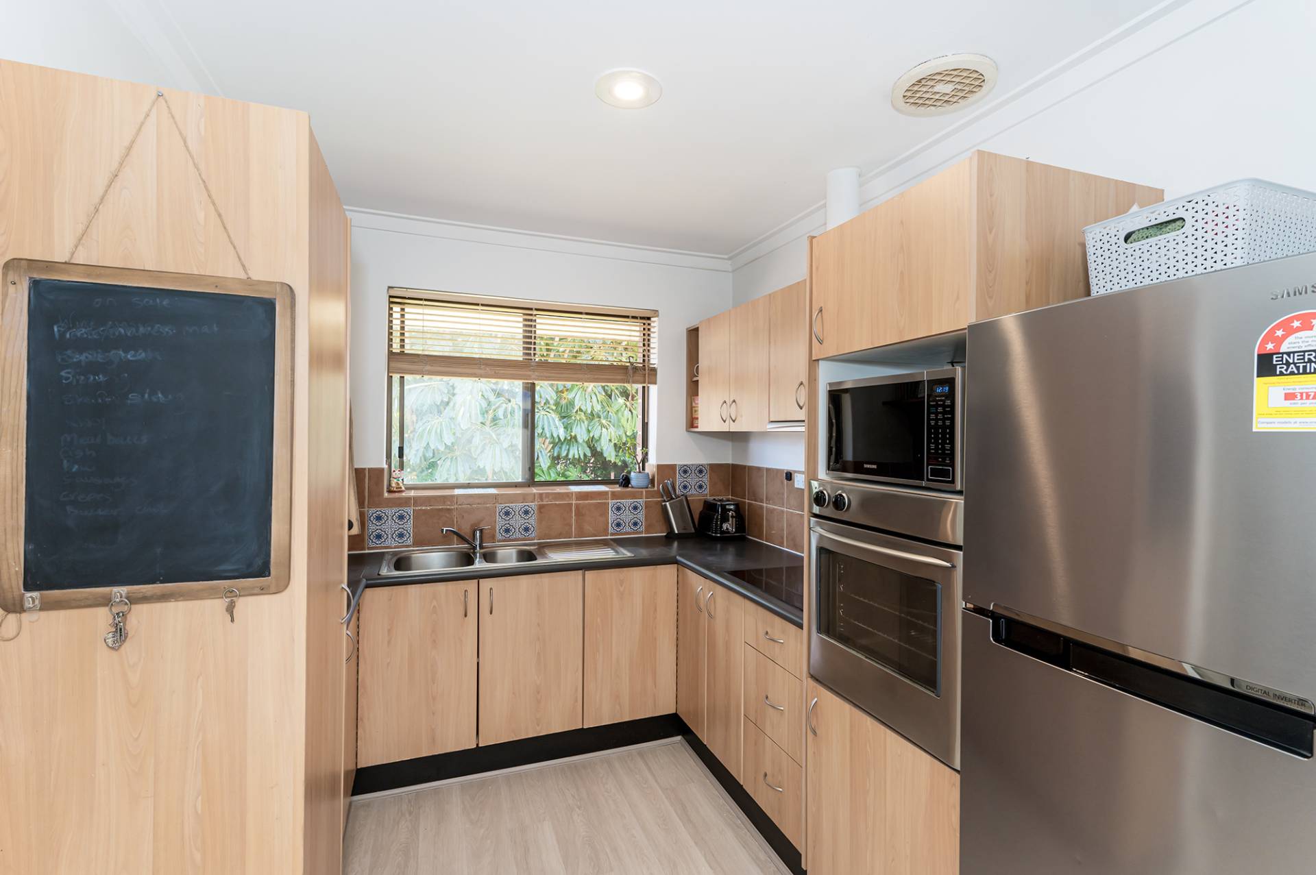 Beyond is the kitchen, with plenty of cupboard space and treetop views while both bedrooms feature the comfort of carpet and wonderful views from the generous-sized windows. The main bedroom boasts a ceiling fan, sliding mirrored robes, and split-system air-conditioning while the renovated bathroom and laundry are sleek and contemporary.