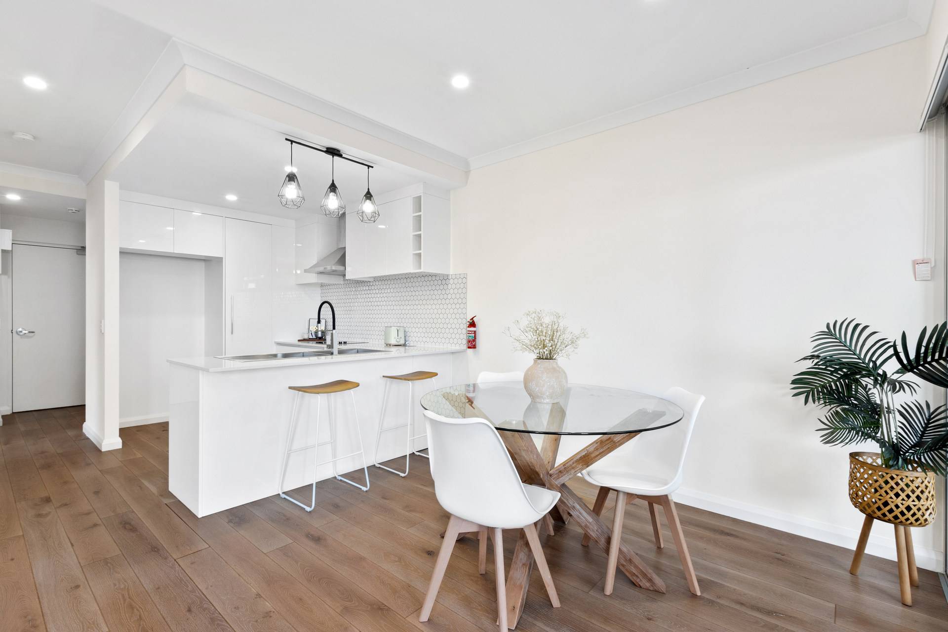 Admire the tree-top surrounds from the open plan living, dining and kitchen, complete with smart timber flooring, recessed lighting and contemporary pendants, sliding glass doors leading out to a private terrace and a bright, airy ambience.
