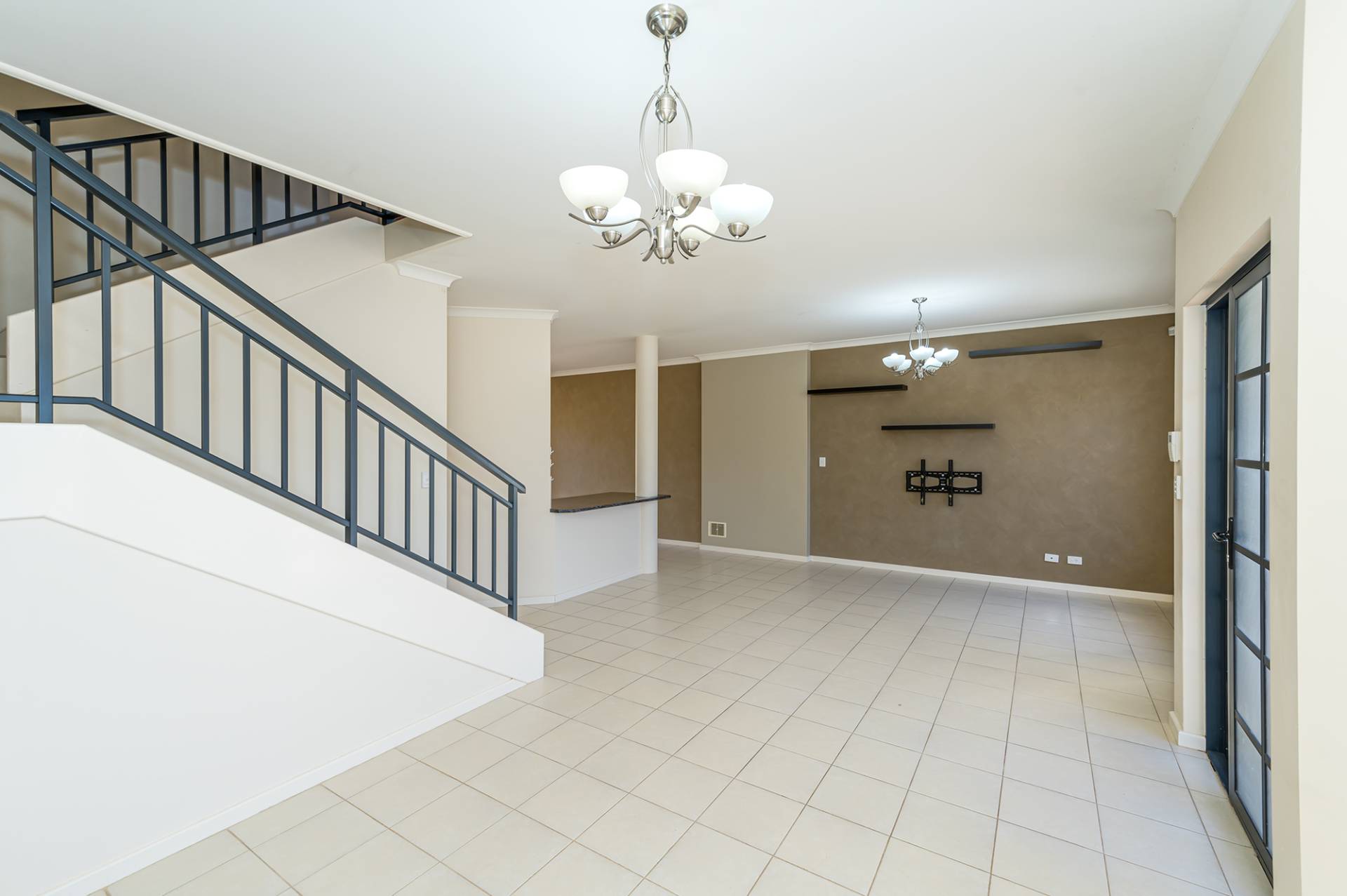 Enter the immaculately maintained downstairs open plan main living area, a tiled, clean-lined, and super low maintenance space. Here, the kitchen offers a breakfast bar, abundant storage, a large pantry, double sinks and stainless-steel appliances, including a dishwasher. Enjoy meal prep with everything at your fingertips, all while overlooking the paved alfresco courtyard. The living and dining area itself boasts elegant pendant lighting, timelessly subtle black and white interior fixtures, and a sunny front outlook.
