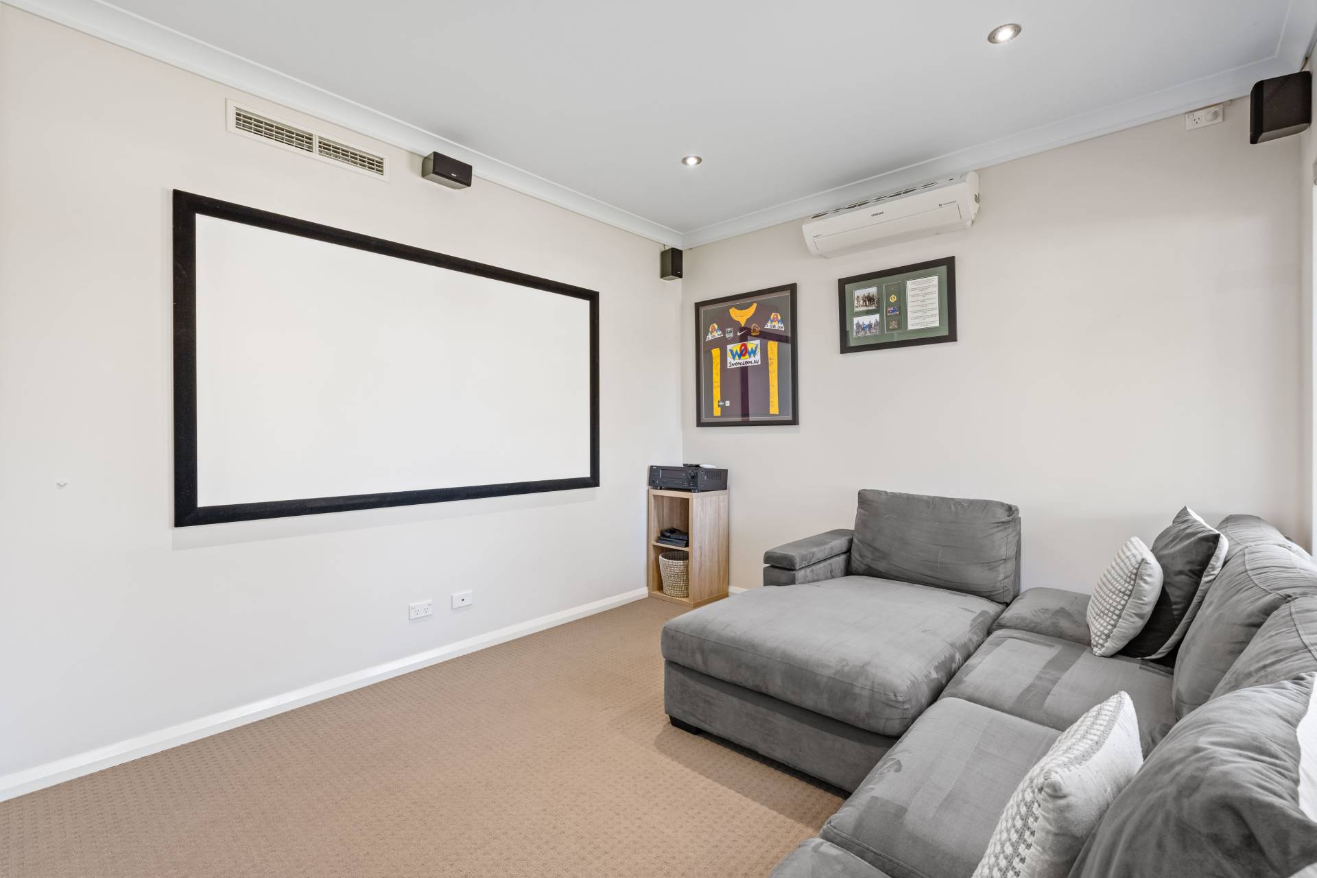 Downstairs also includes a deluxe theatre room– perfect for movie nights. Moving upstairs, you'll find bright and airy spaces with glass railings. The 2 minor bedrooms have built-in robes and ceiling fans, sharing a central bathroom.