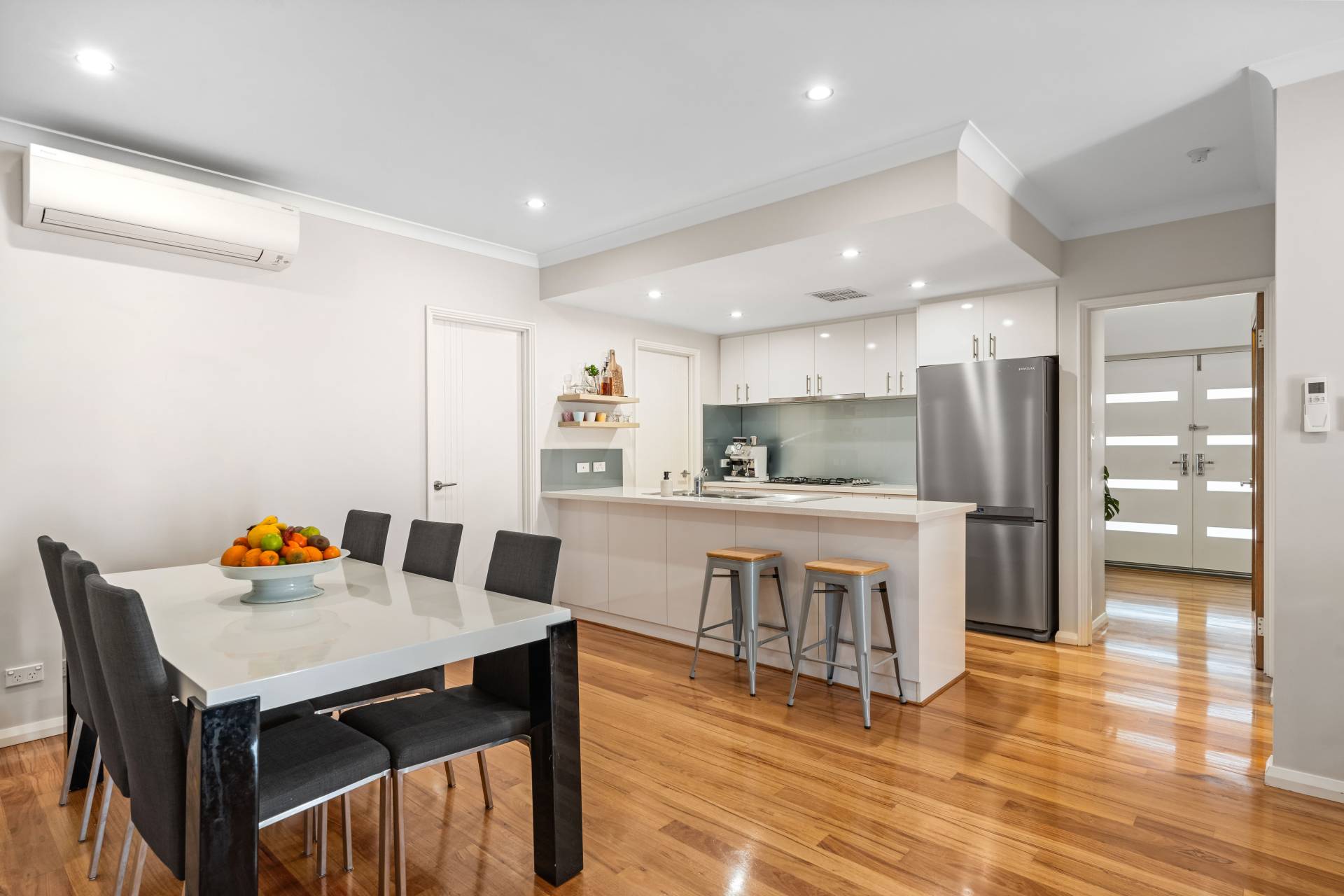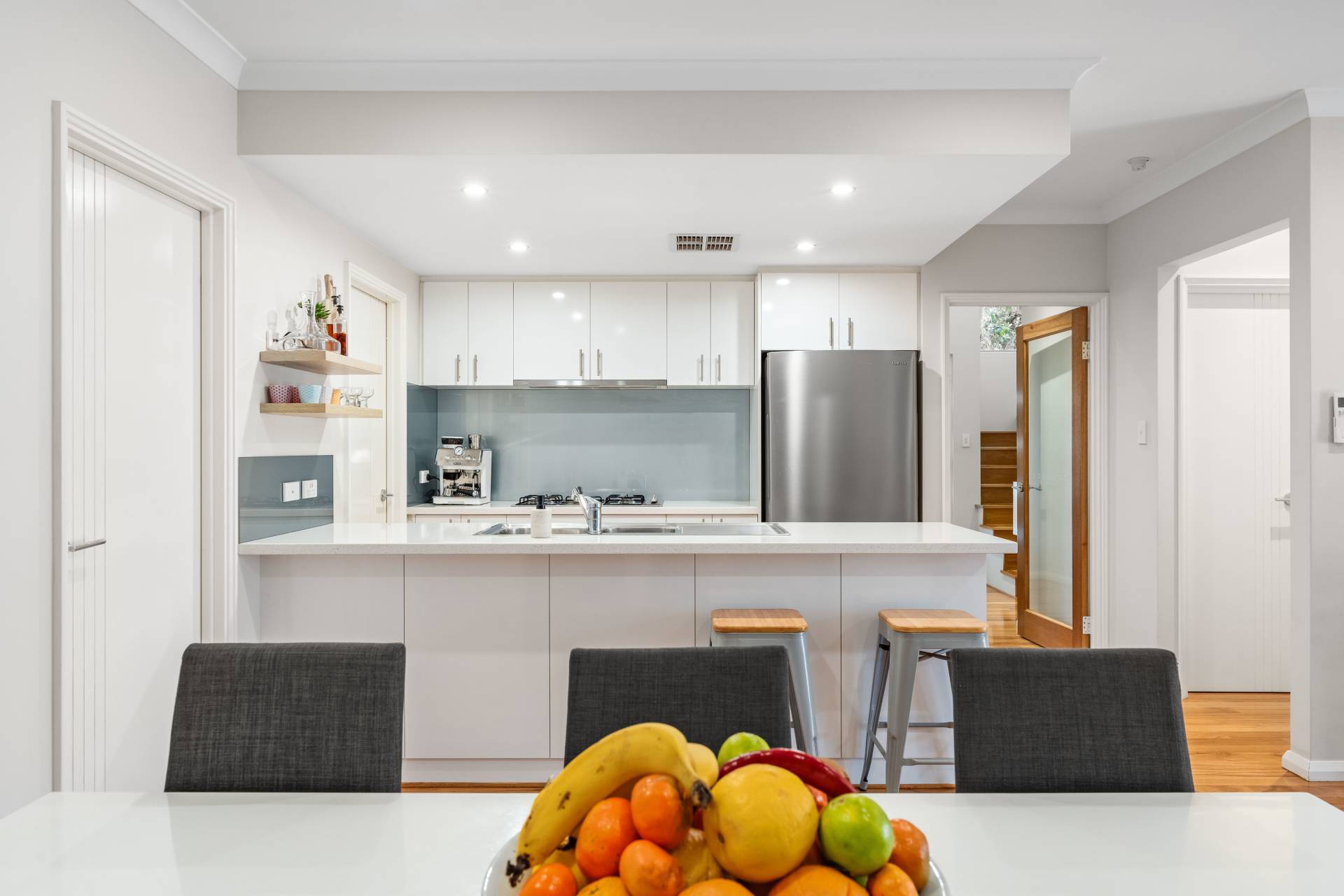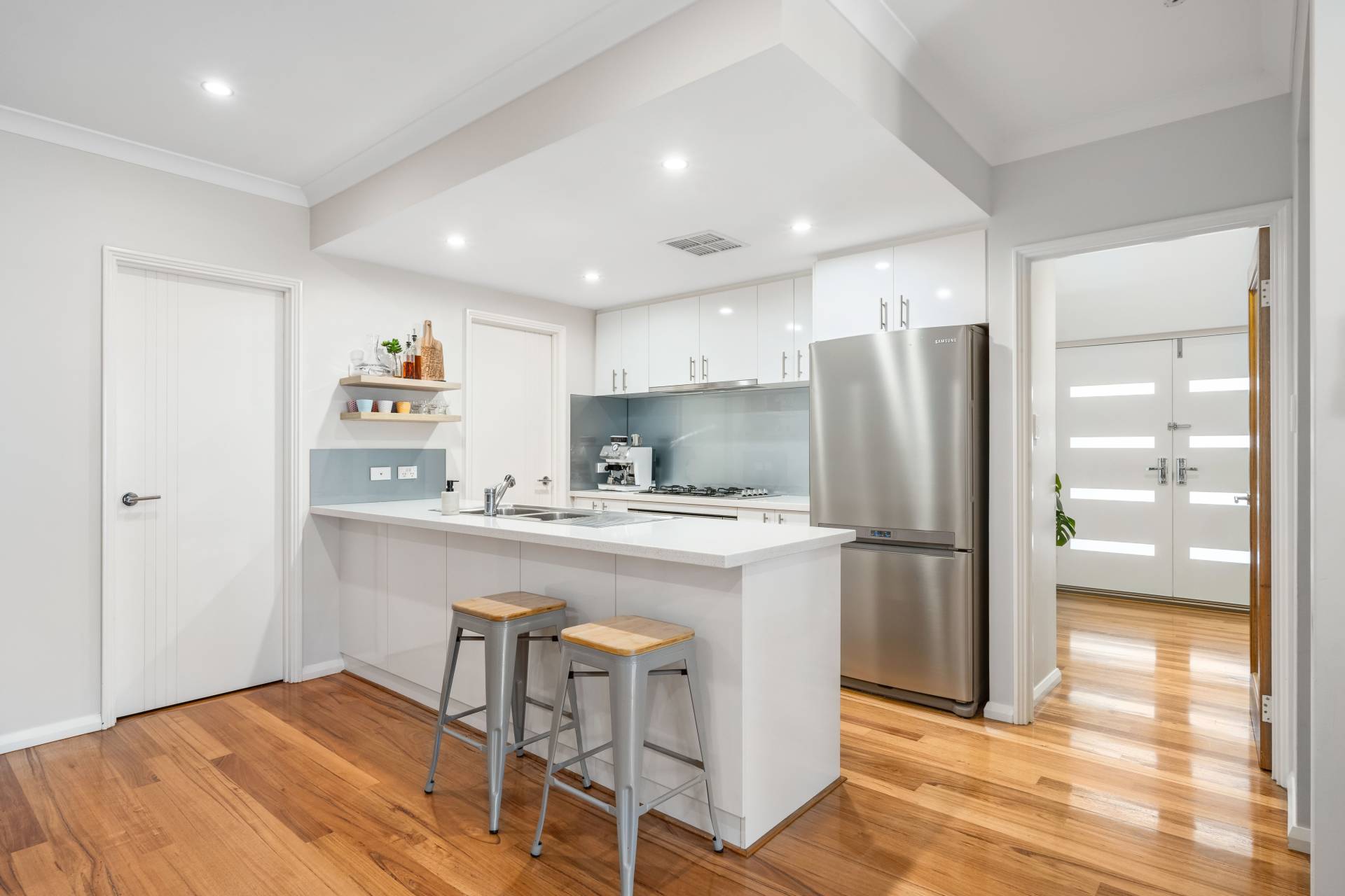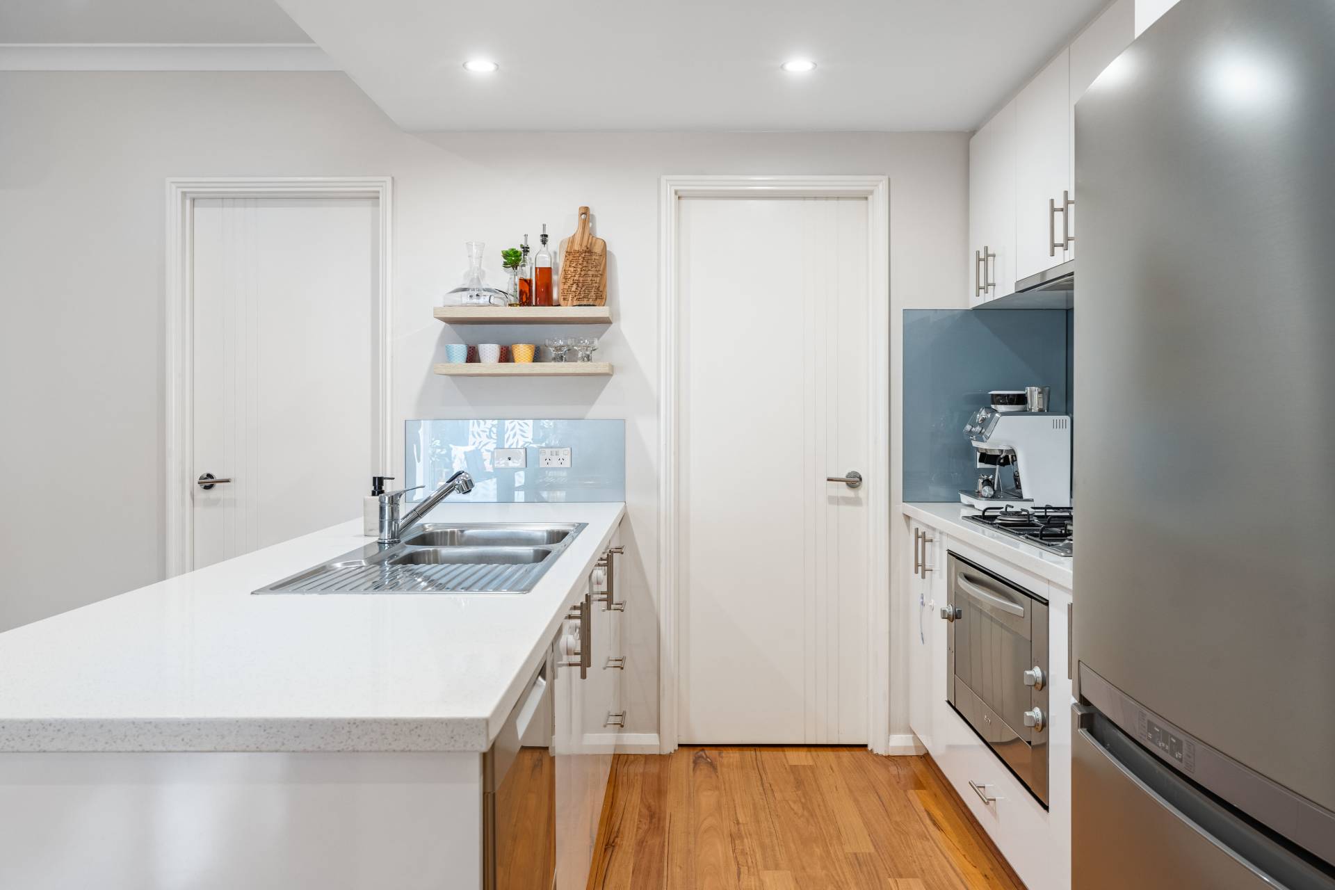 The heart of the home is the sleek white kitchen with stone benchtops, a breakfast bar, ample storage, and stainless-steel appliances. Through sliding doors, the indoor and outdoor living spaces blend seamlessly. The private north-facing alfresco area is a great spot for year-round entertaining.