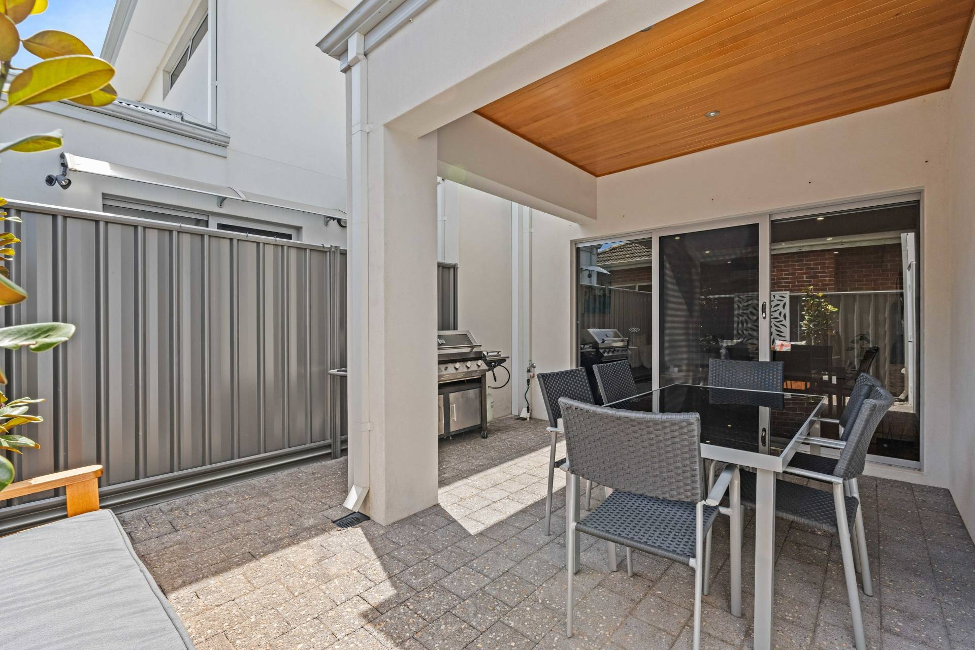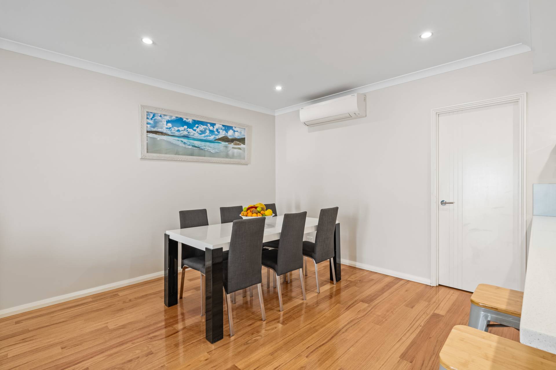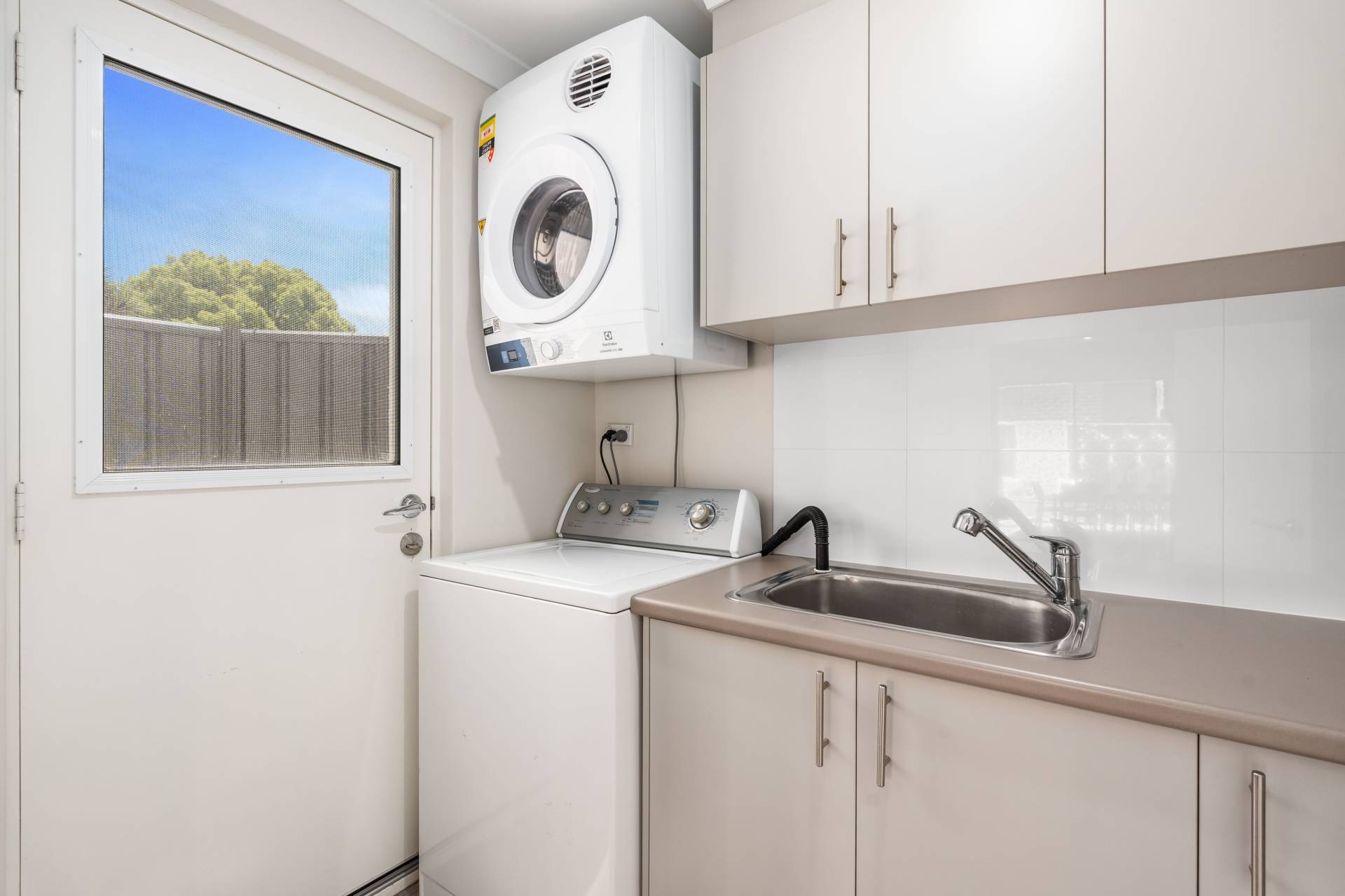 The heart of the home is the sleek white kitchen with stone benchtops, a breakfast bar, ample storage, and stainless-steel appliances. Through sliding doors, the indoor and outdoor living spaces blend seamlessly. The private north-facing alfresco area is a great spot for year-round entertaining.