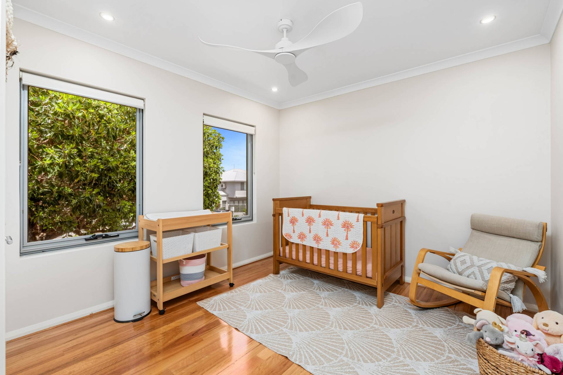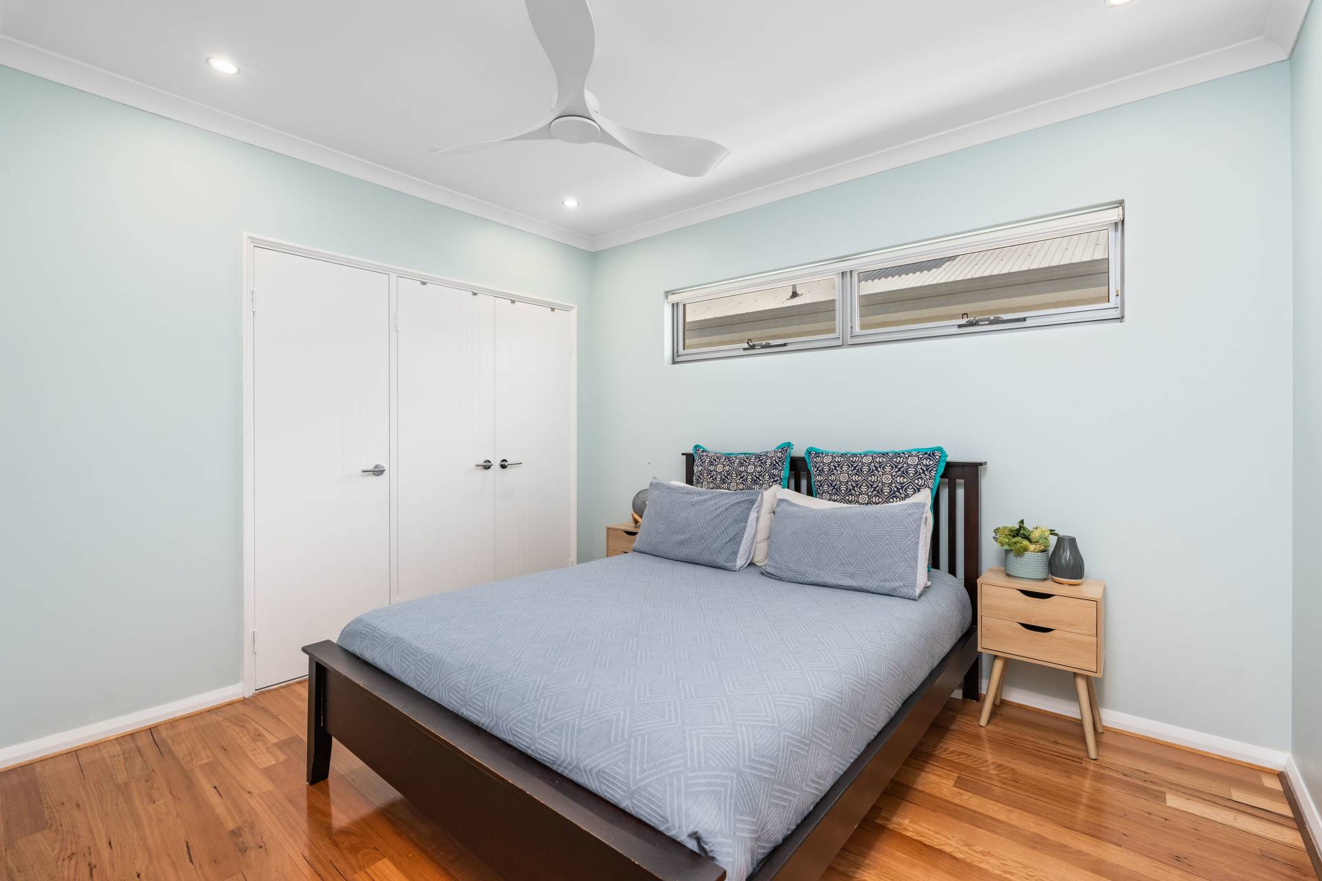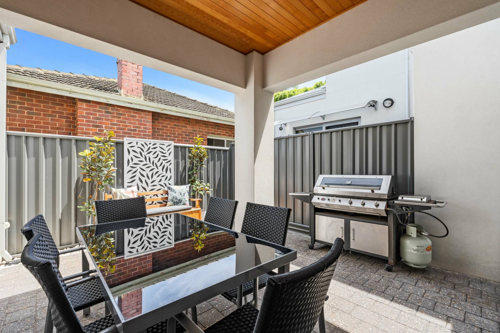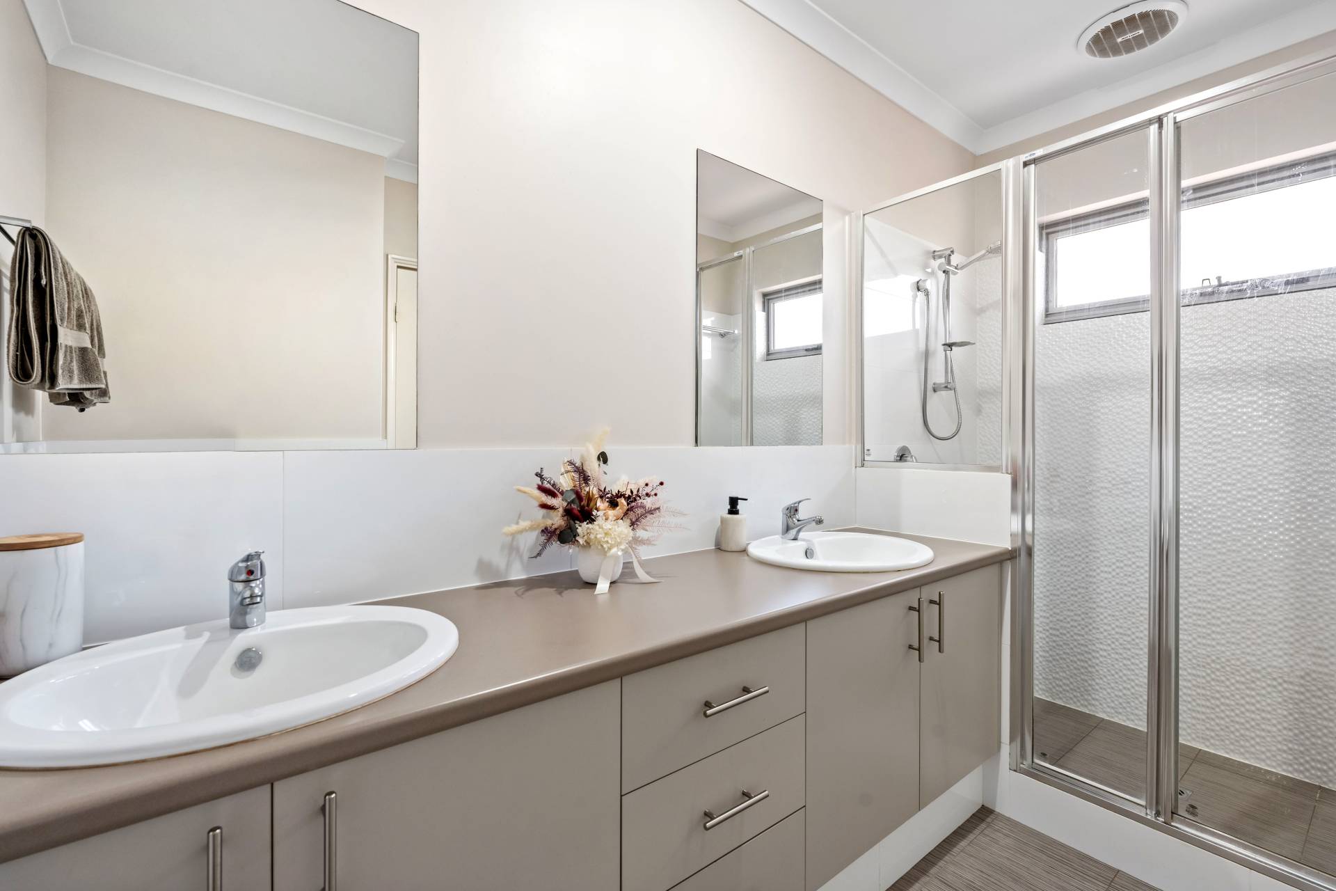 The heart of the home is the sleek white kitchen with stone benchtops, a breakfast bar, ample storage, and stainless-steel appliances. Through sliding doors, the indoor and outdoor living spaces blend seamlessly. The private north-facing alfresco area is a great spot for year-round entertaining.