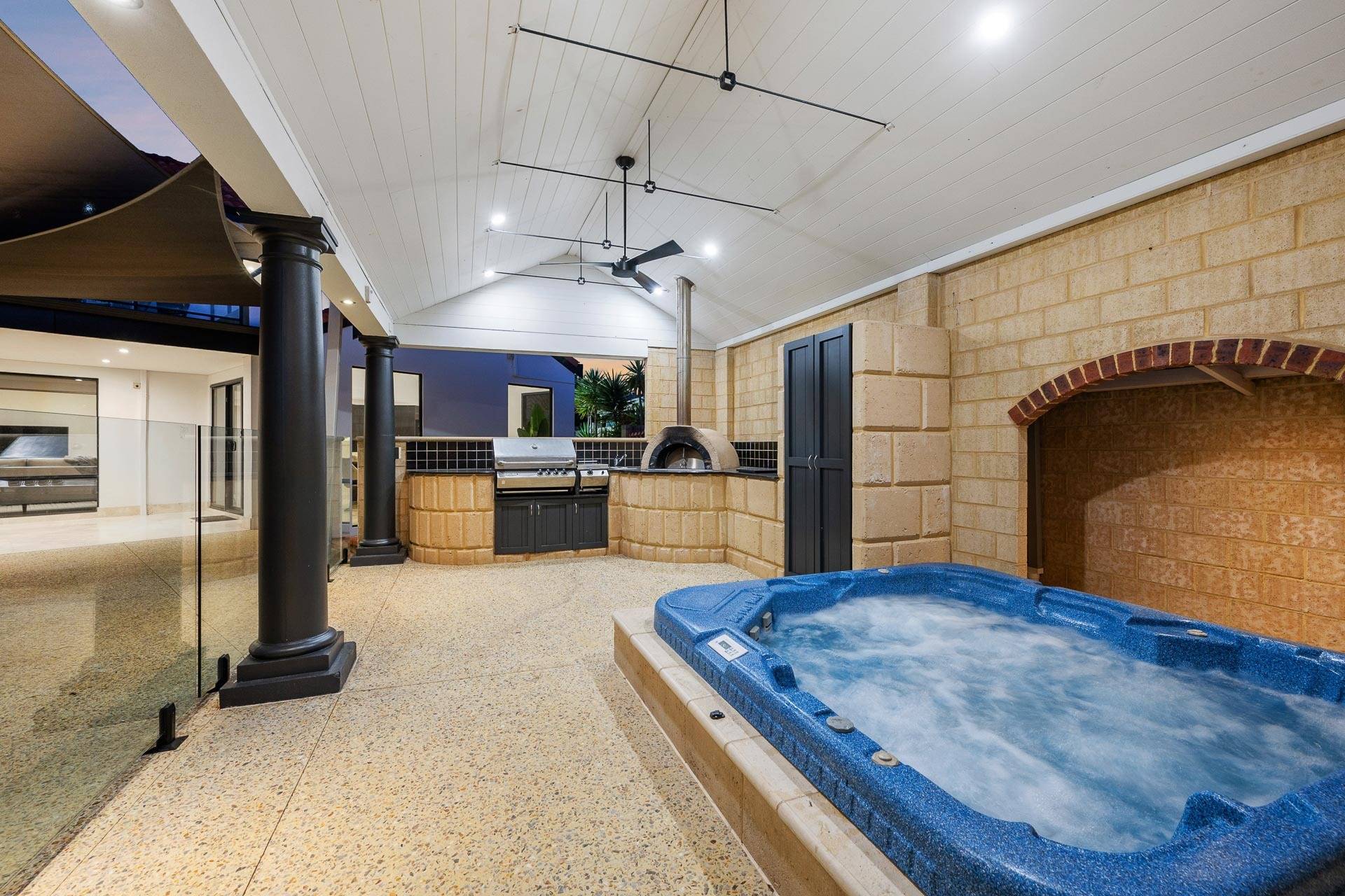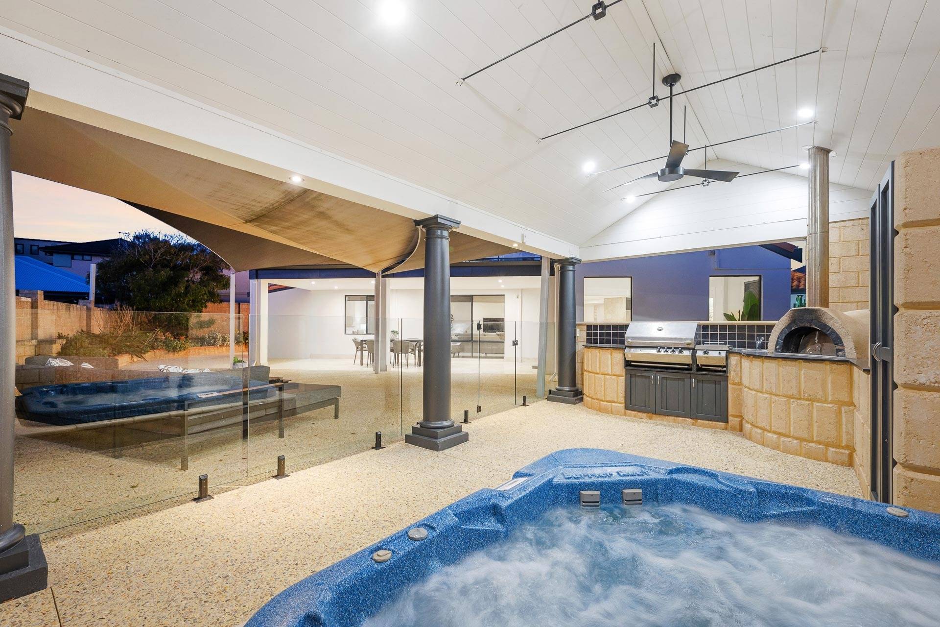 Outdoors, a shaded backyard and alfresco area feature an undercover spa, stone pizza oven, BBQ, hot plate, basin, outdoor shower, and reticulated gardens.