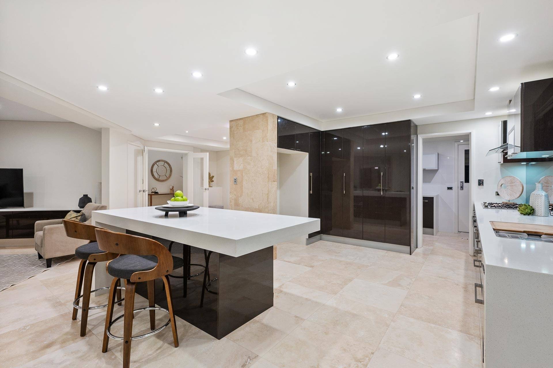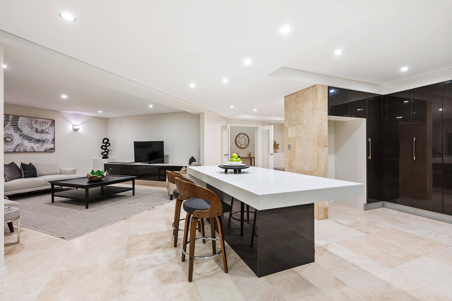 The kitchen, the heart of the home, features premium tiling, a stone feature wall, and abundant natural light. Equipped with stainless steel fixtures, stone countertops, an island with a breakfast bar, concealed breakfast and coffee prep station, soft-closing drawers, and piston-hinged overhead cabinets.
