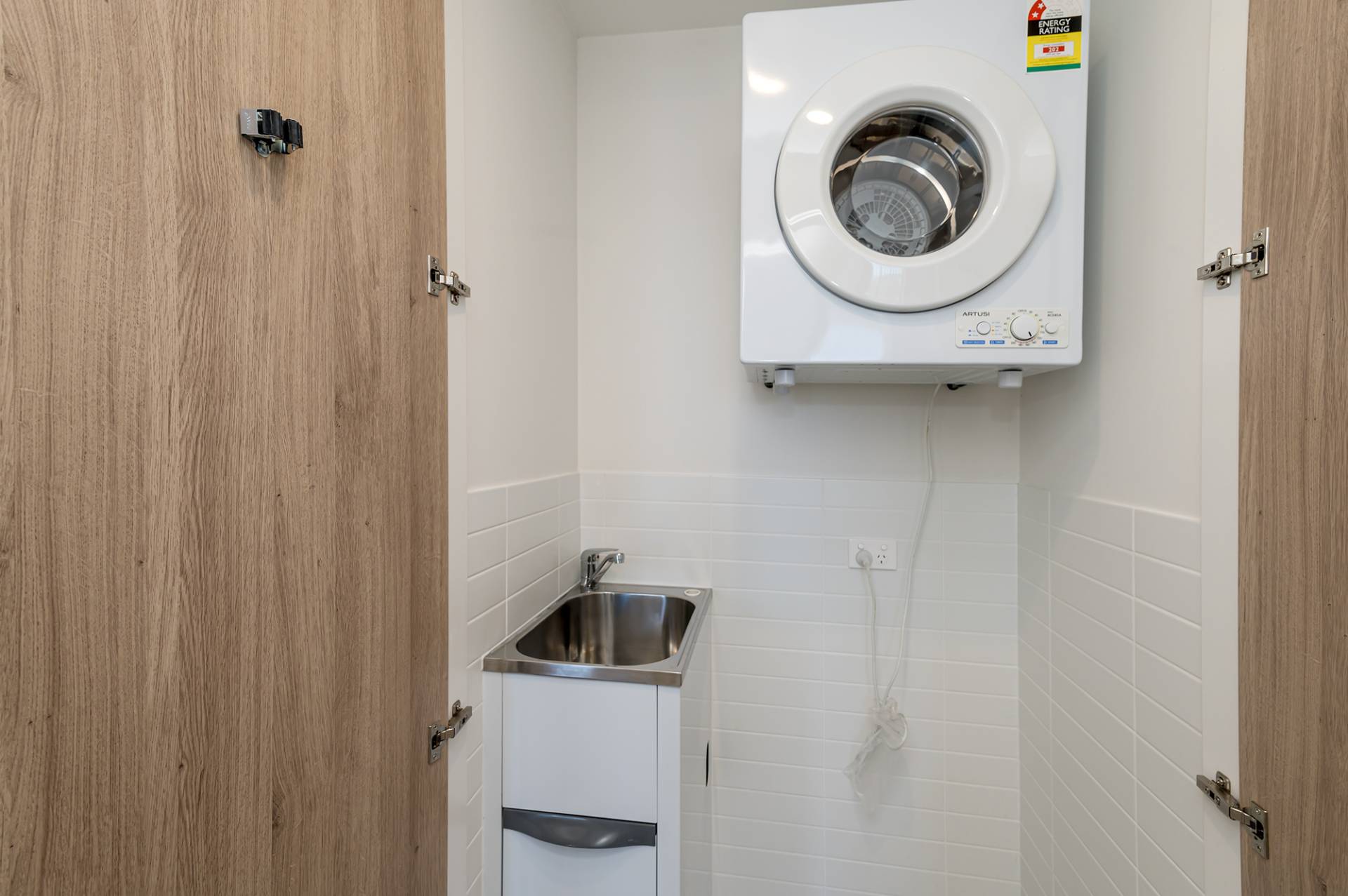 The contemporary kitchen boasts heaps of cupboard storage and stainless steel appliances, including a dishwasher - everything you need to whip up a gourmet meal when you're not exploring the local eateries. This apartment also includes an internal European-style laundry for day-to-day convenience.