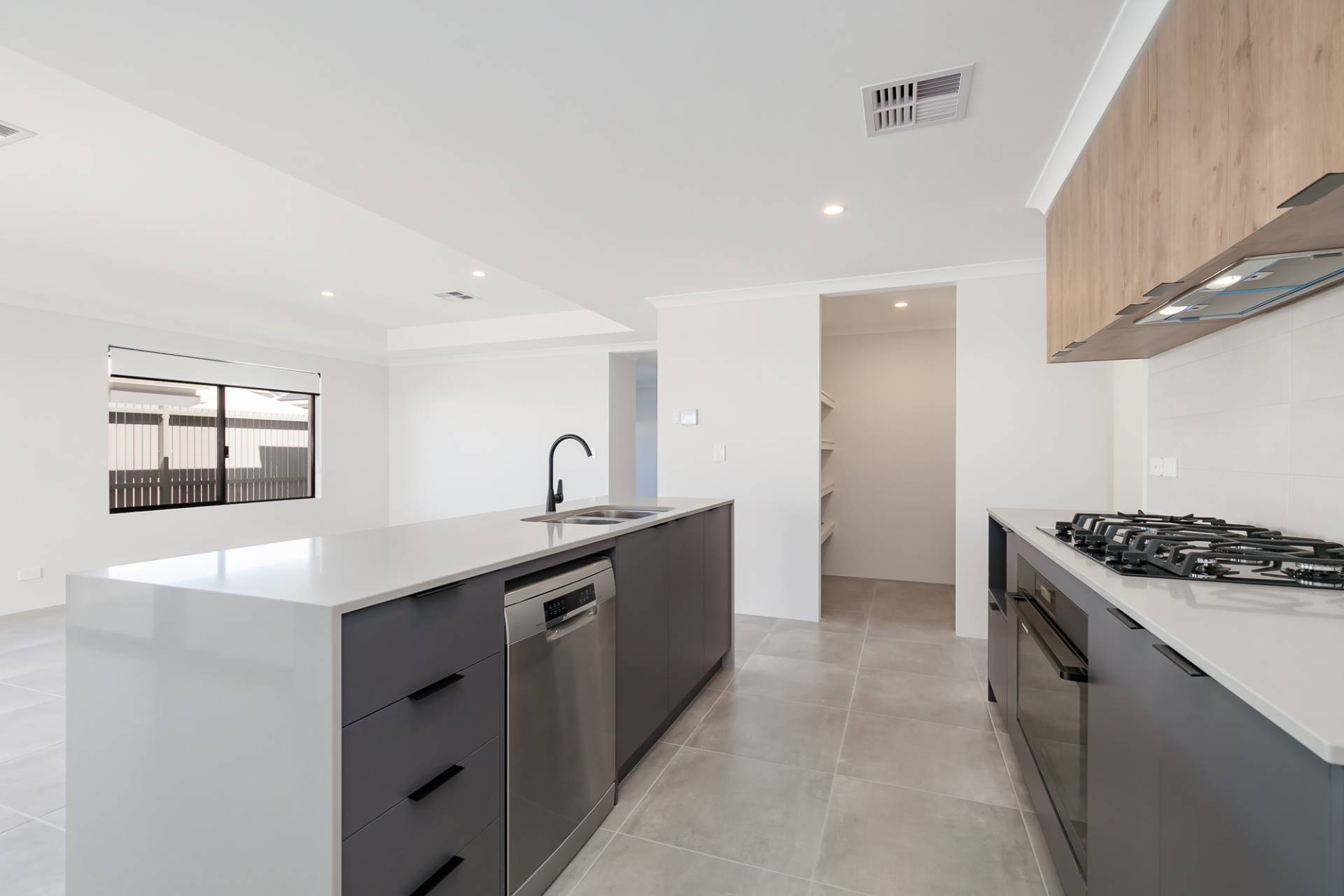 Stylish kitchen with a large gas cooktop and oven, double sink and stone benchtops