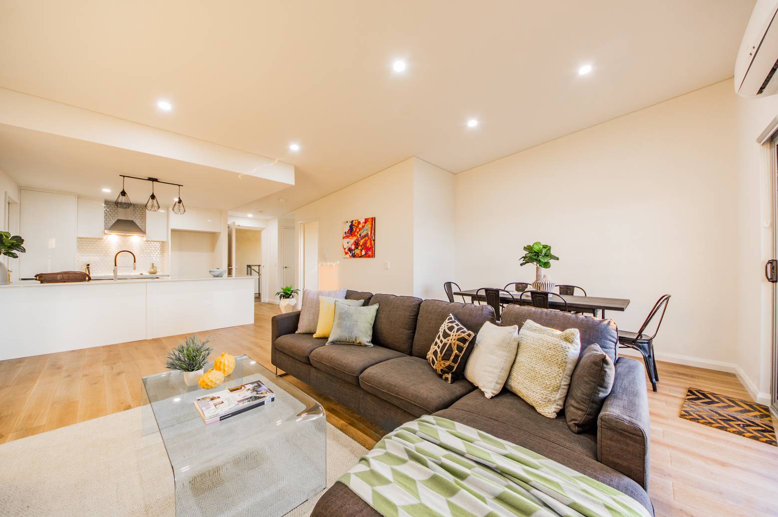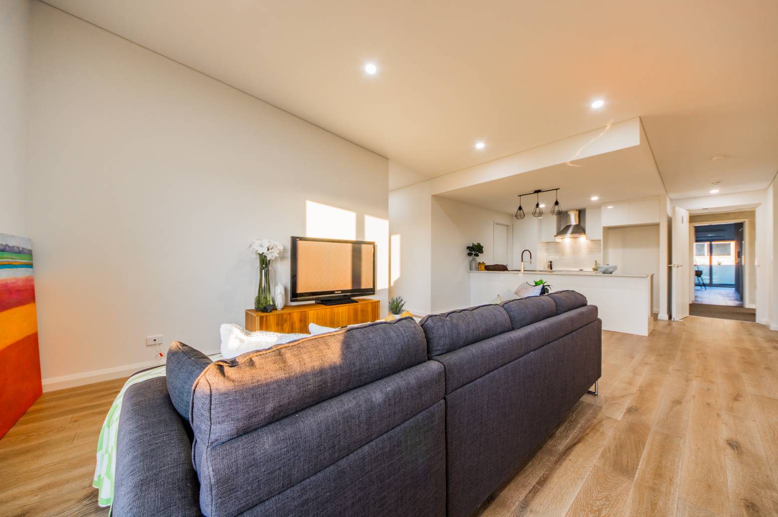 Admire the tree-top surrounds from the open plan living, dining and kitchen, complete with smart timber flooring, recessed lighting and contemporary pendants, sliding glass doors leading out to a private terrace and a bright, airy ambience.