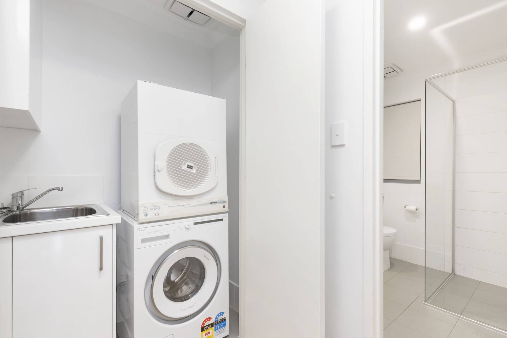 A King-sized master bedroom features mirrored built-in-robes, parkland views, sheer and block-out floor-to-ceiling curtains, ensuite bathroom and terrace access for a tranquil outdoor escape. Queen-sized bedrooms 2 & 3, as well as the main bathroom, are privately located on the other side of the apartment They feature mirrored-door built-in-robes and windows with block-out blinds looking onto the terrace lined by established trees. A laundry recess with doors is also located in this wing.
