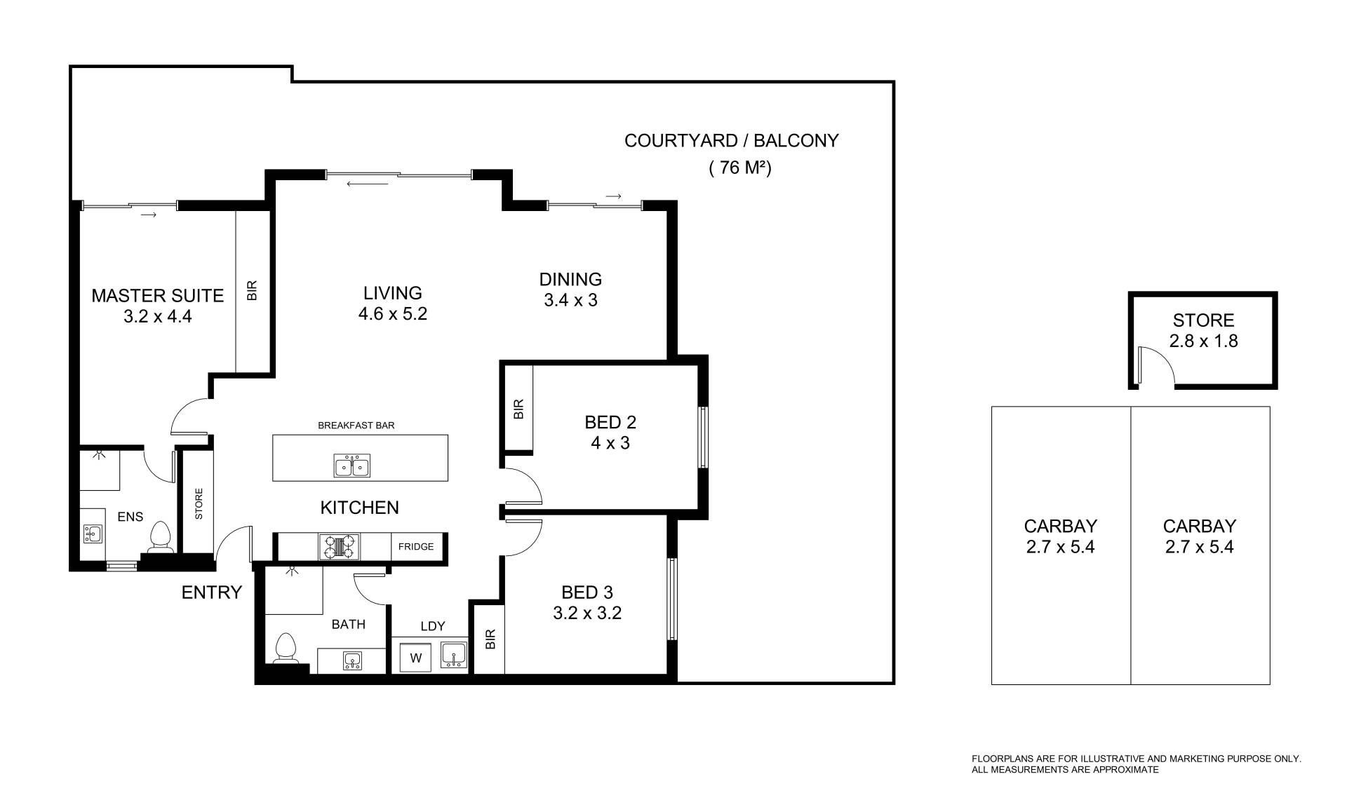 • 2 car bays (side by side) located only 30 metres from the apartment front door on the same level