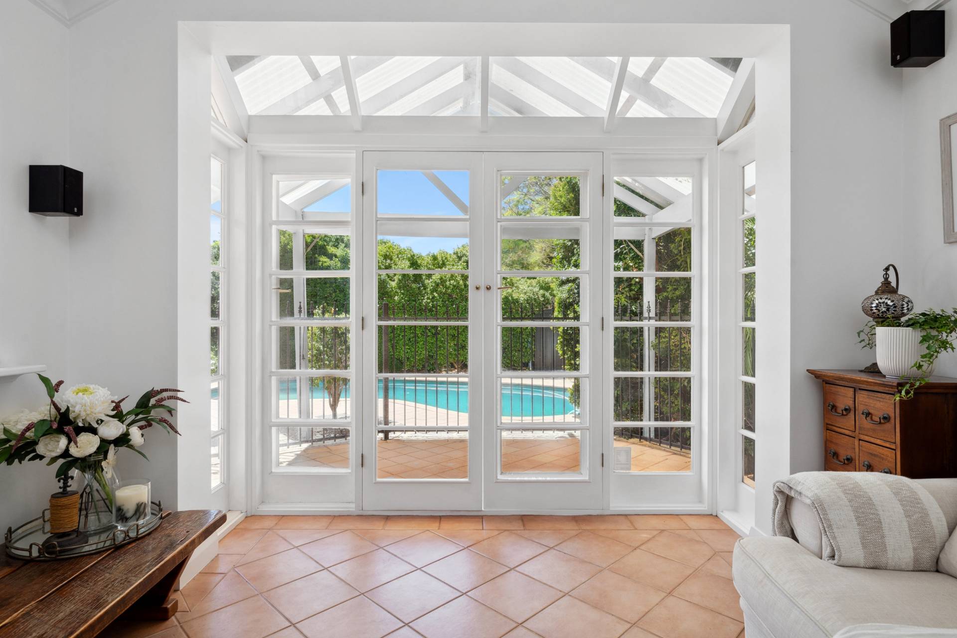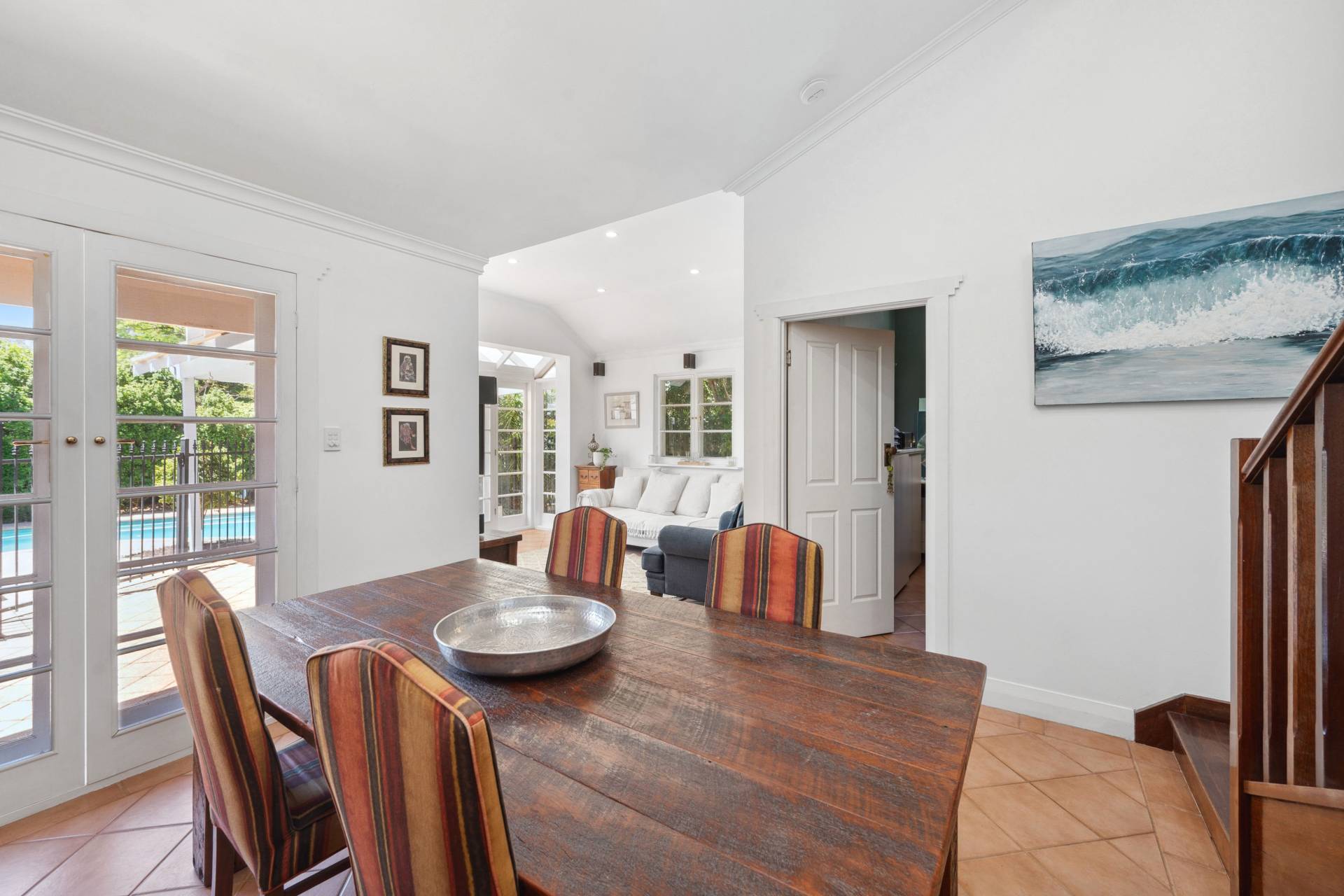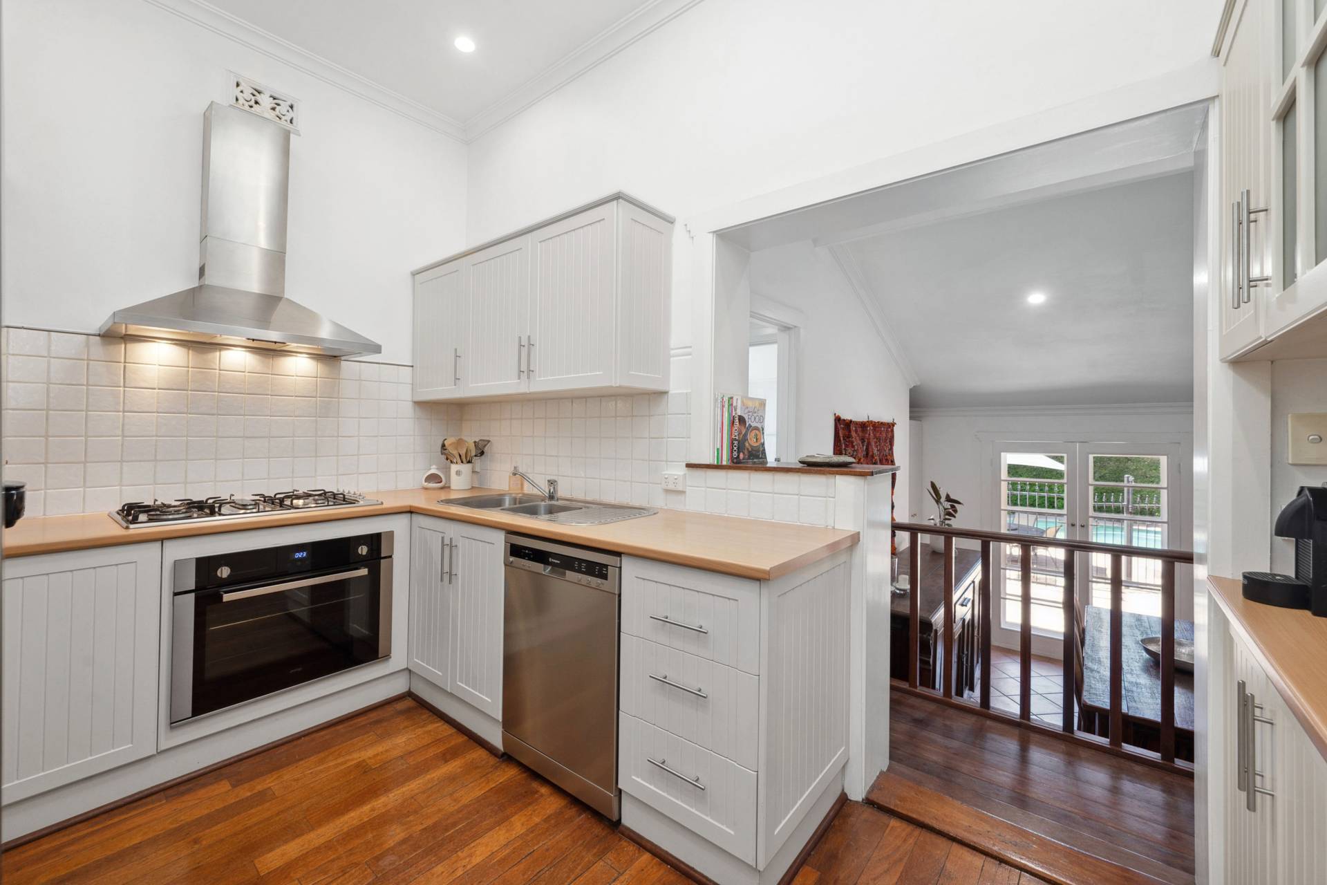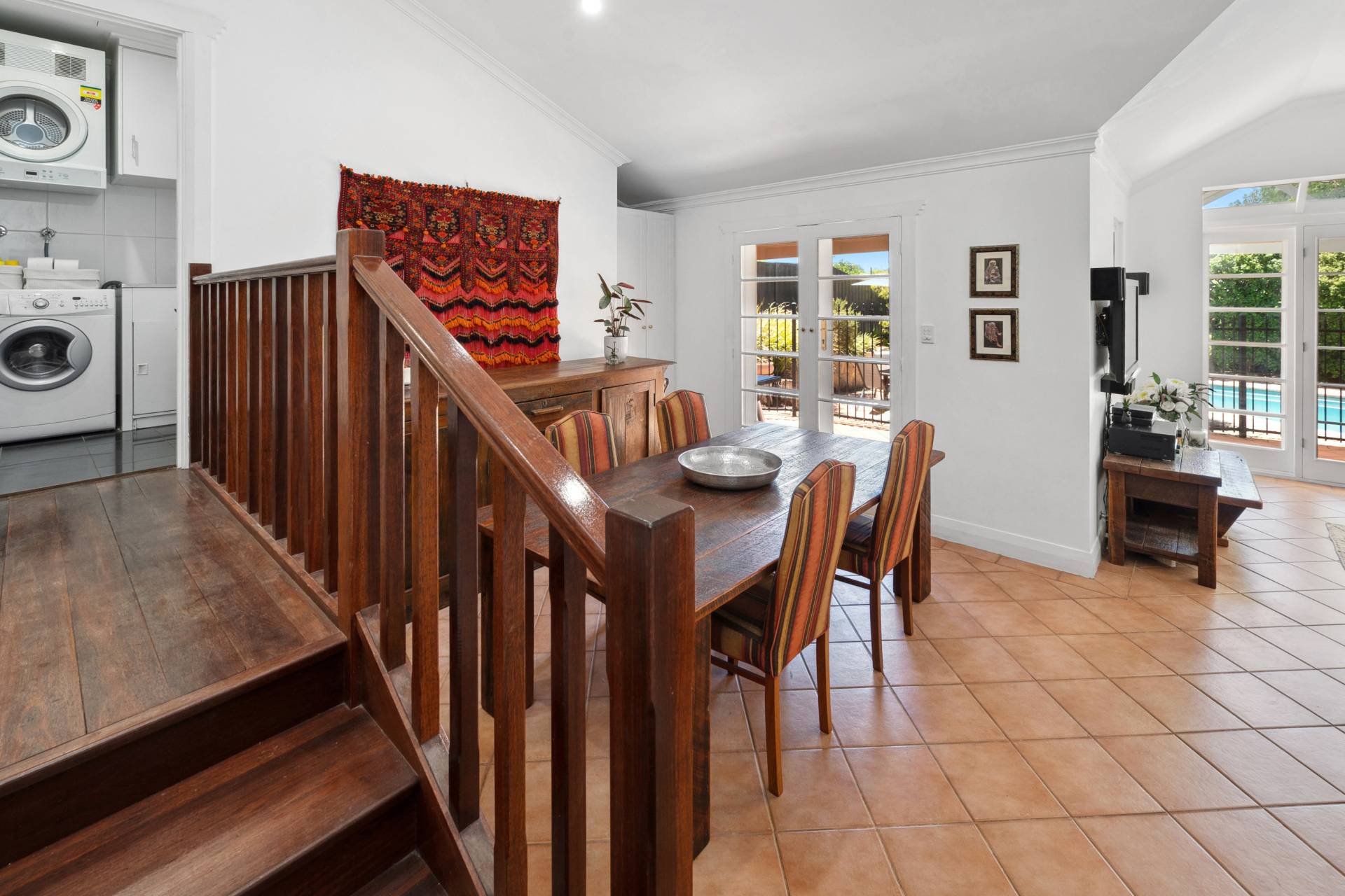 Separating the two levels is the chef's domain, adorned with stainless appliances, including a gas cooktop, electric oven, and dishwasher. A jarrah staircase leads down to the spacious extension, a family and dining area with raked and vaulted ceilings. French doors with waterfall windows open to a pitched alfresco pergola, with a sparkling below-ground swimming pool beyond.