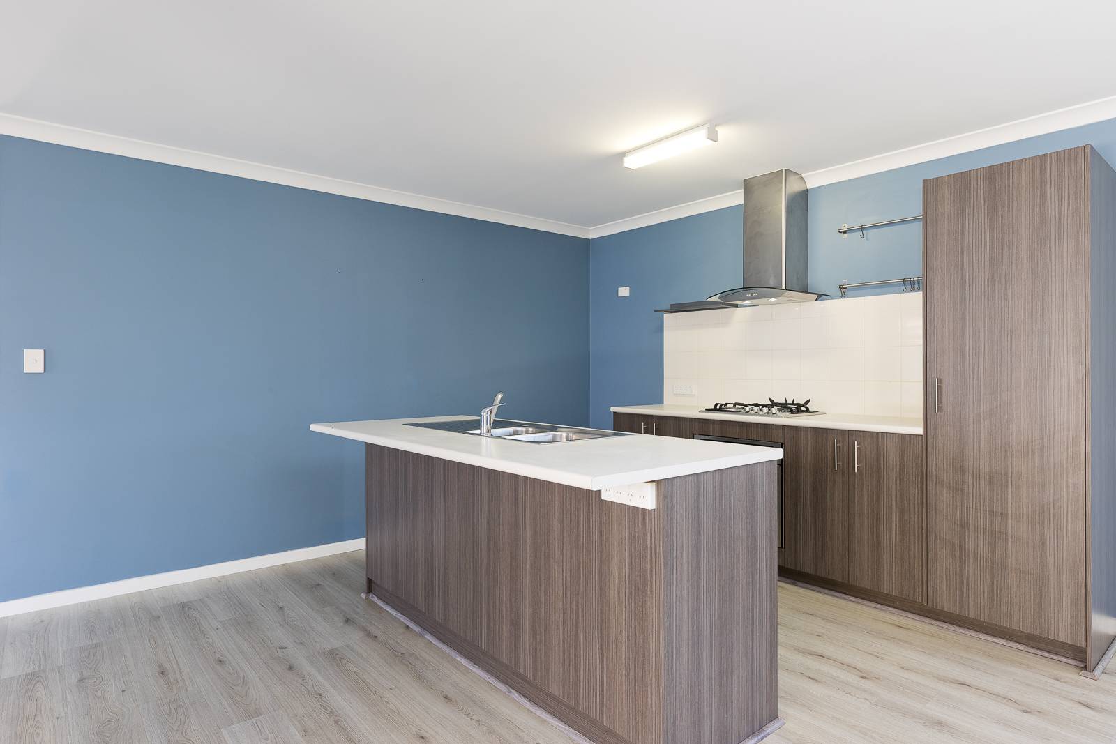 • Kitchen boasting a large fridge recess, pantry, tiled splashback, oven, gas cooktop, rangehood, and a kitchen island inclusive of a breakfast bench