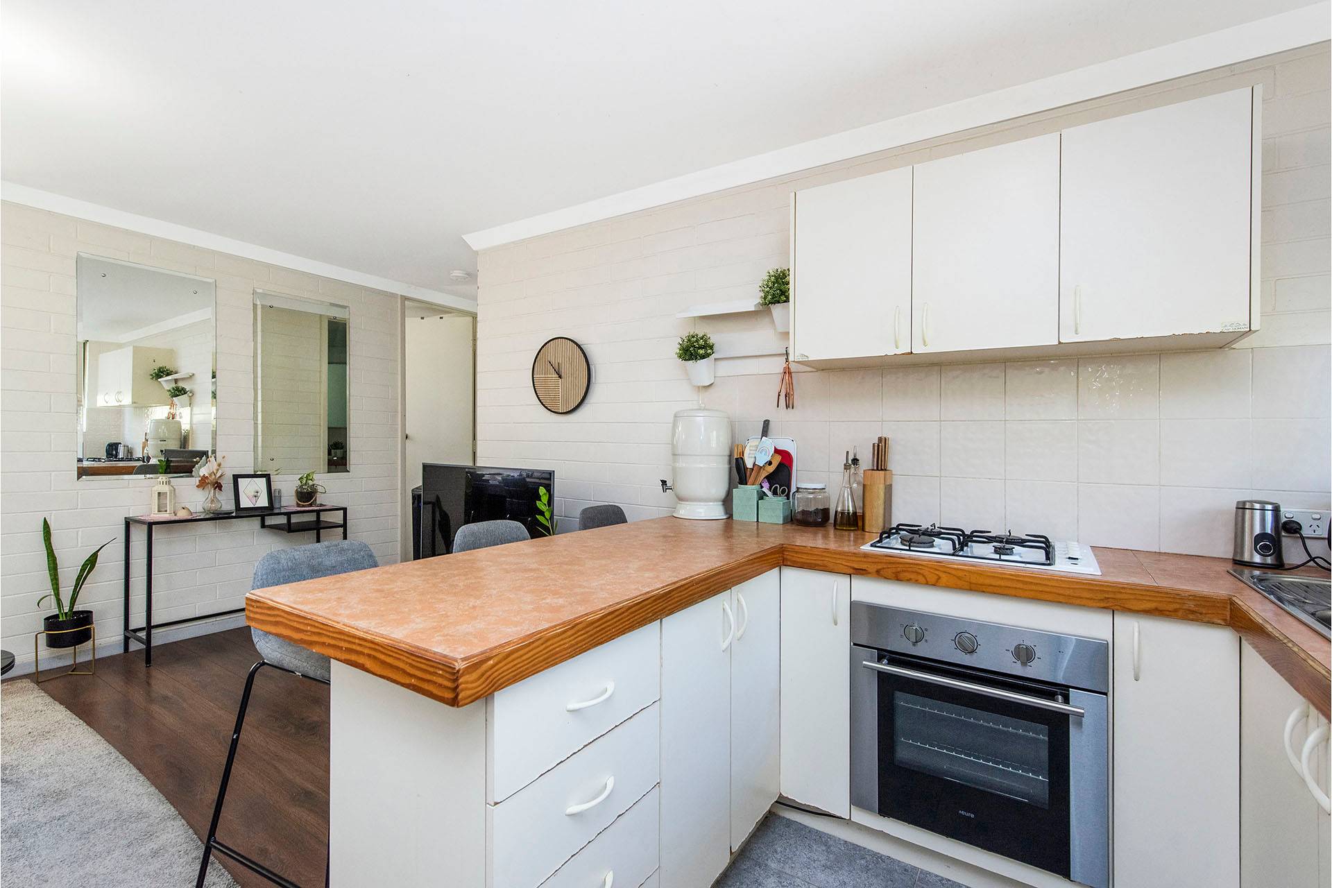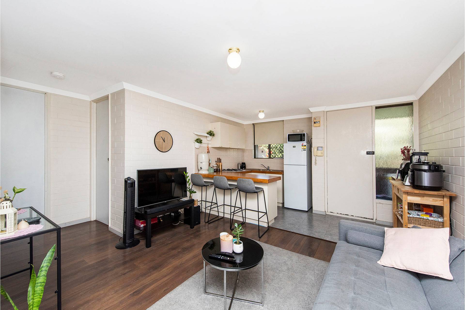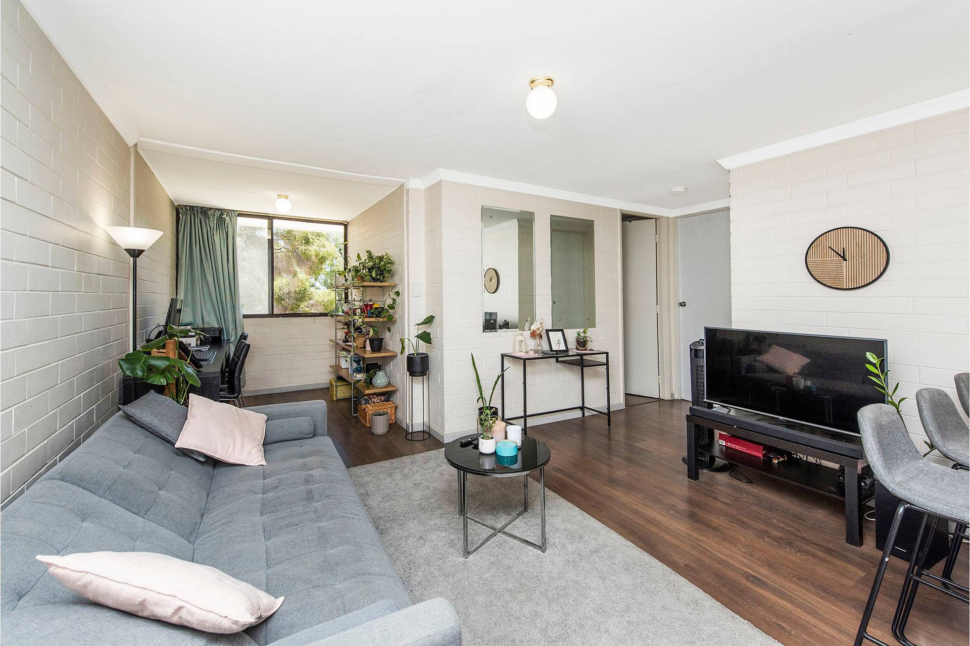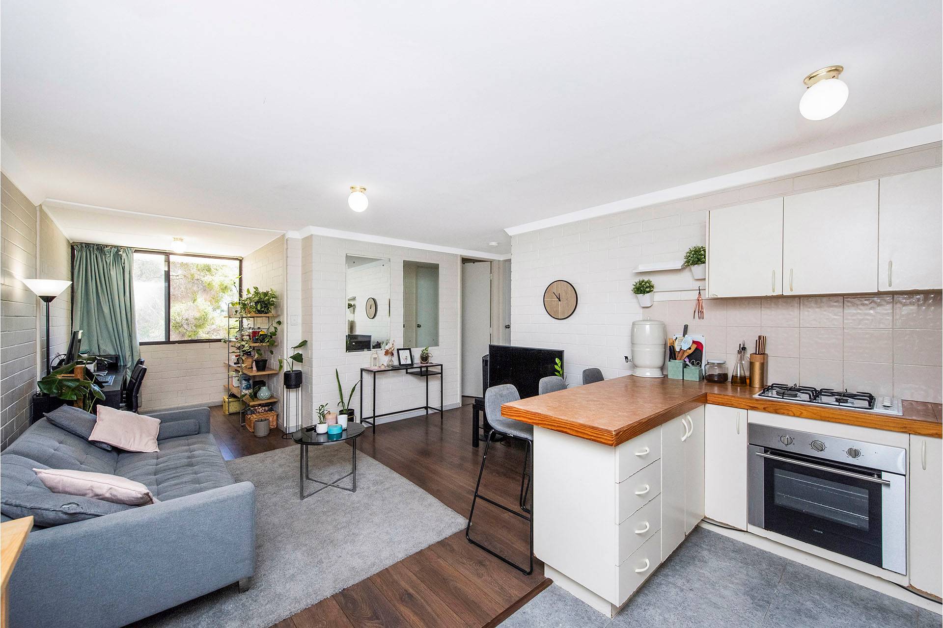 Featuring timber finish flooring, it offers two goodsize bedrooms serviced by a central bathroom/laundry, spacious open plan lounge/living with separate dining or study, kitchen/meals with plenty of bench and cupboard space.