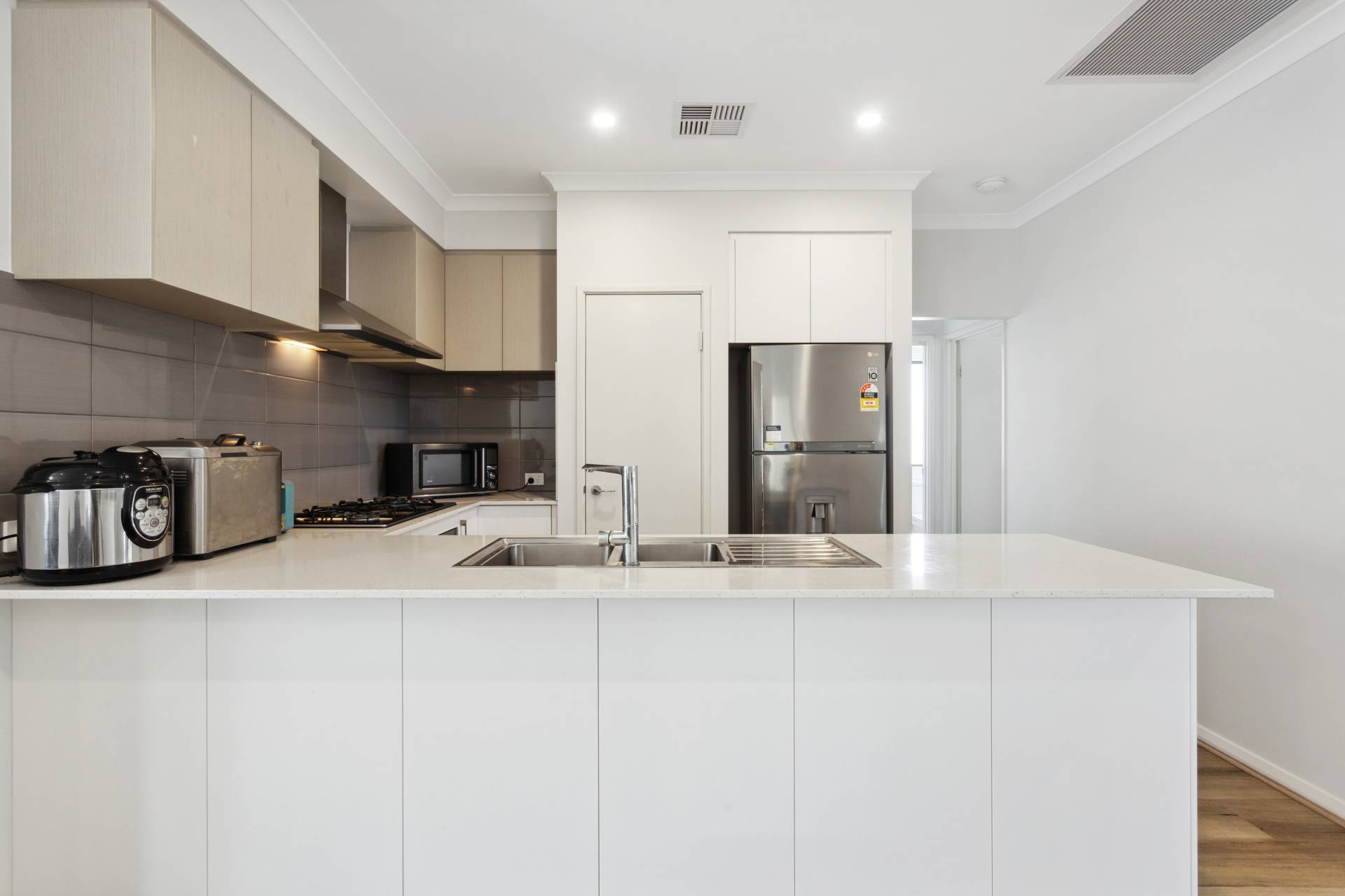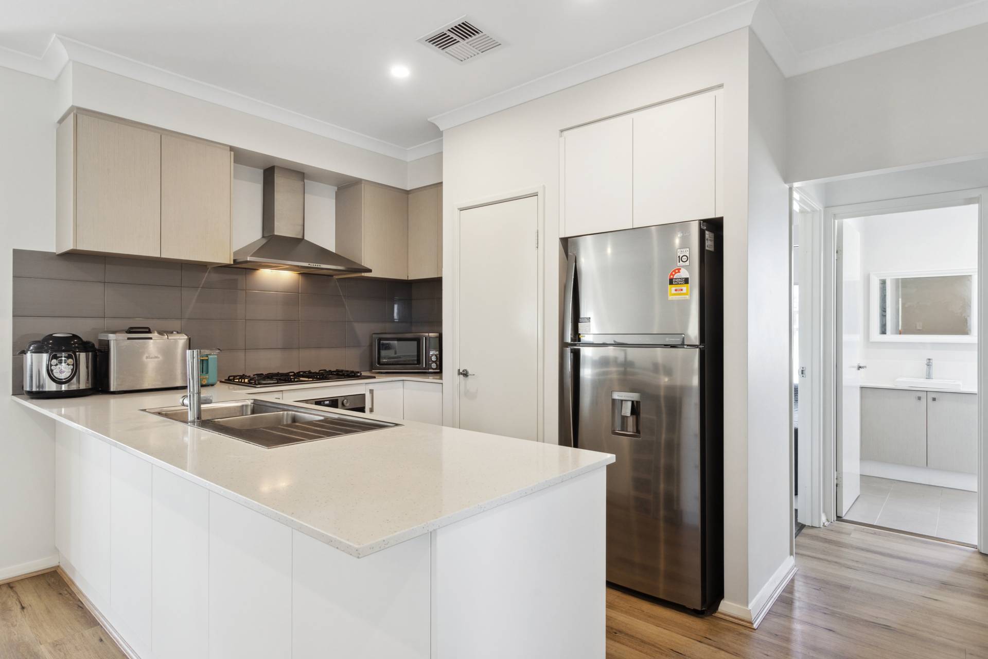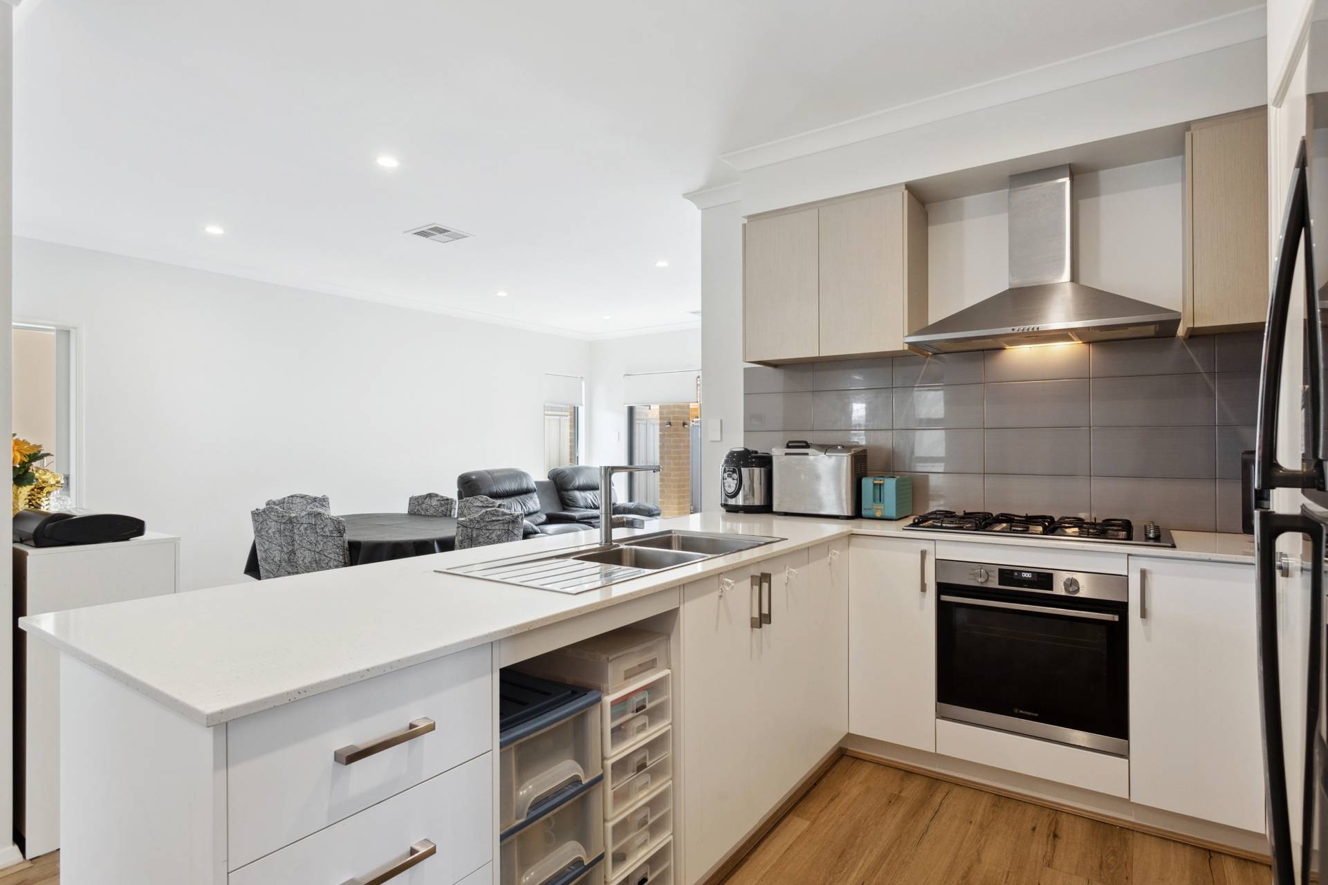 Contemporary two-tone rendered elevation with Colorbond roof, double remote garage and attractive, easy-care reticulated gardens. With 31 course ceilings to kitchen, living and dining, open plan living and dining space, with alfresco area under the main roof. Sleek kitchen with EssaStone bench tops, quality stainless steel appliances, tiled splash back and plenty of overhead cabinets. Spacious master suite with walk-in robes, large ensuite with shower, vanity and EssaStone bench tops