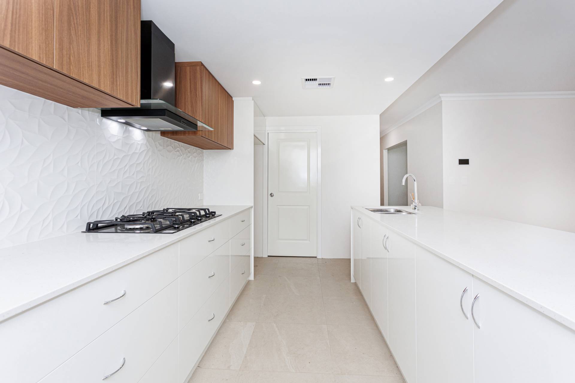 Galley-style kitchen with black glass 900mm appliances